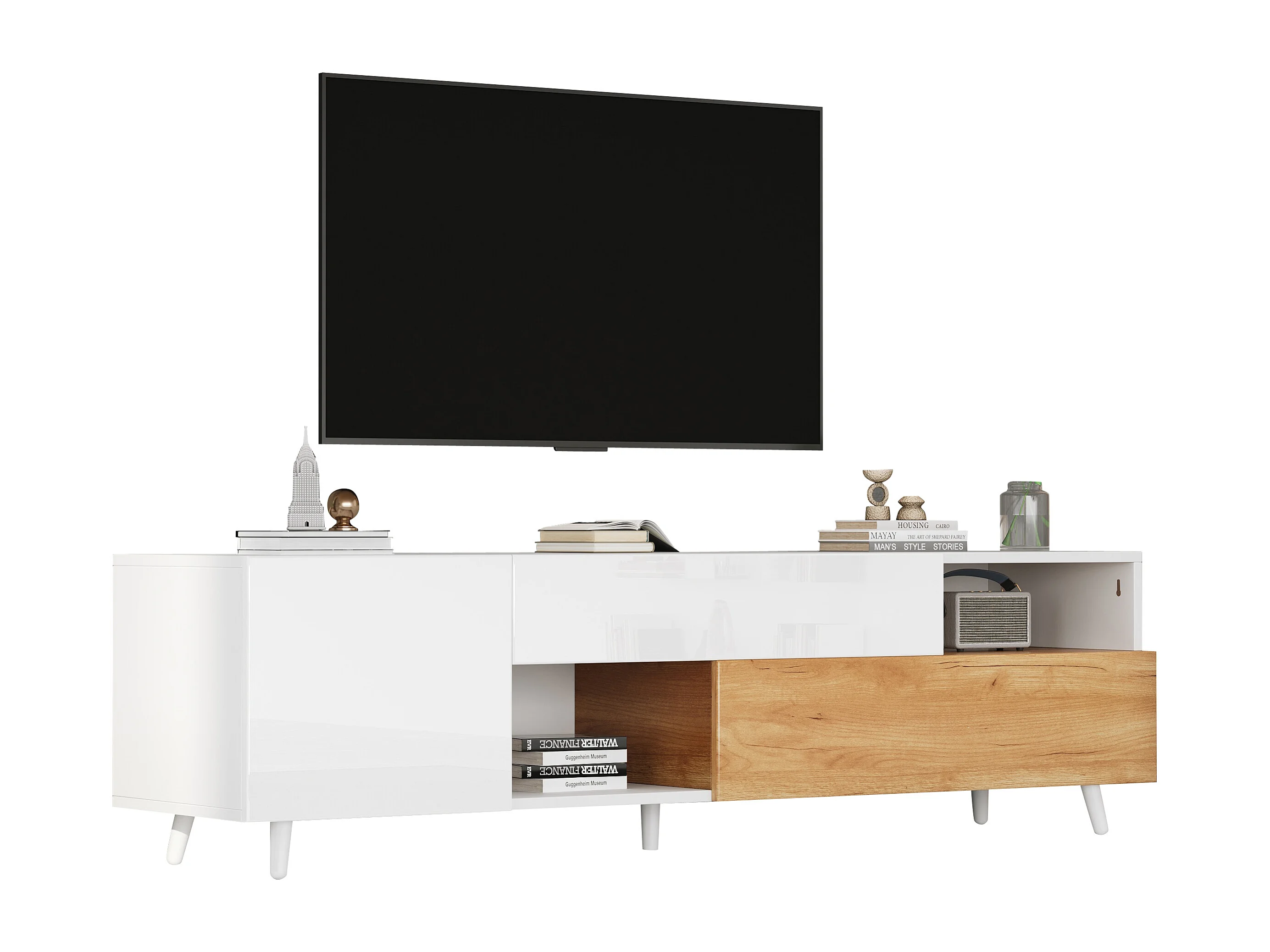 Meuble TV 180x38x50 cm, rangement multiple, façade brillante, panneau de particules, blanc et bois naturel