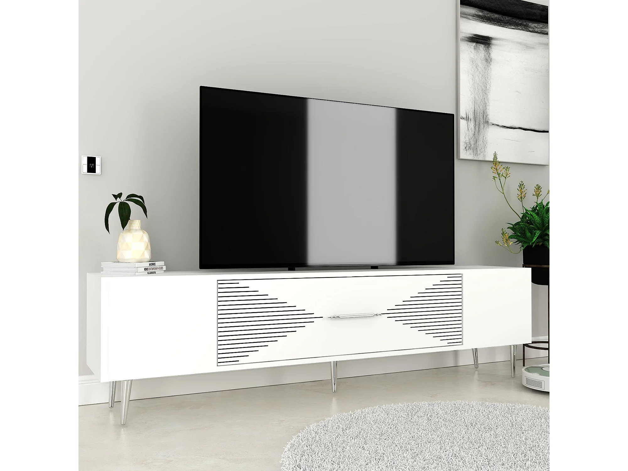 Meuble Tv design 1 porte basculante Steli L150cm Blanc et Argent