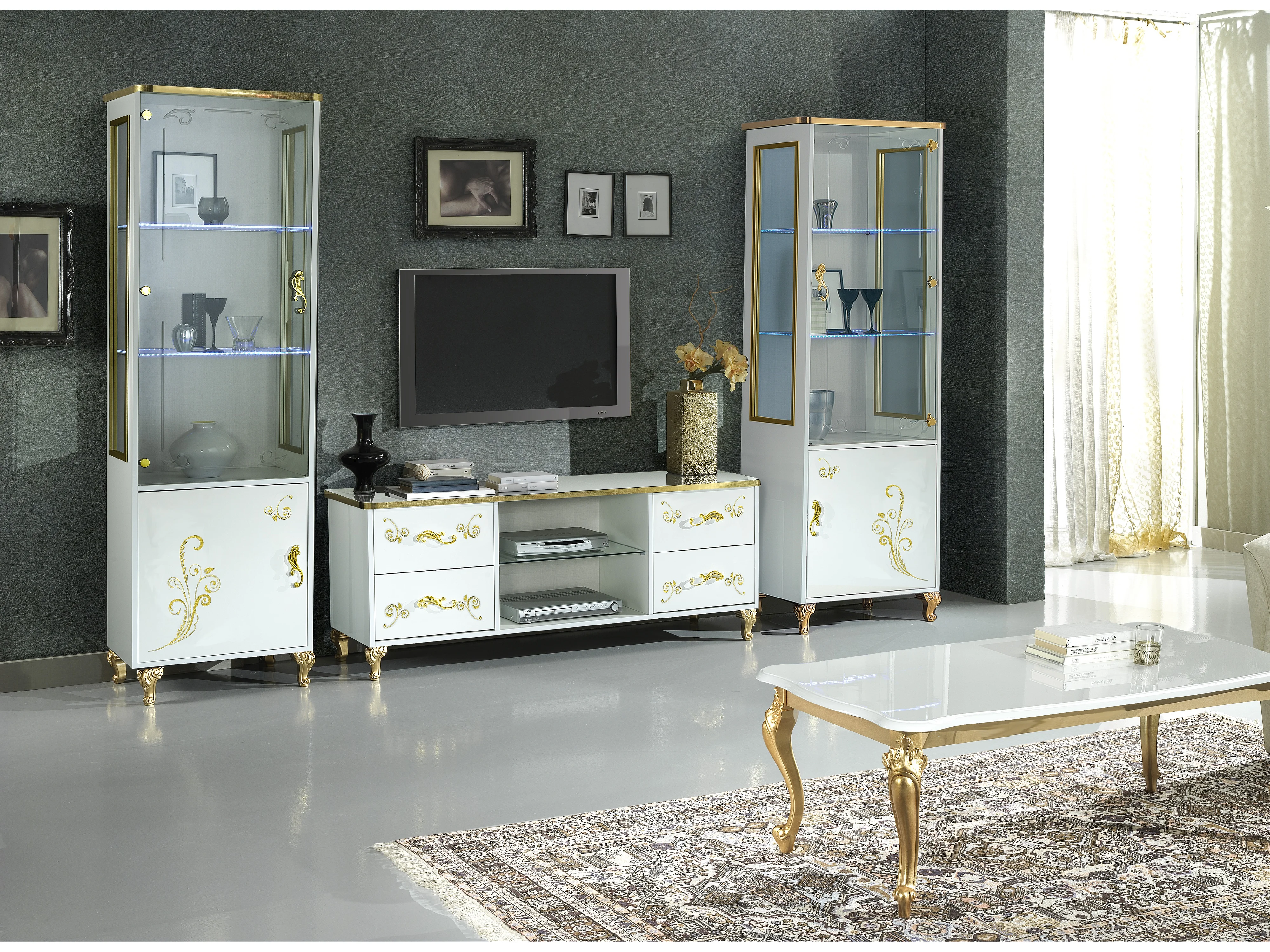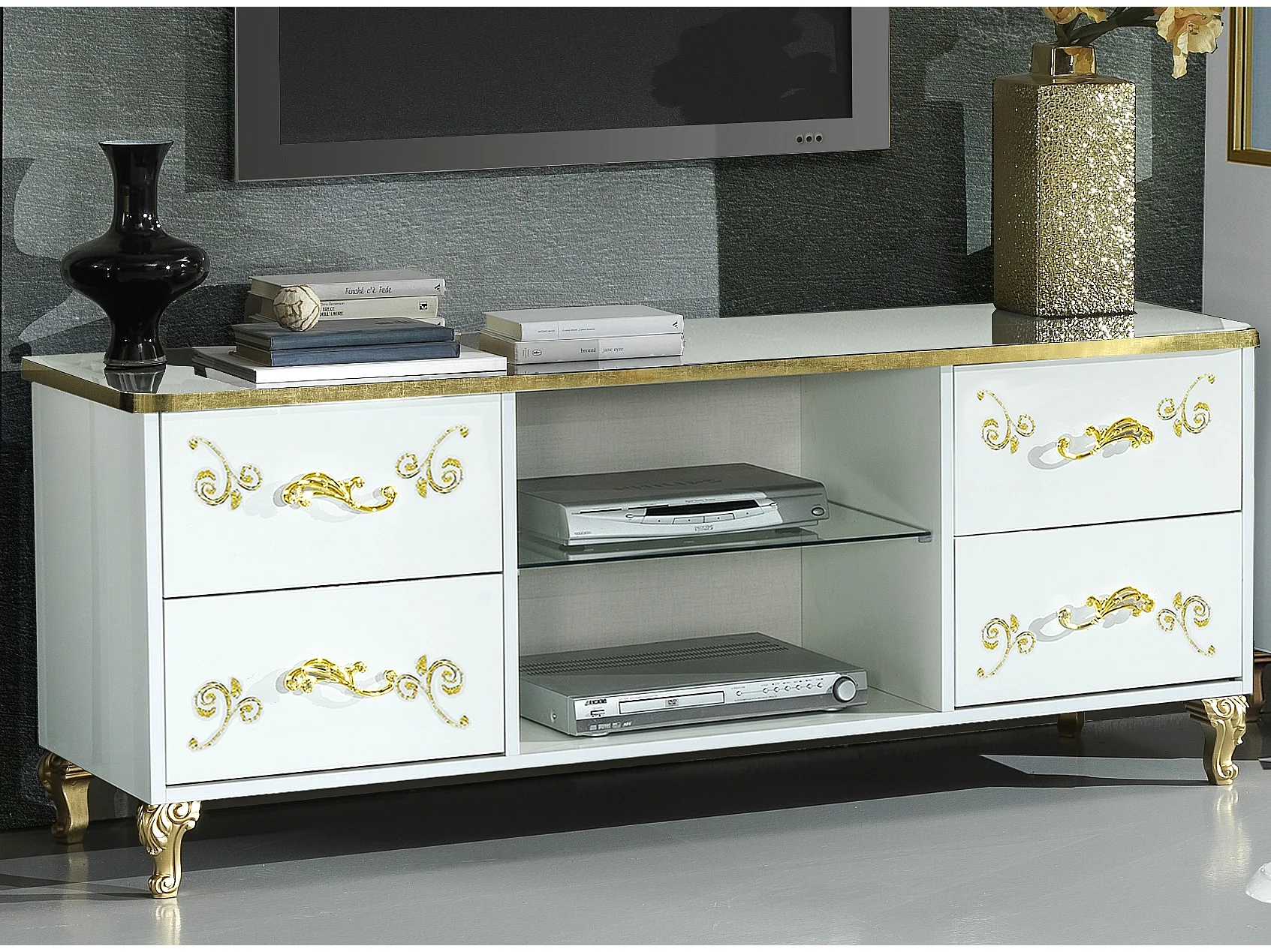 Meuble TV design bois vernis brillant blanc et doré Jade 160cm