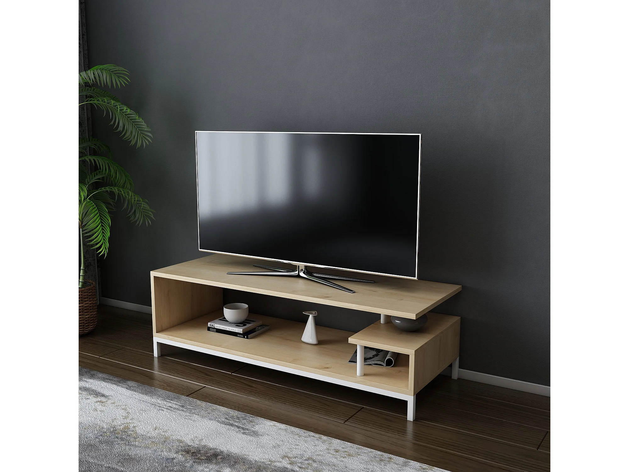 Meuble Tv design Kyrisa L120cm Métal Blanc et Bois Chêne clair