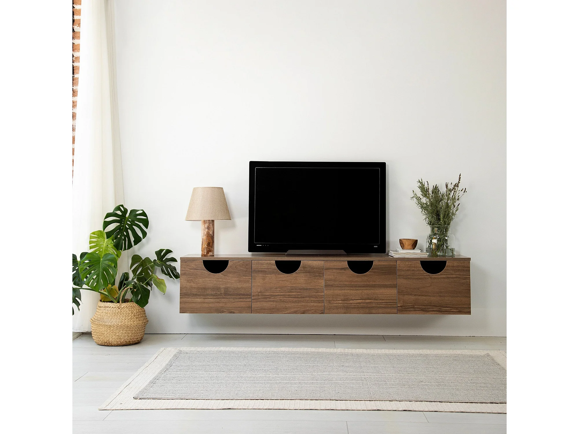 Meuble TV moderne en noyer, 135 cm | Panneau de particules 100 % mélaminé, épaisseur 18 mm | Fixation murale, plusieurs étagères, design élégant et fonctionnel