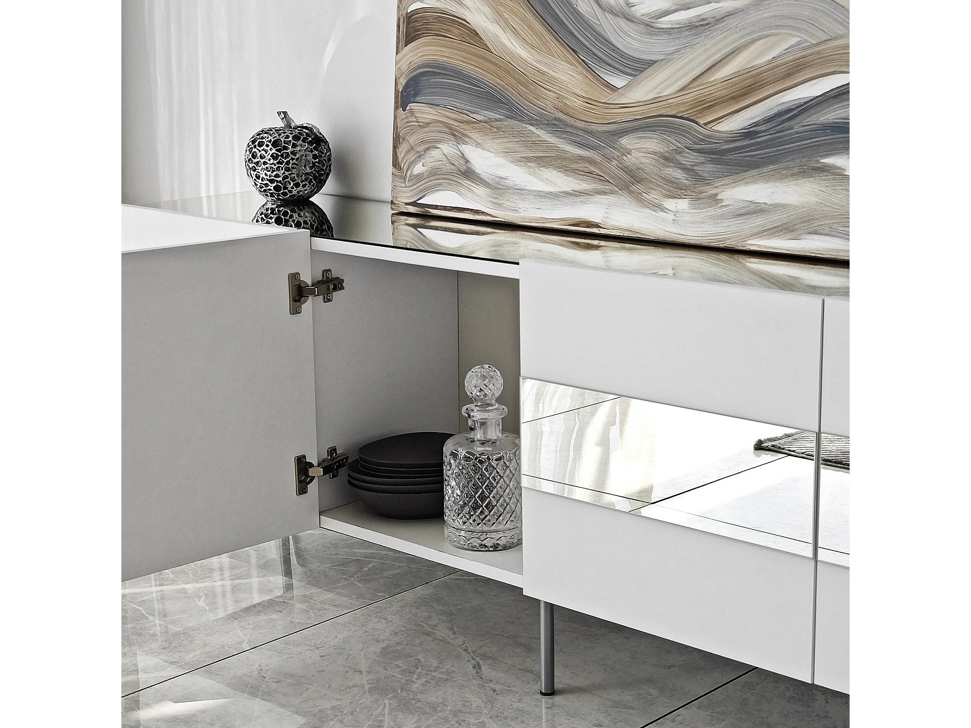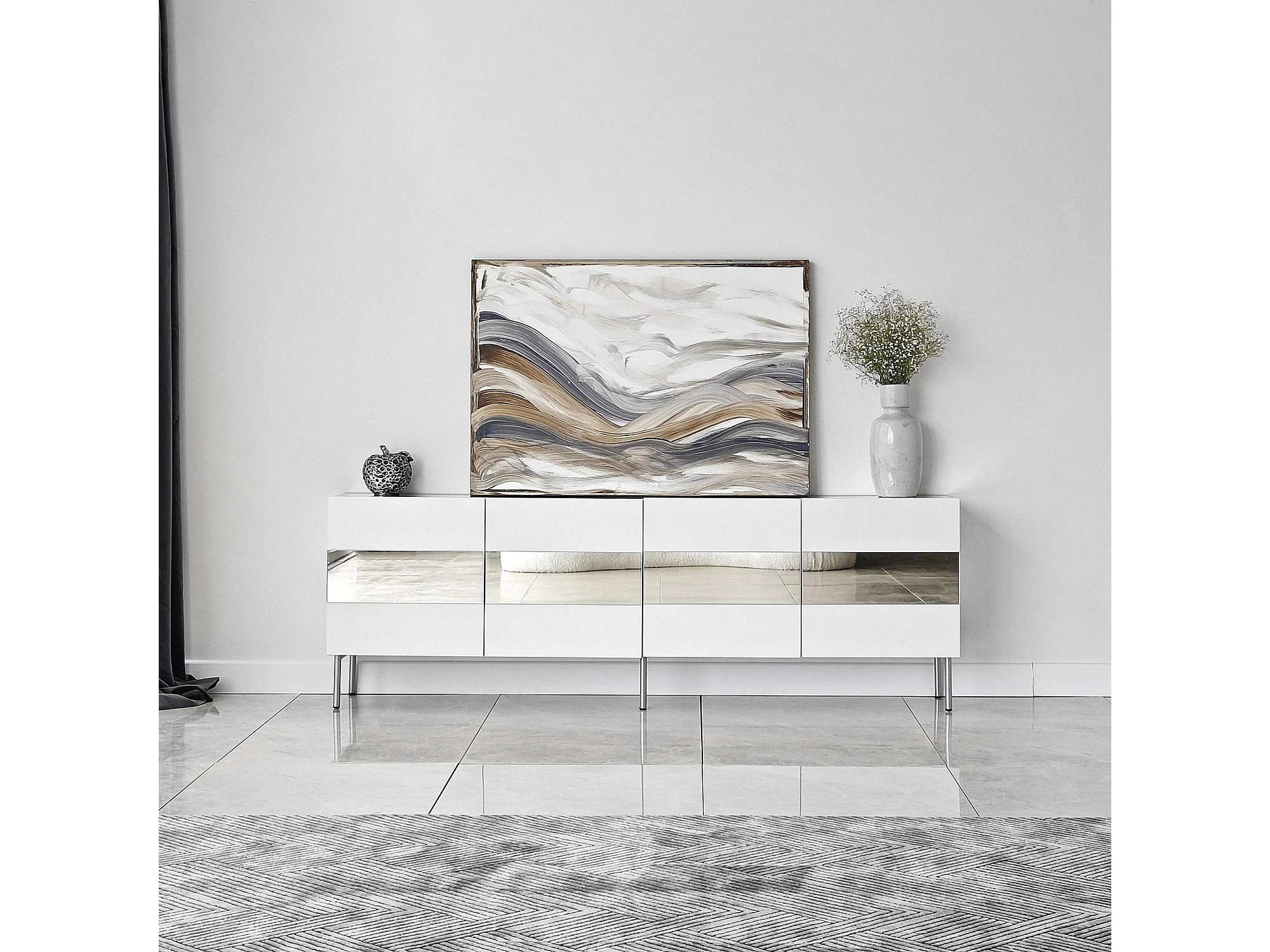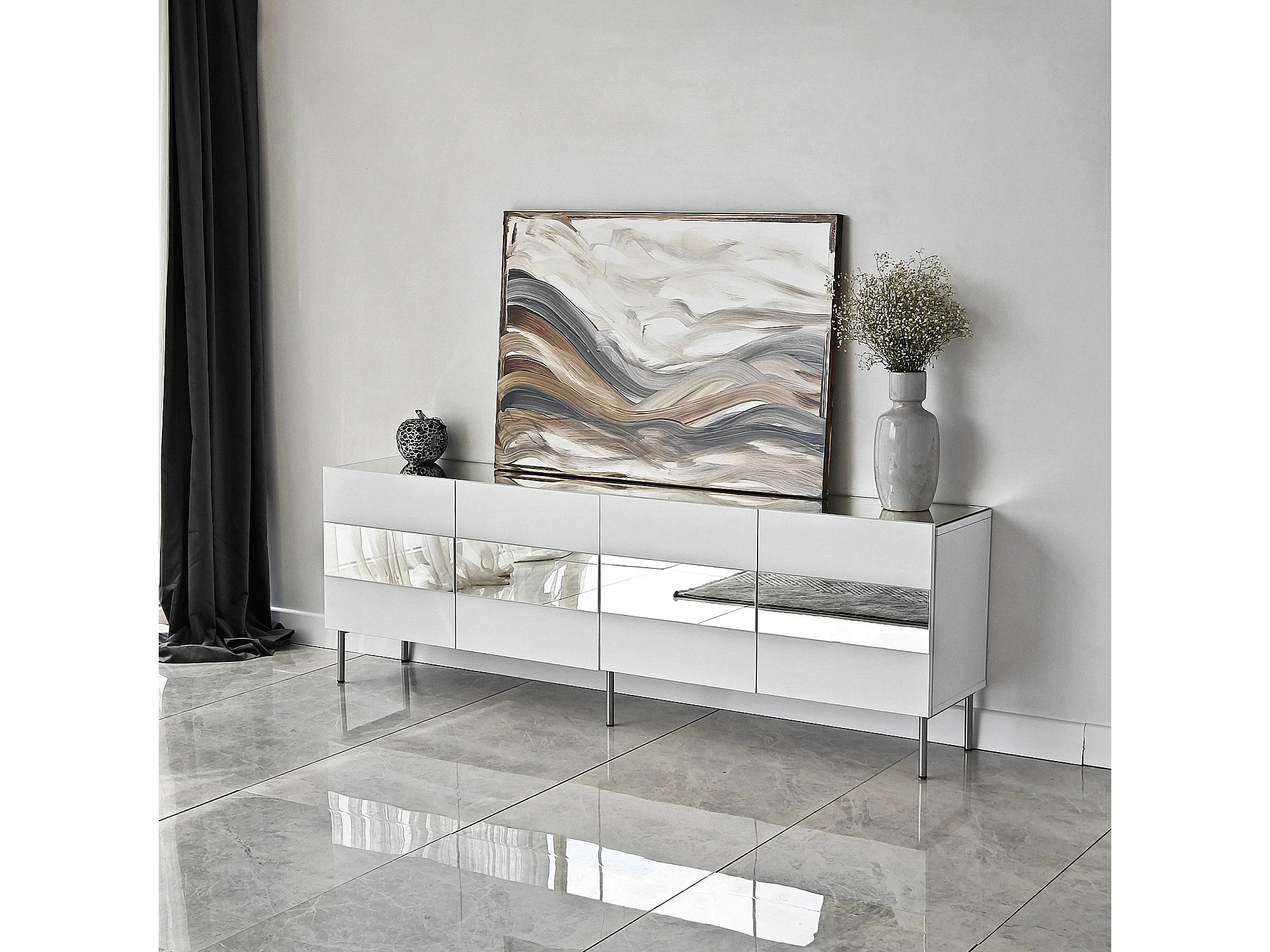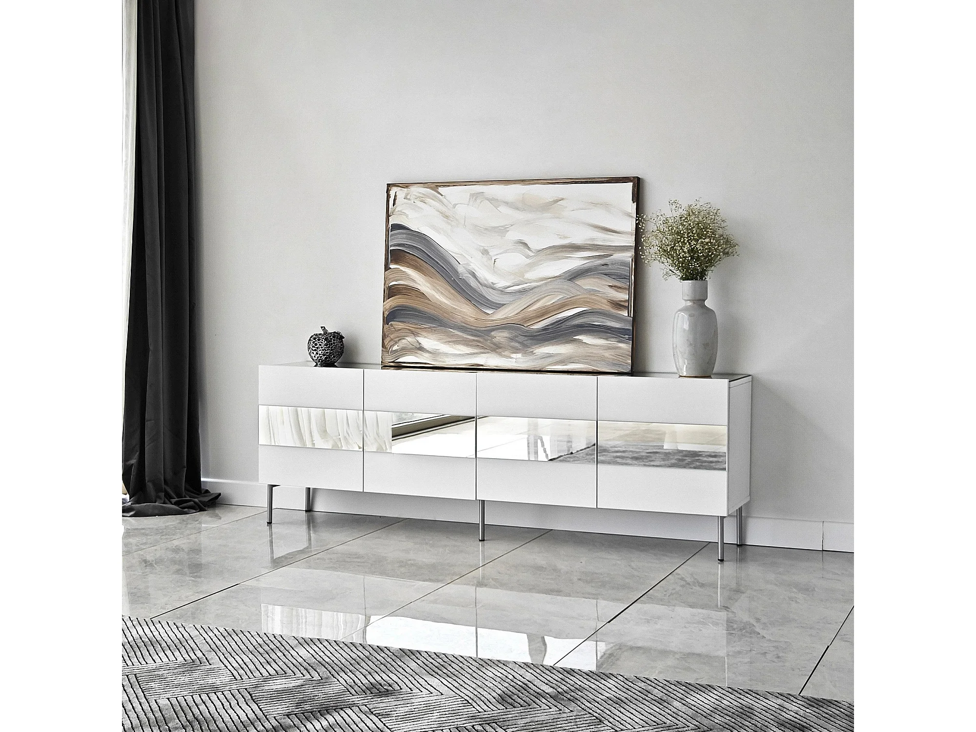 Meuble TV élégant, largeur 180 cm, blanc et argent | Panneau de particules 100 % mélaminé, épaisseur 18 mm | Design moderne pour salons et espaces de divertissement