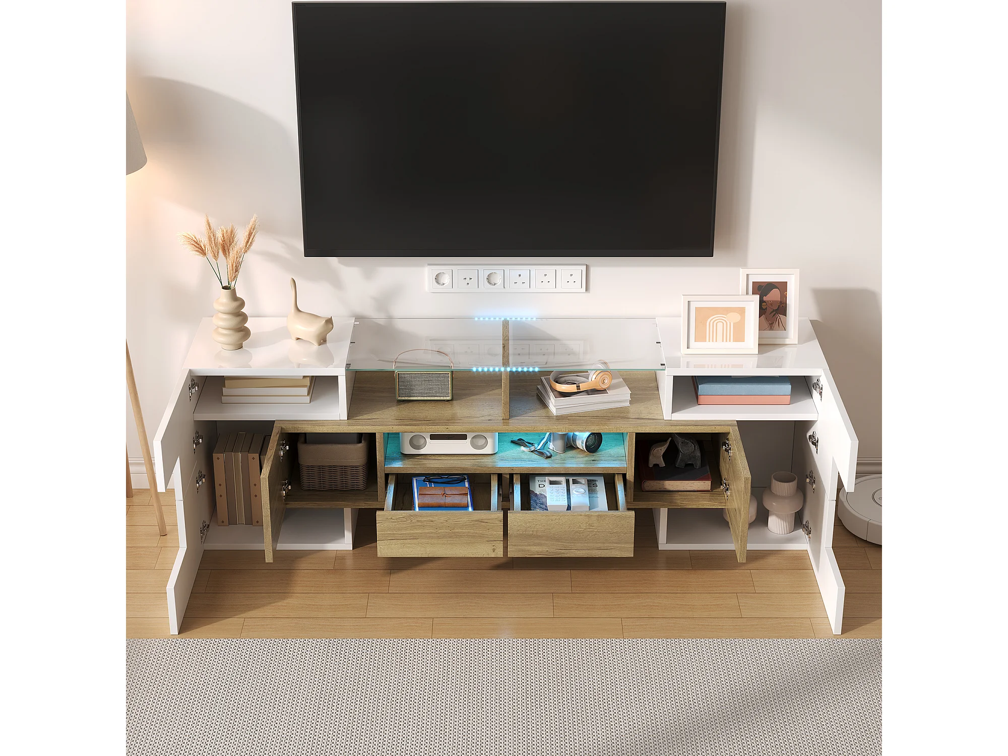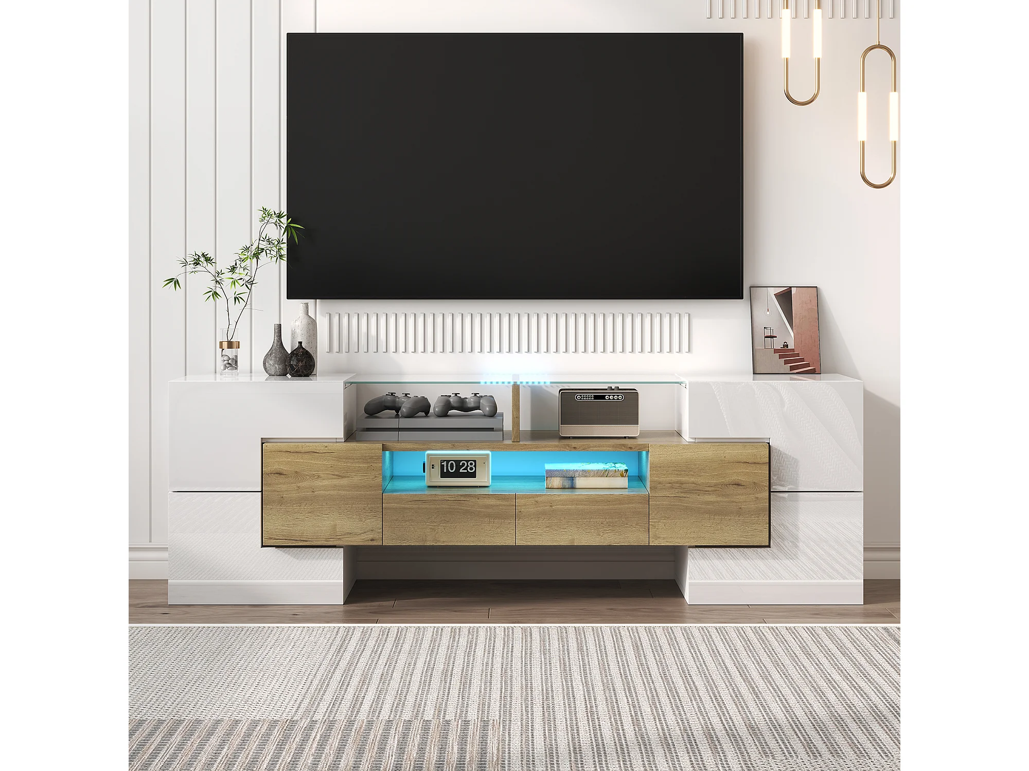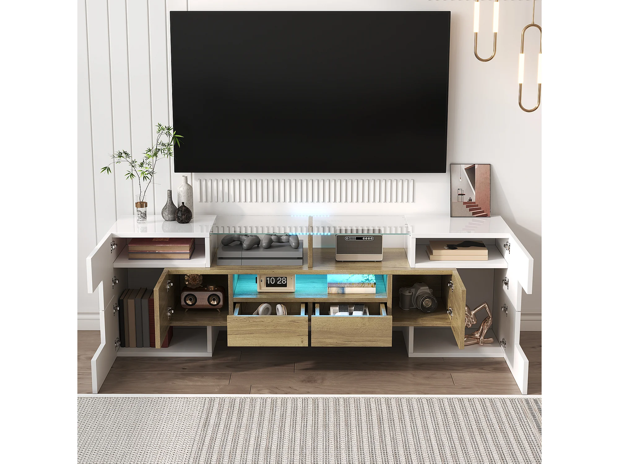 Meuble TV élégant, Lowboard, blanc laqué, 145 cm, éclairage LED, meuble pour salon, design moderne, surface en verre élégante