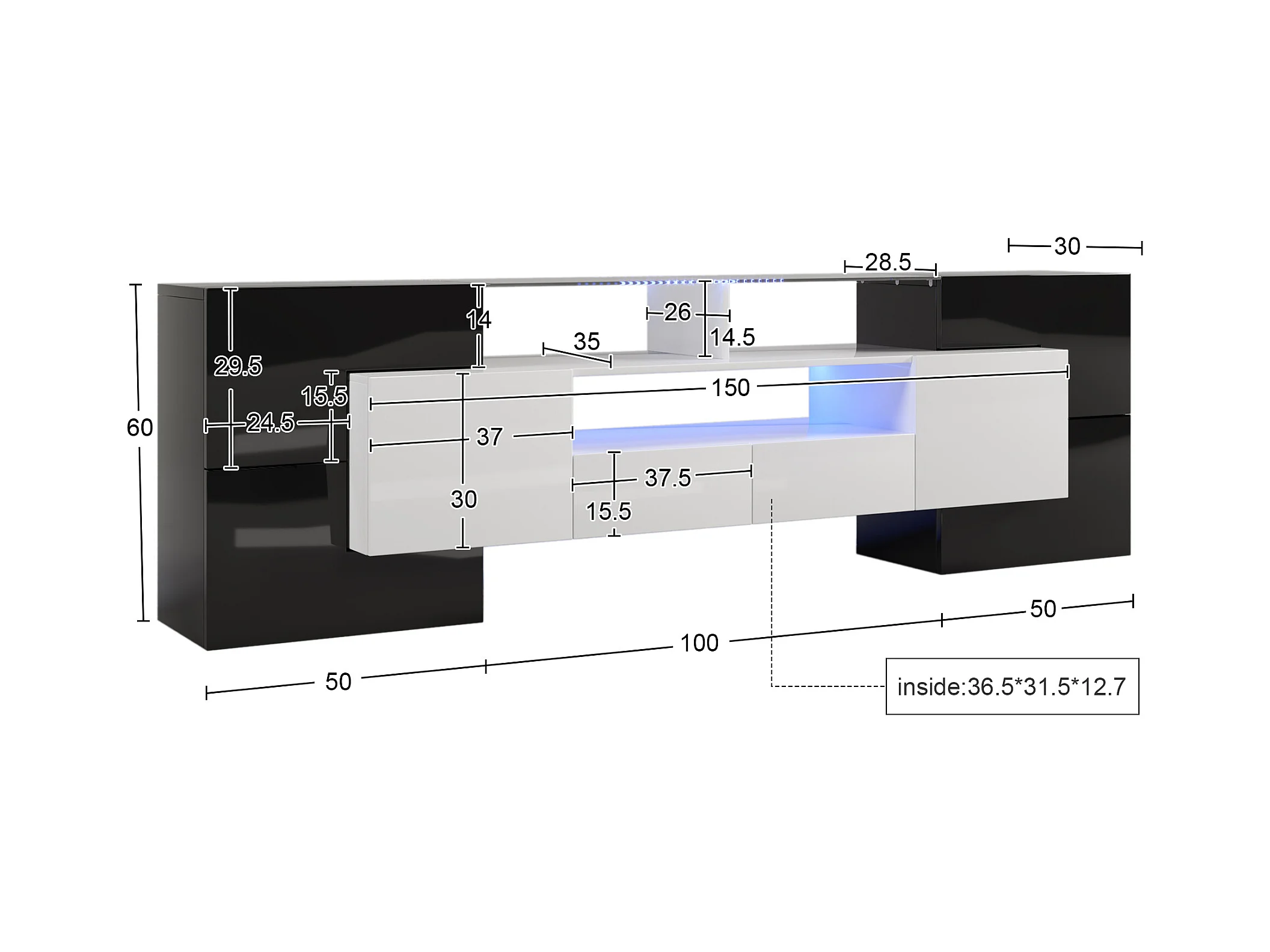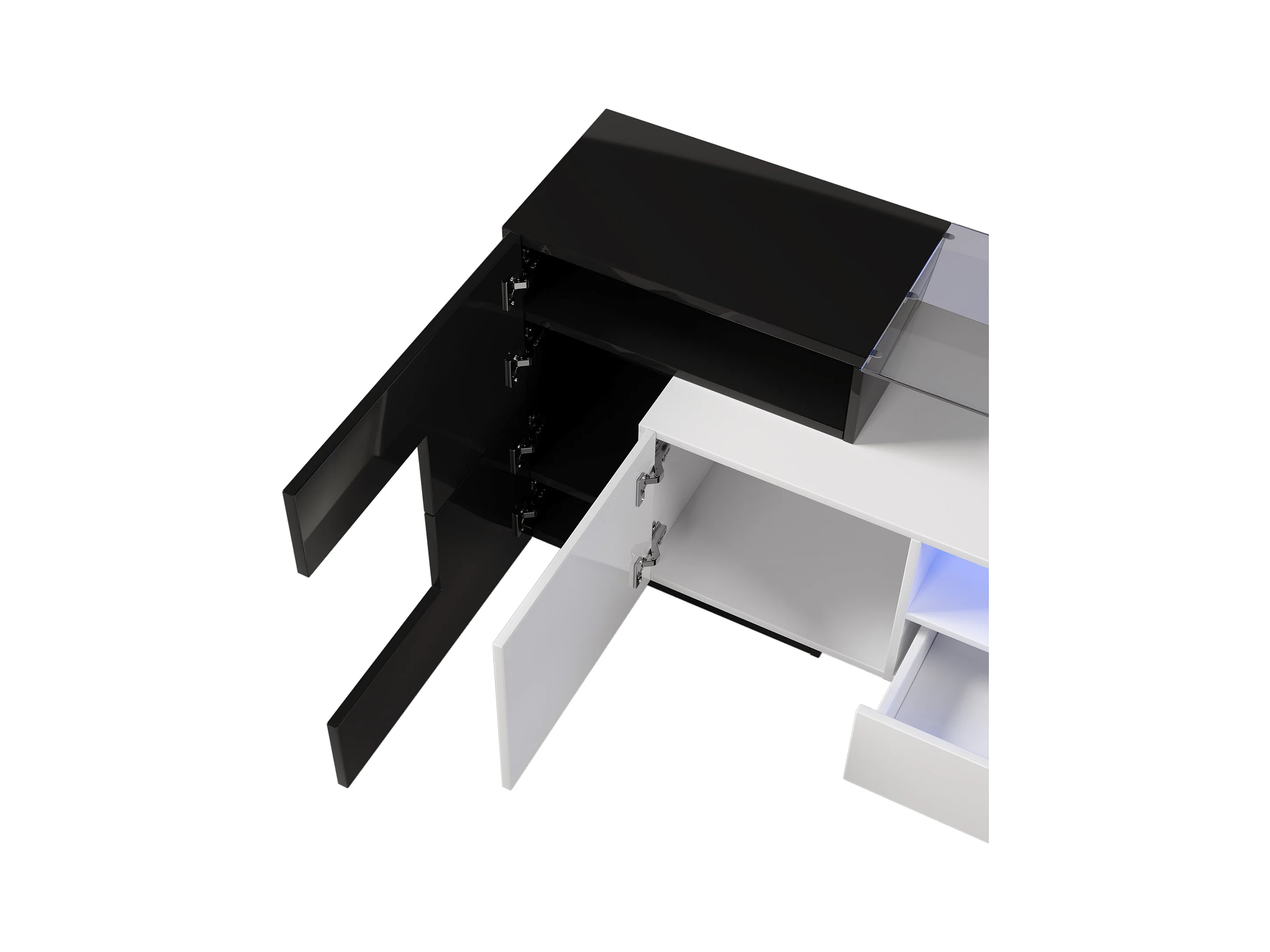 Meuble TV élégant, panneau bas. Meuble de salon à éclairage LED blanc et noir brillant de 200 cm