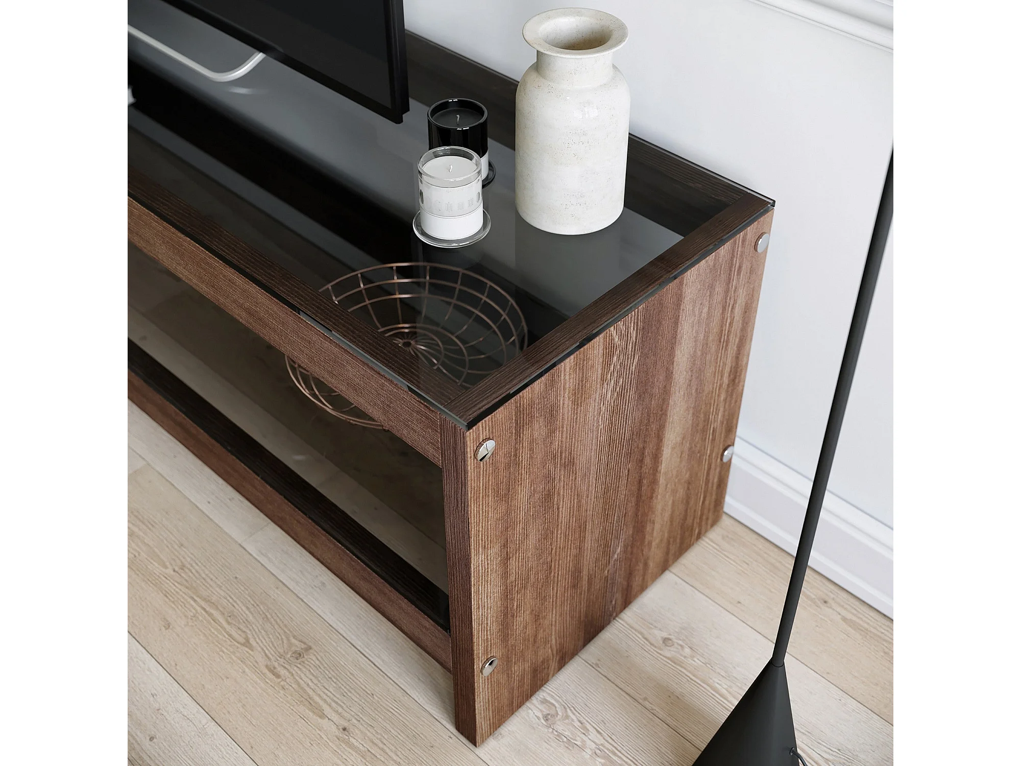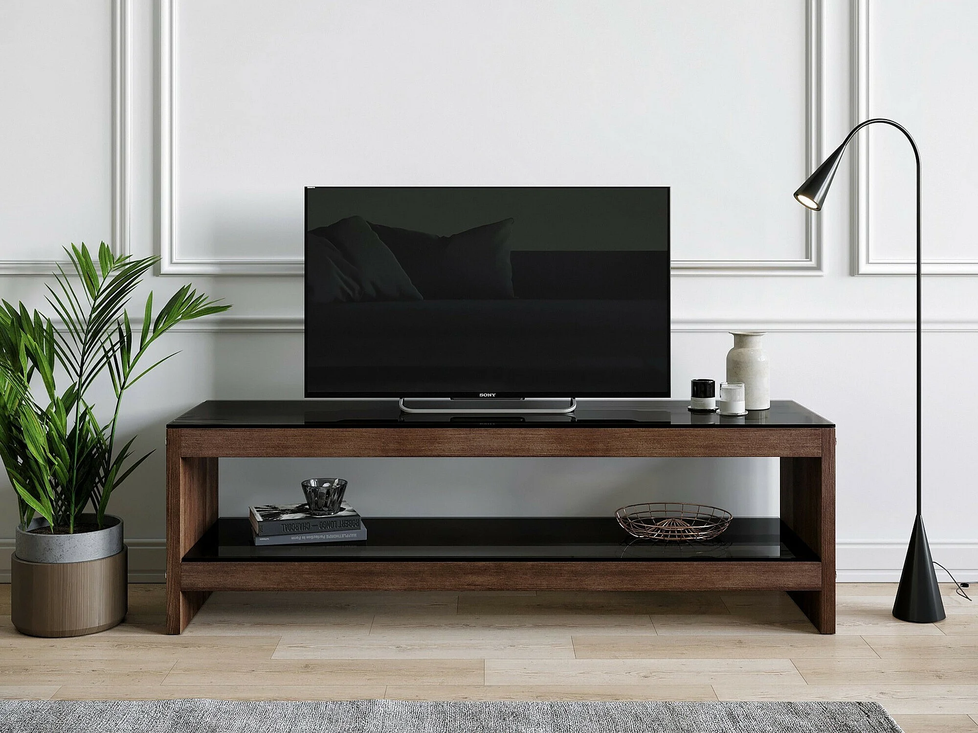 meuble tv en bois 140 cm avec étagères en verre, finition marron