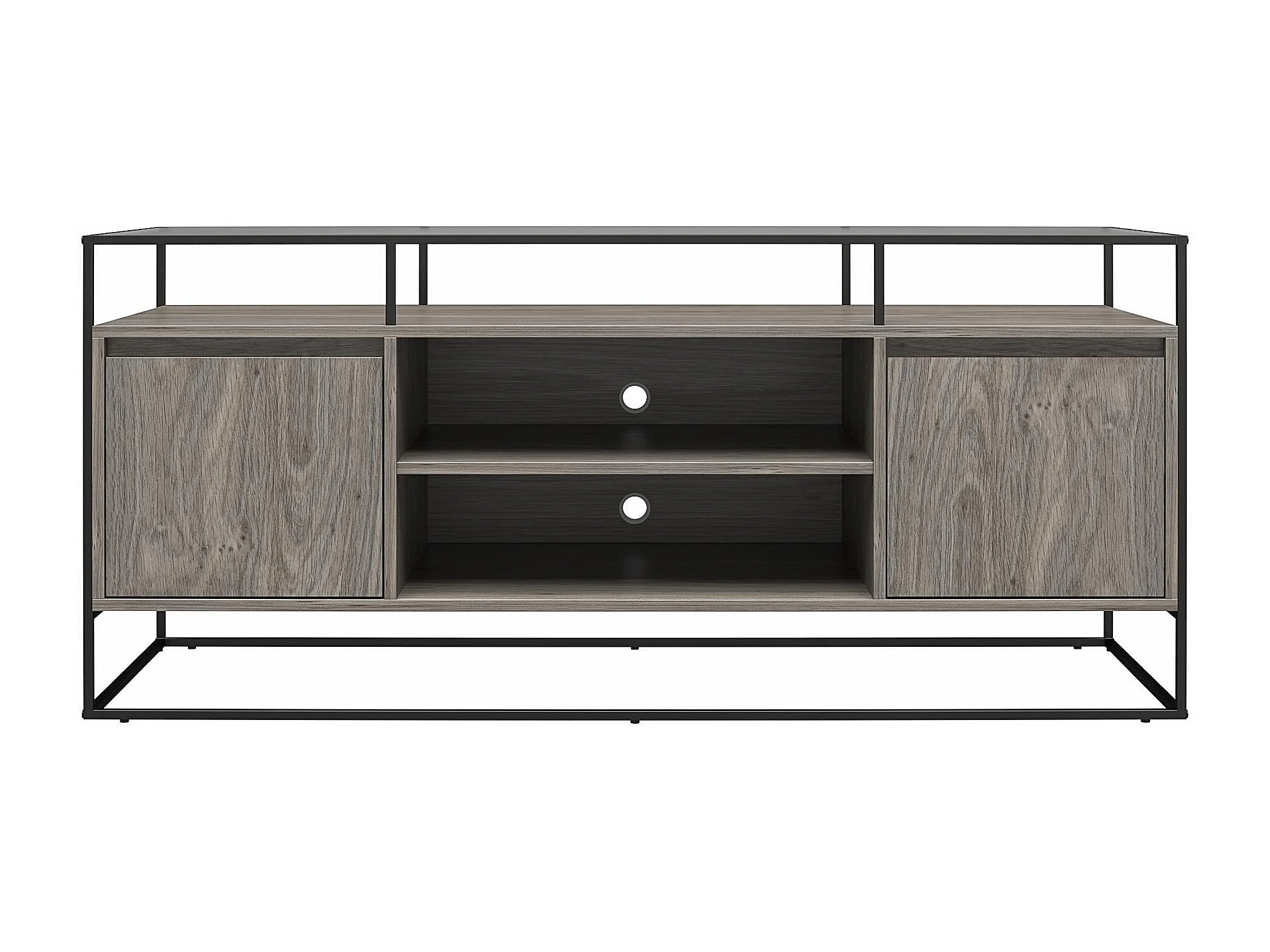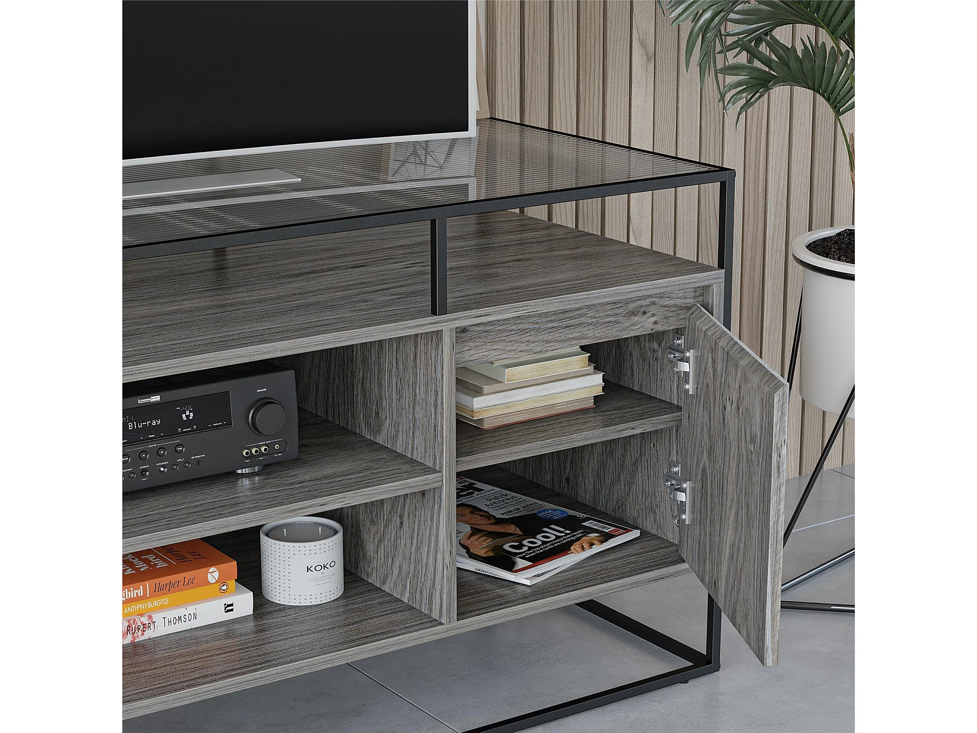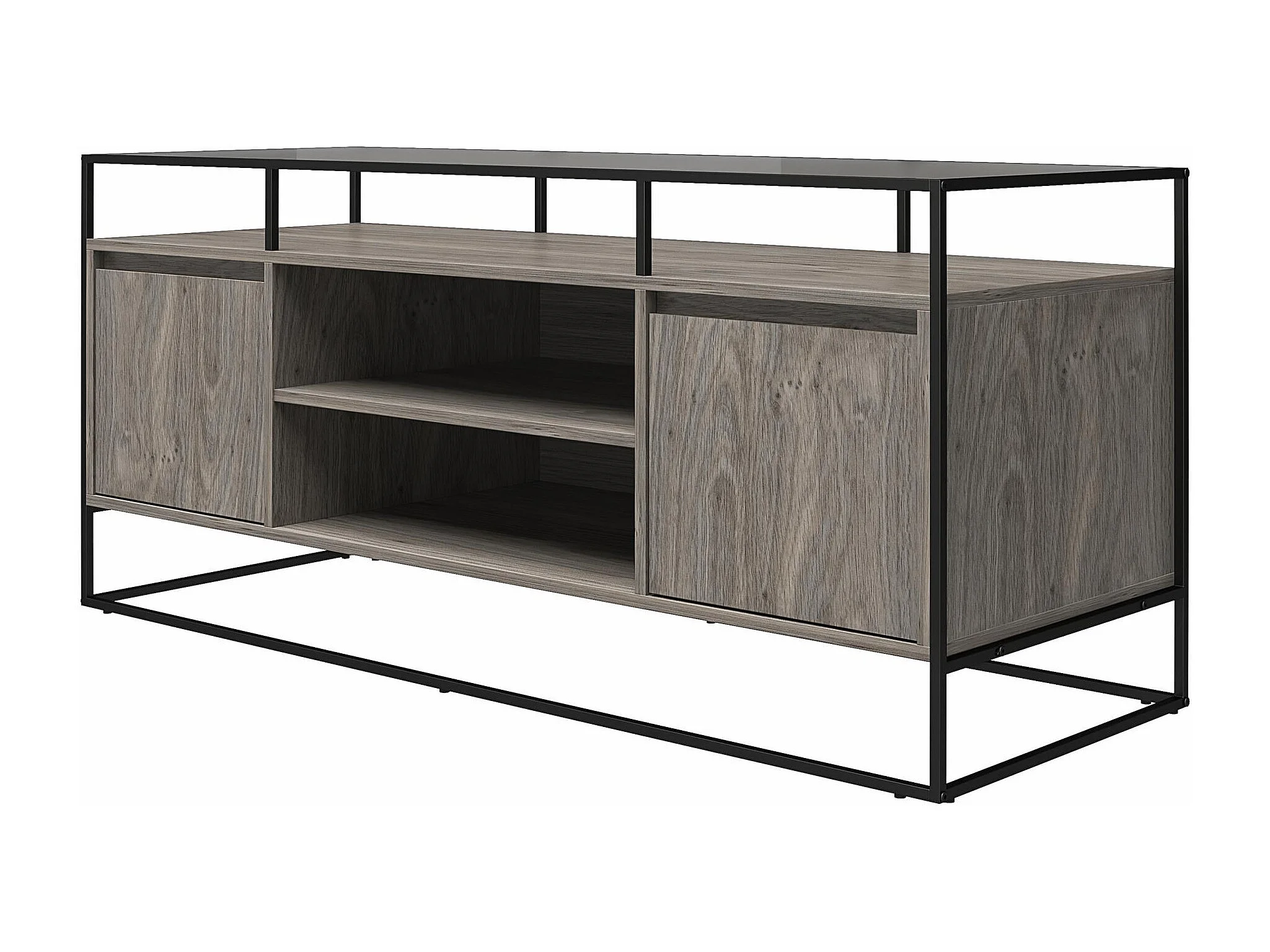 Camley | Meuble TV en verre et piètement en MDF chêne gris