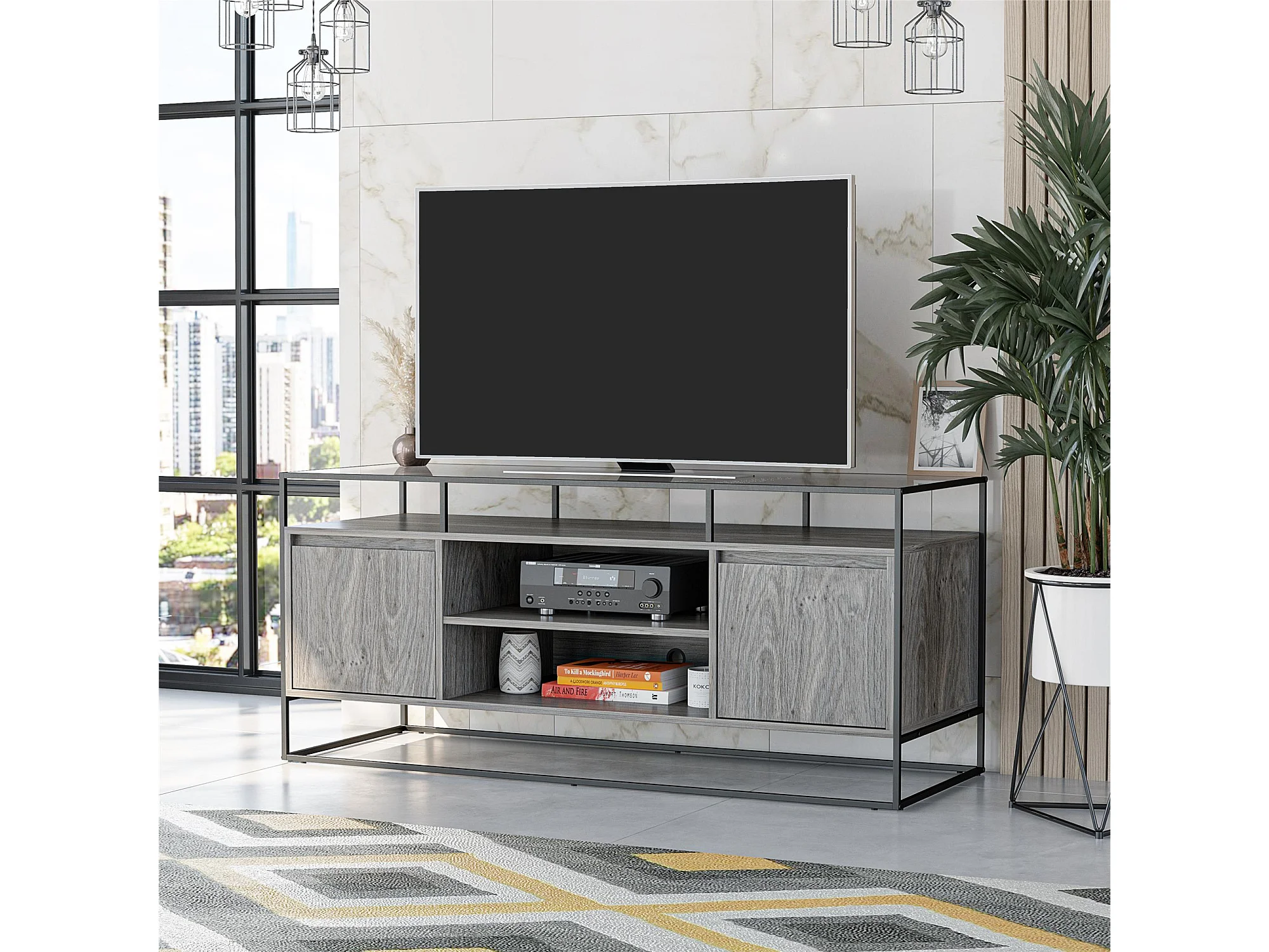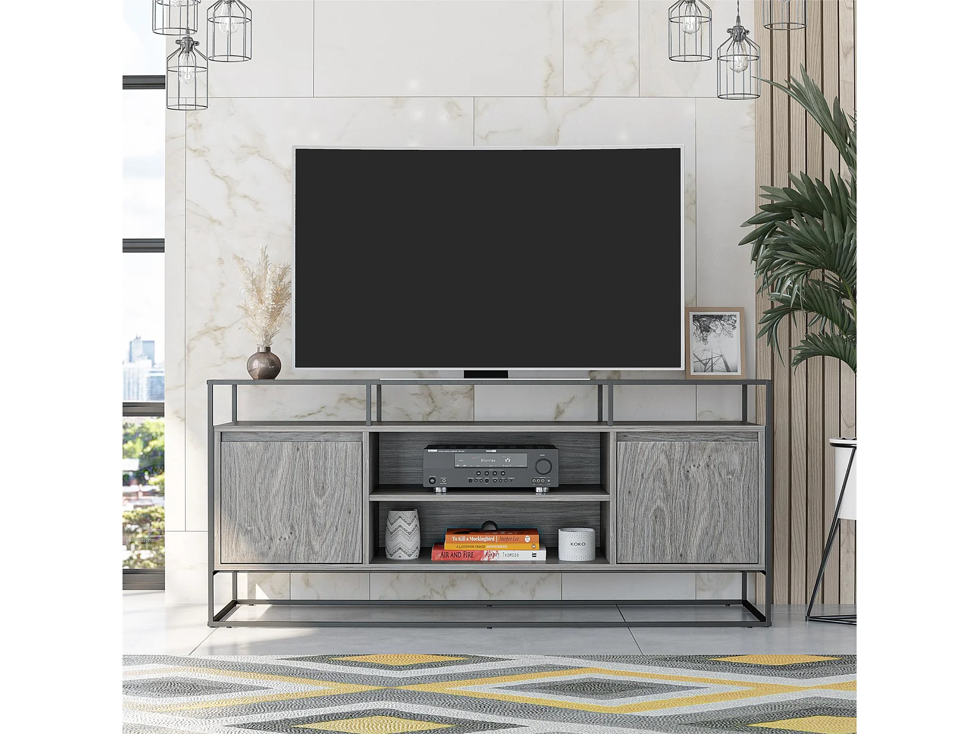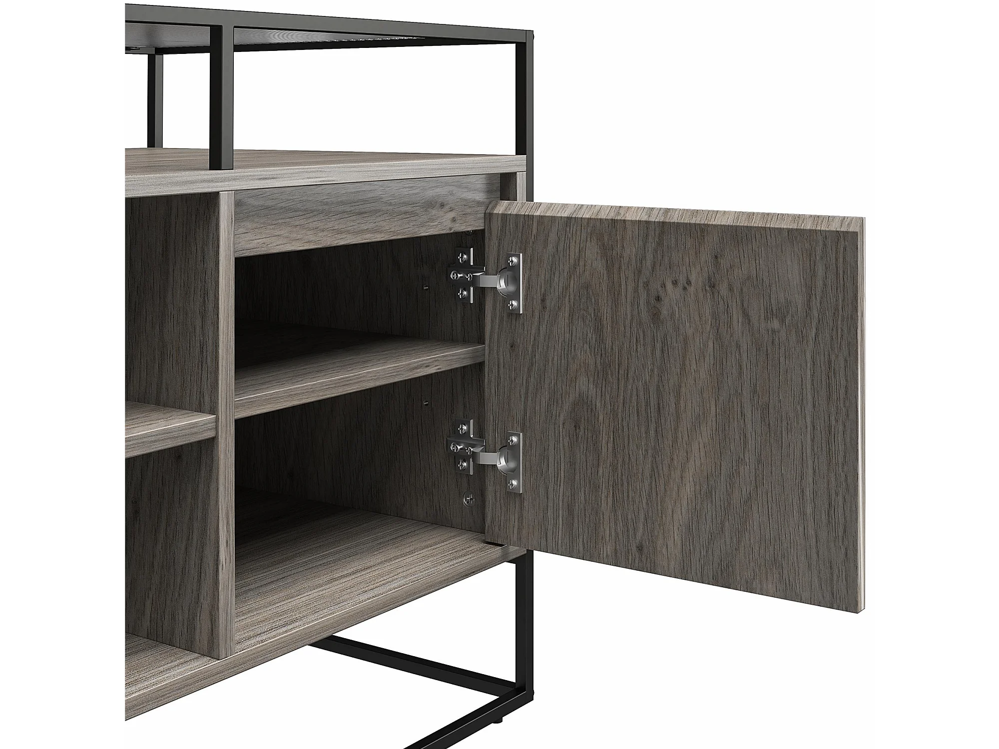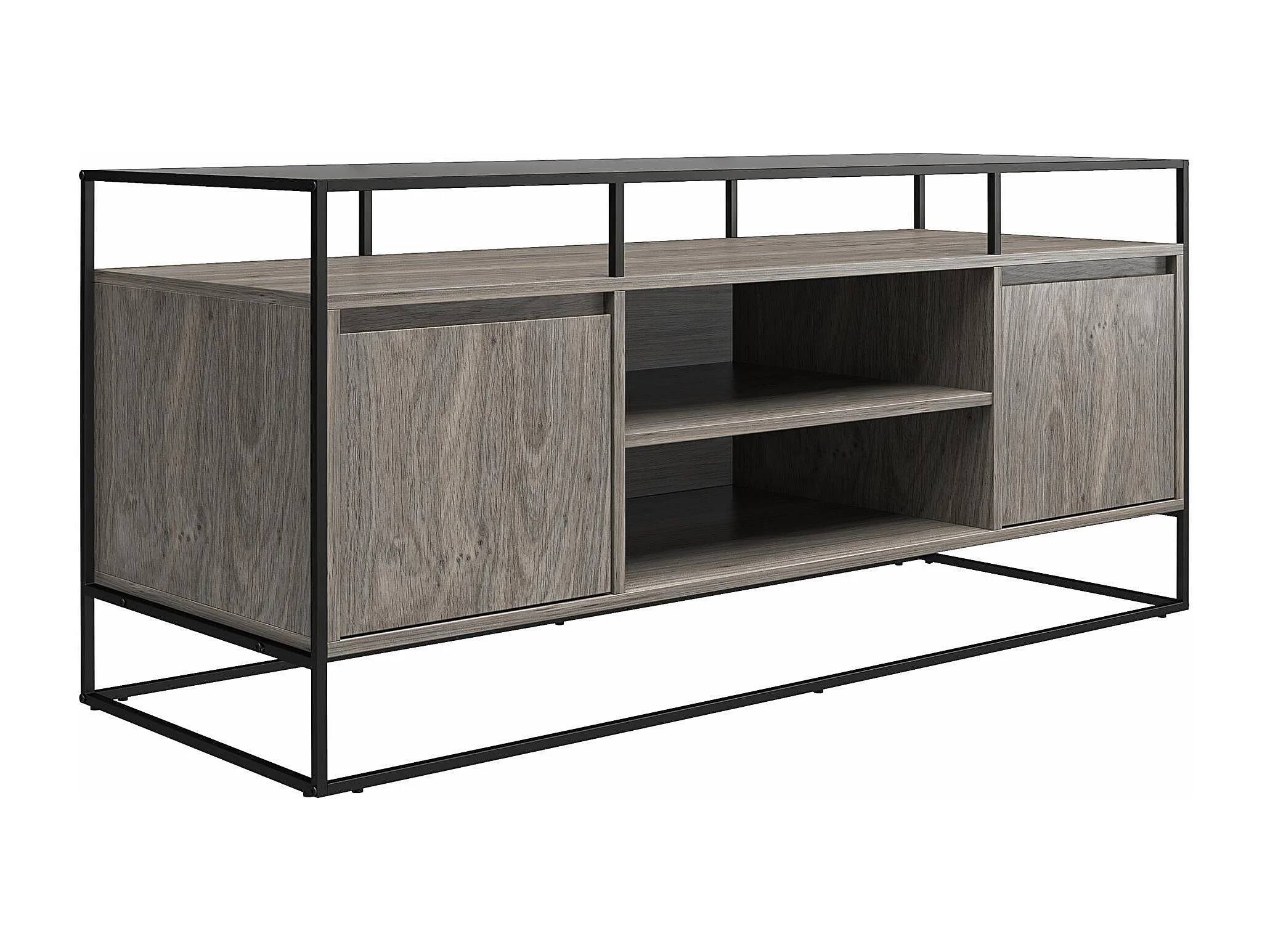 Camley | Meuble TV en verre et piètement en MDF chêne gris
