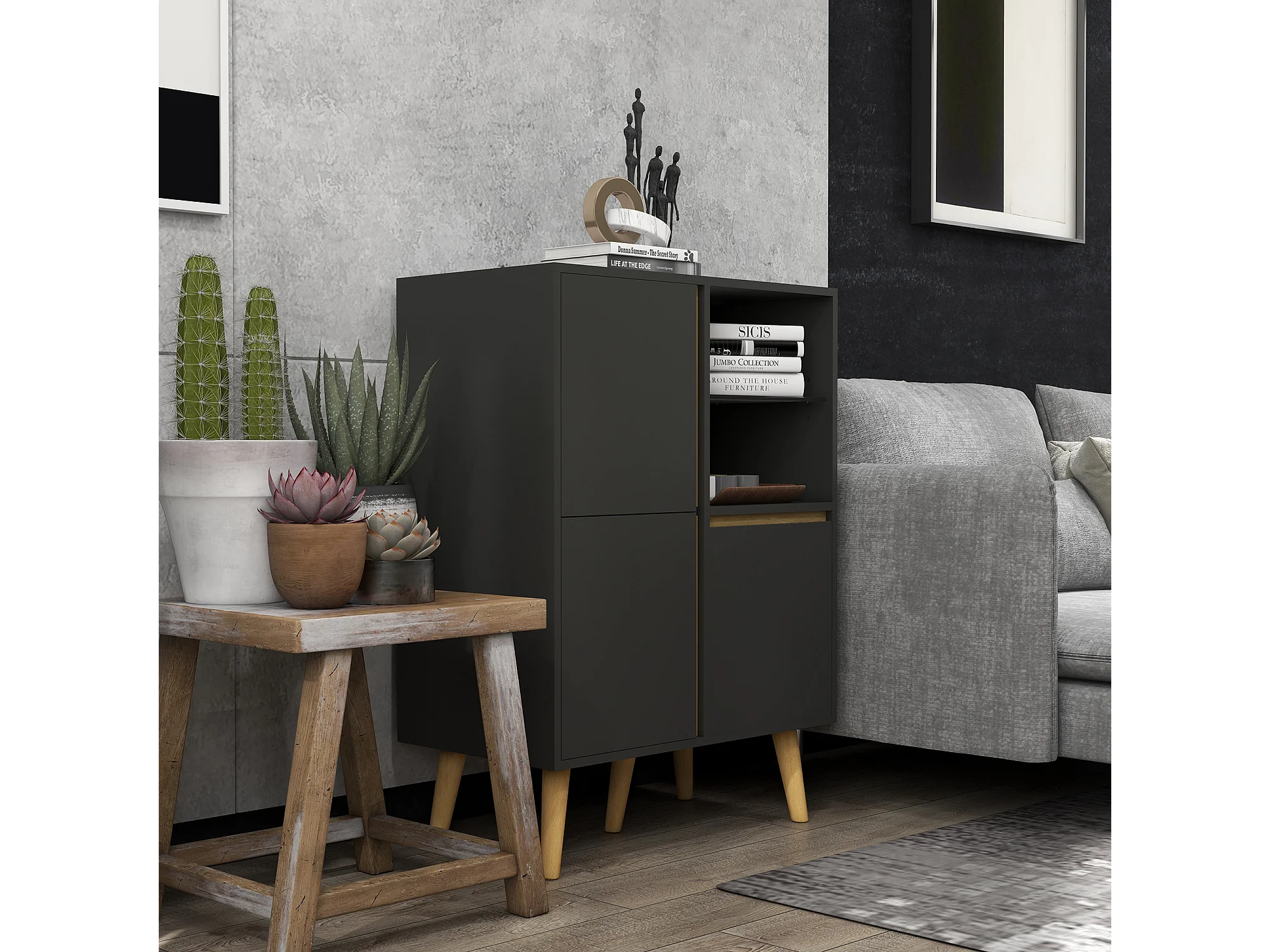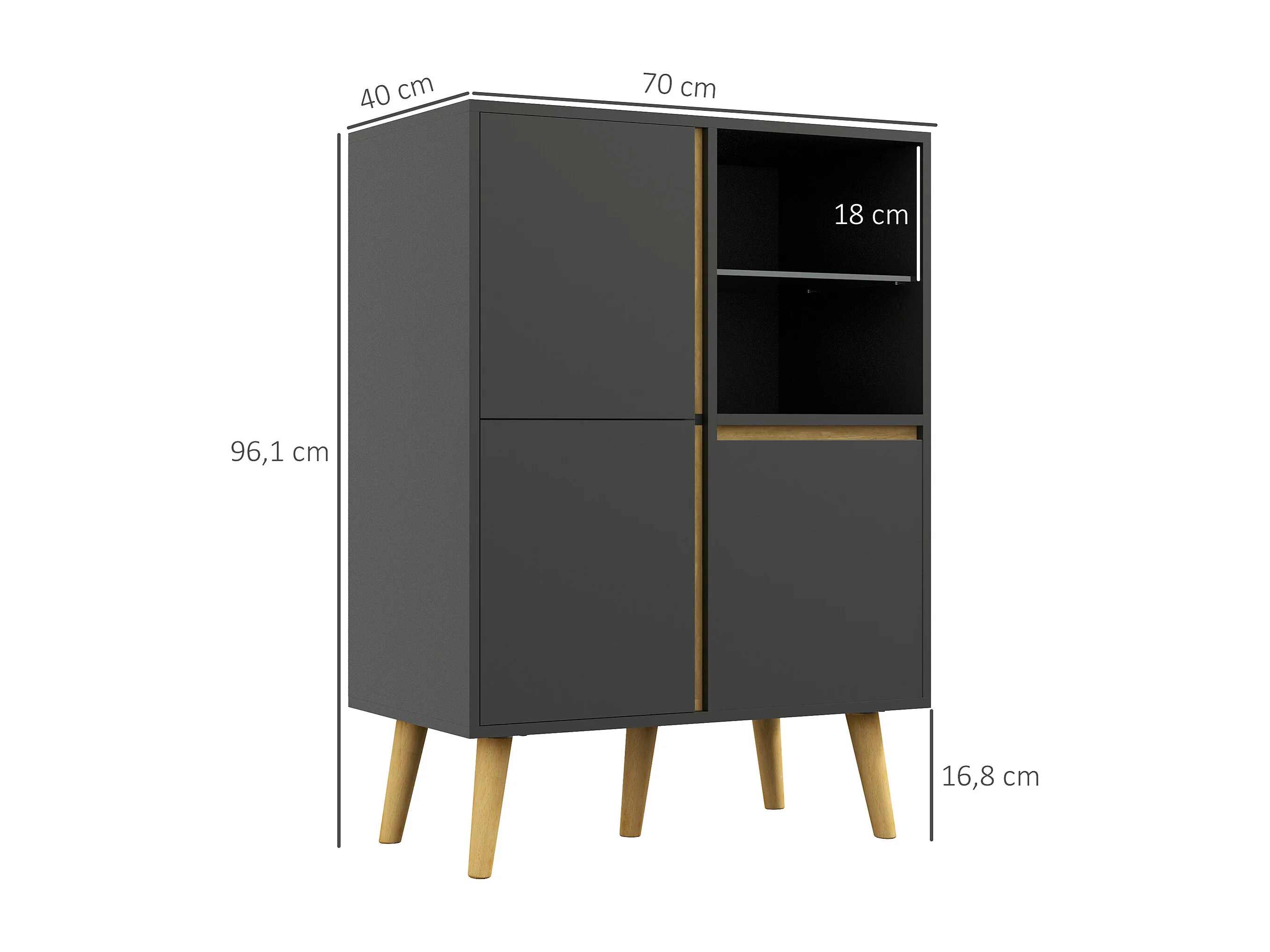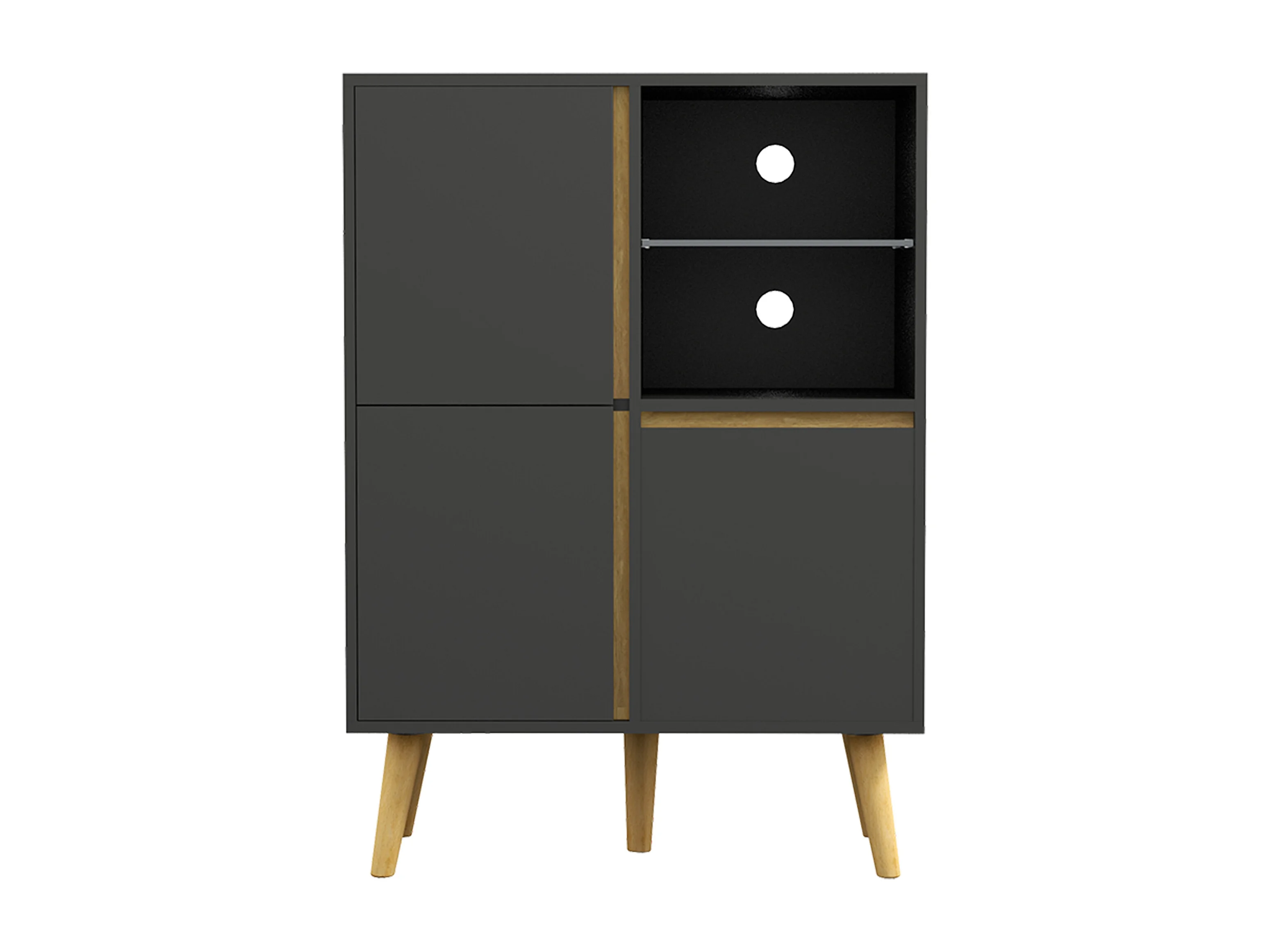 Meuble TV Hi-fi sur pied design scandinave 3 portes 3 étagères 2 niches verre trempé bois gris