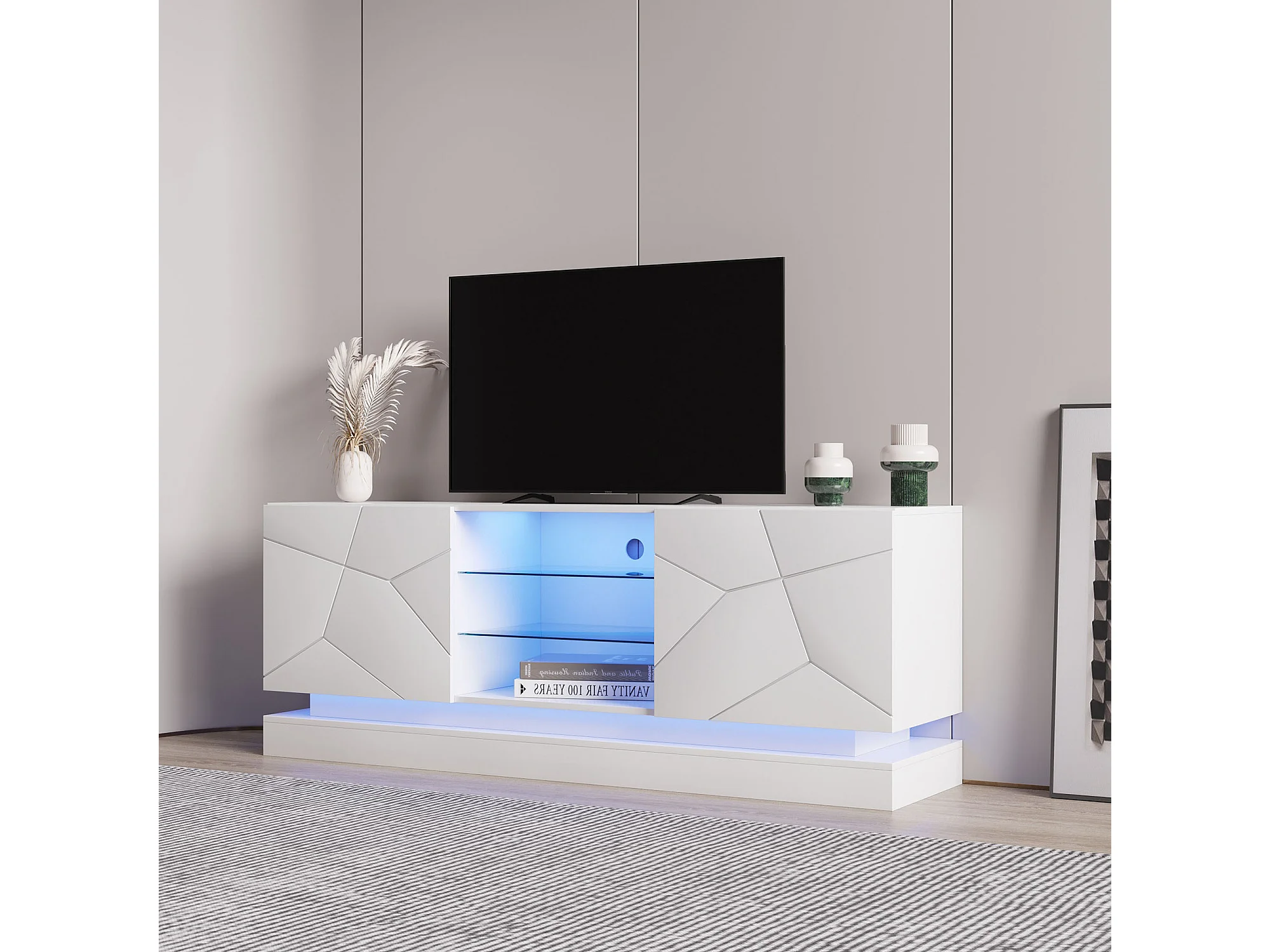 Meuble TV LED 160x38.5x60 cm 2 portes meuble de rangement en bois - étagères vitrées réglables - blanc
