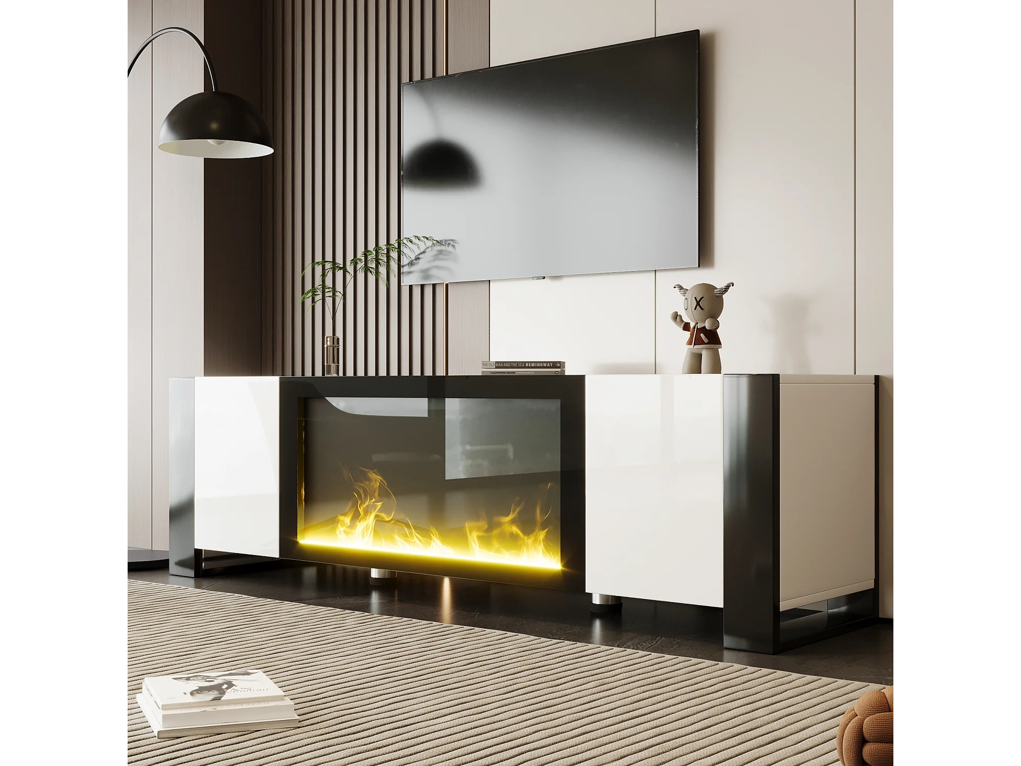 Meuble TV, lowboard avec cheminée électrique effet flamme, sans fonction chauffage, finition haute brillance, meuble TV assorti