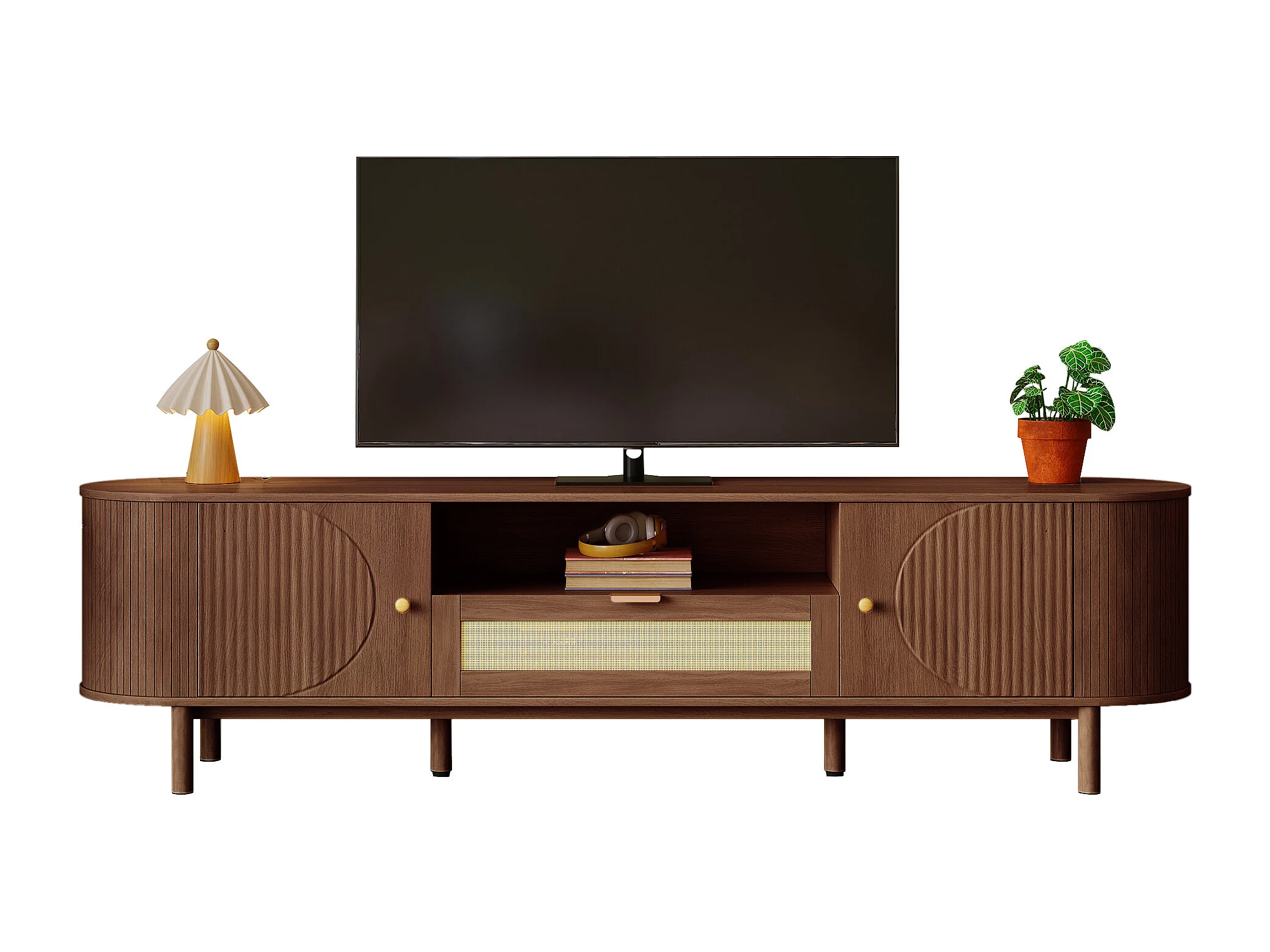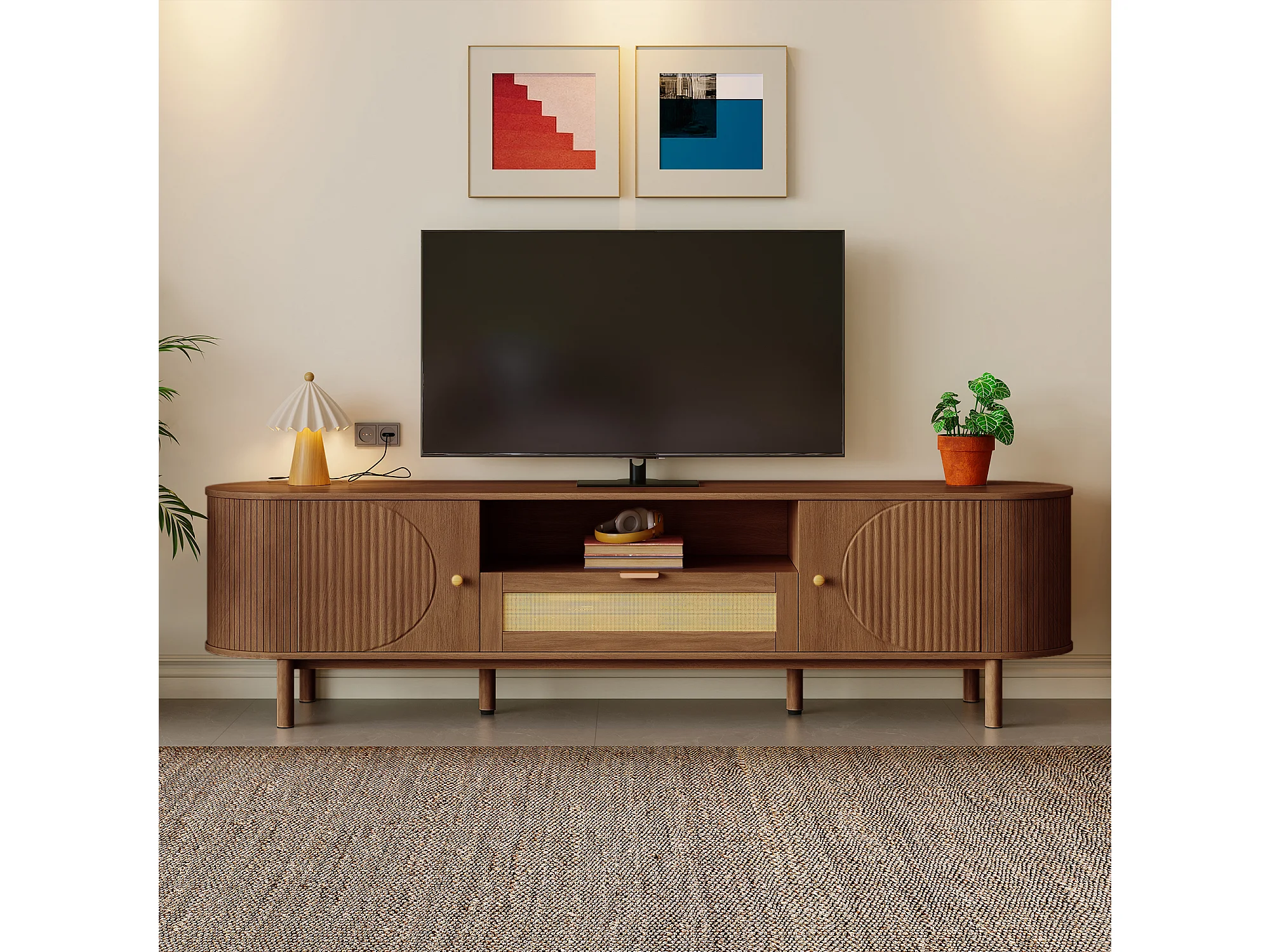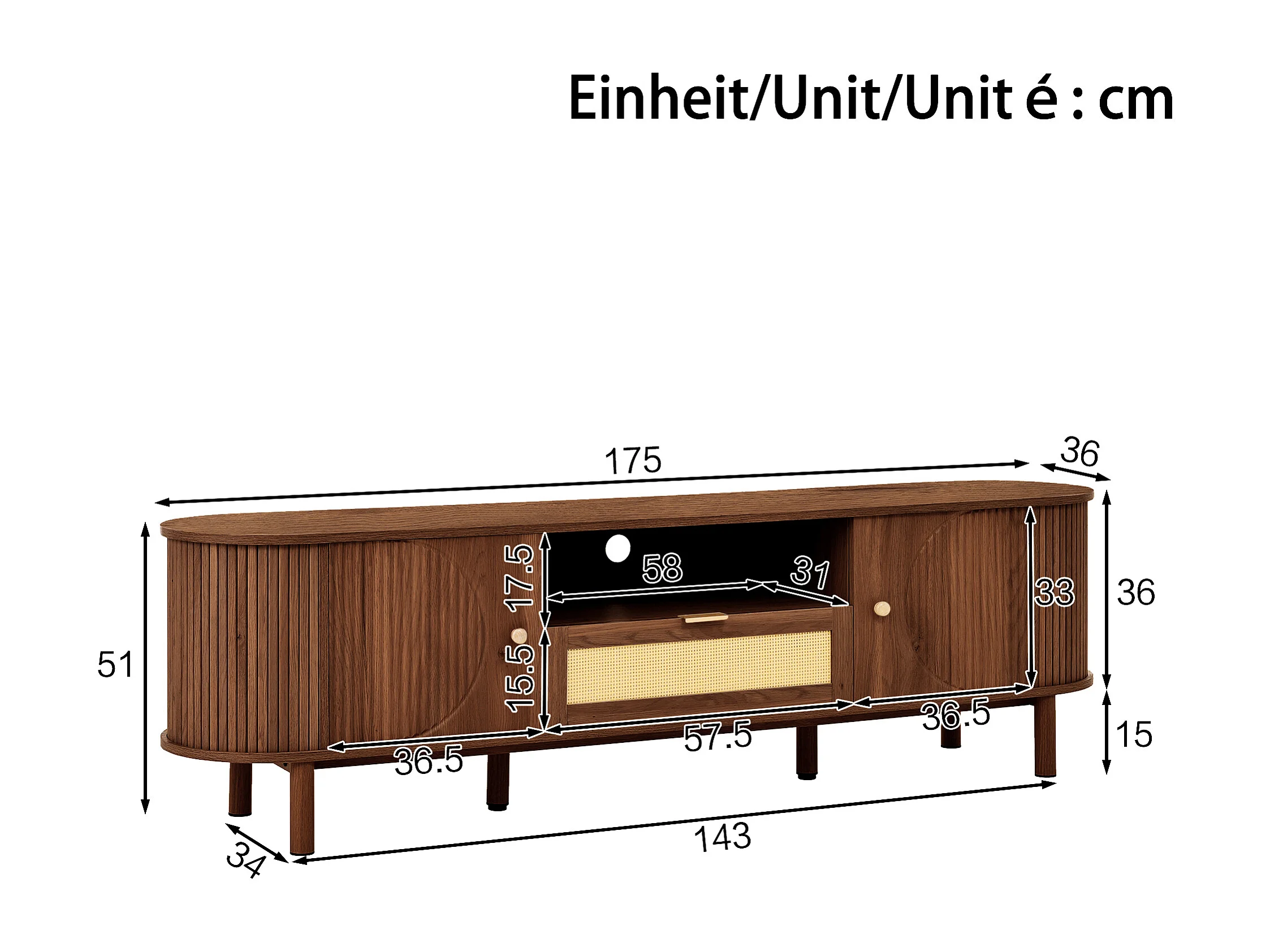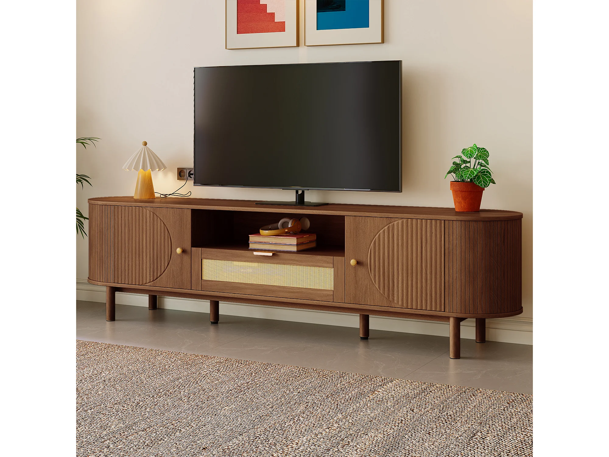 Meuble TV moderne - 175 x 36 x 51 cm - avec tiroirs en rotin + étagère ouvert + 2 portes - pieds en métal - MDF - marron