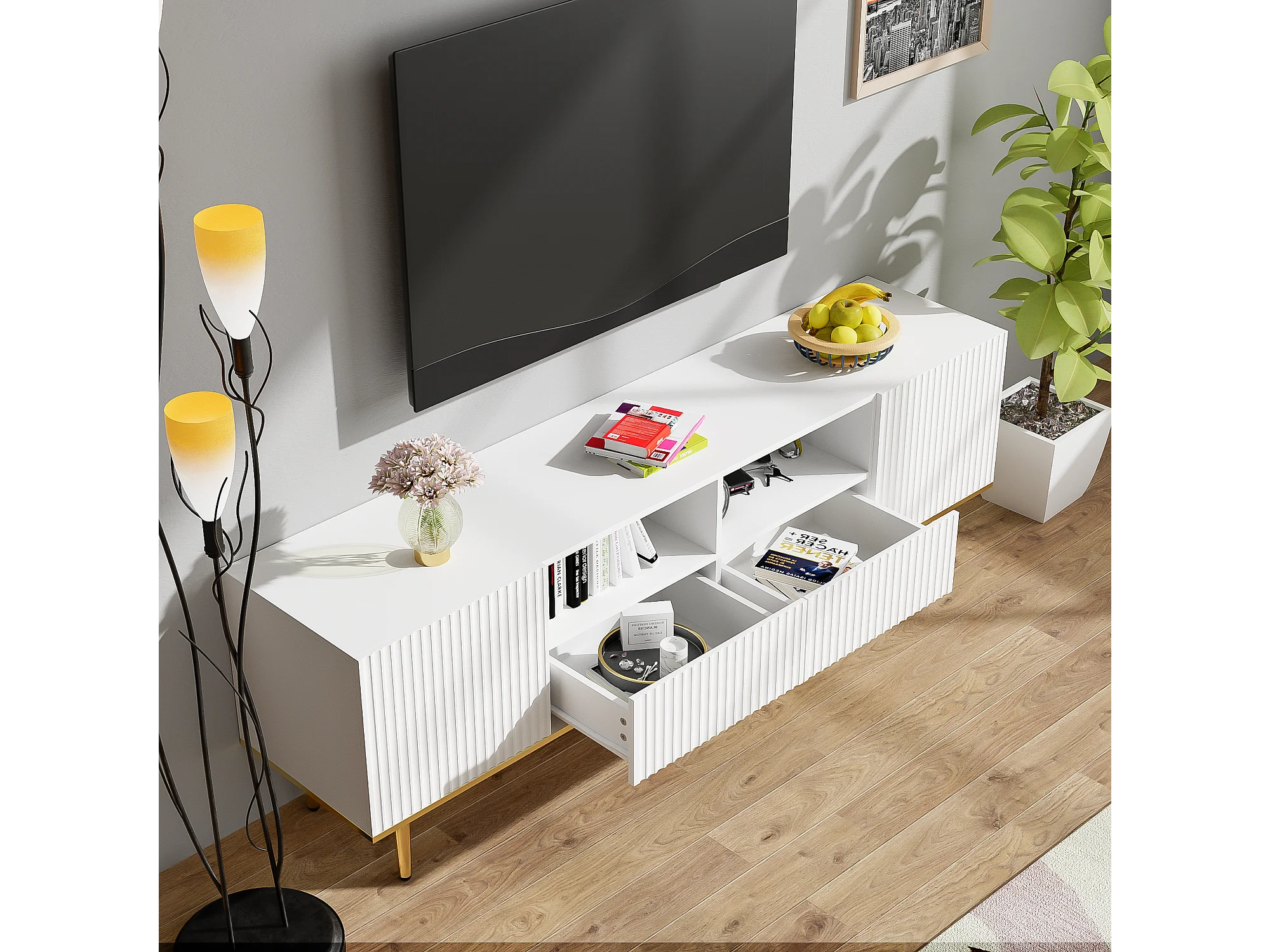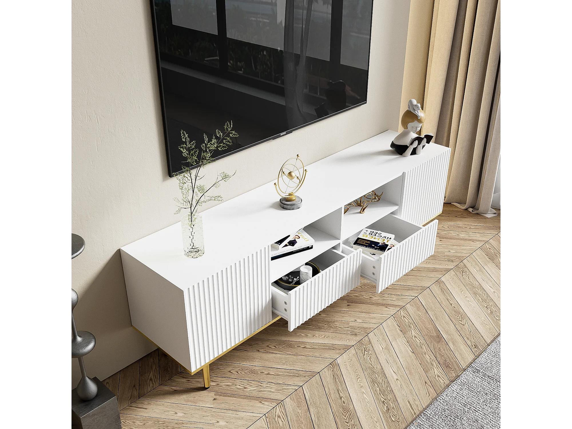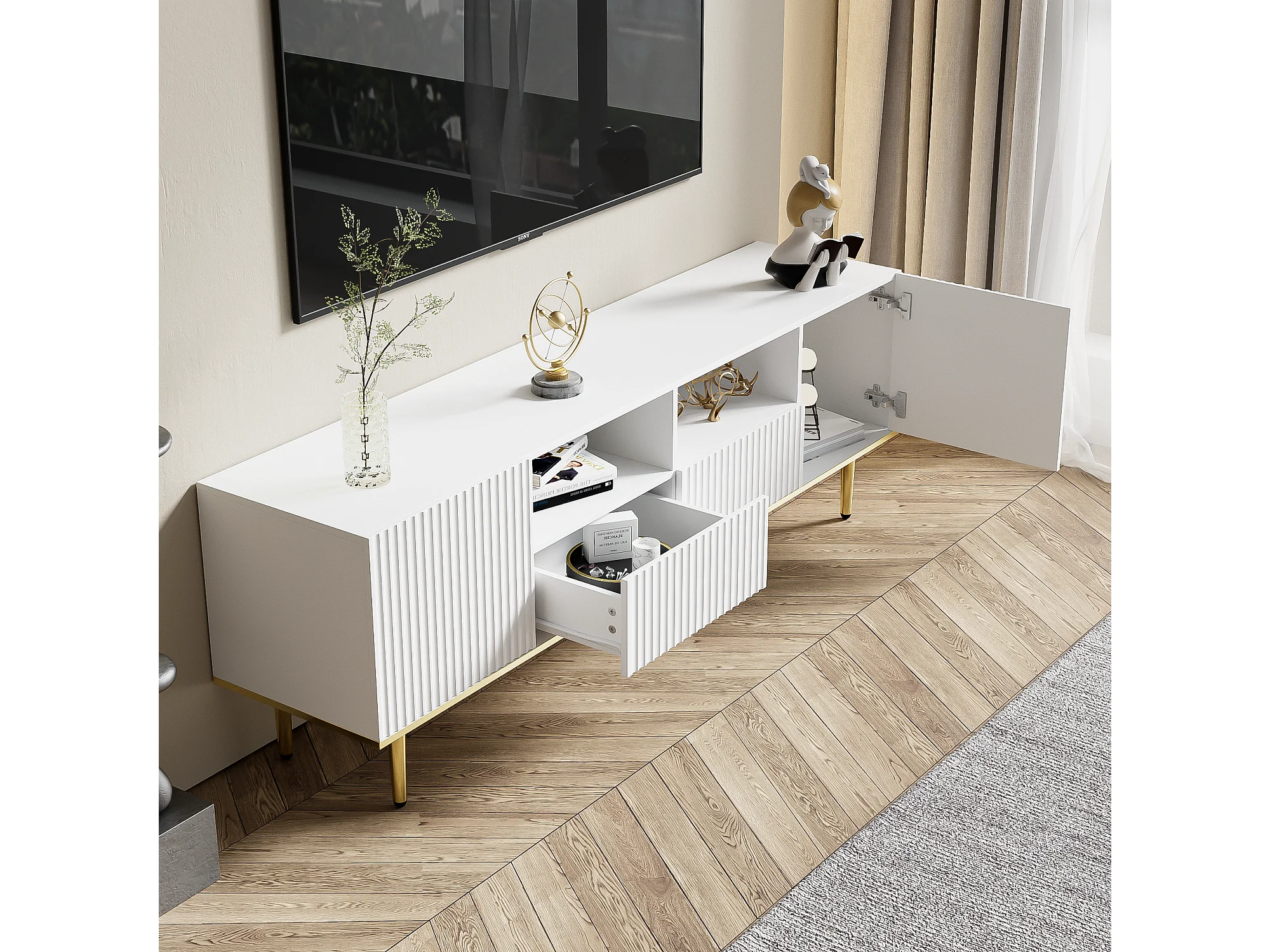 Meuble TV moderne, meuble TV avec pieds dorés et bord doré
