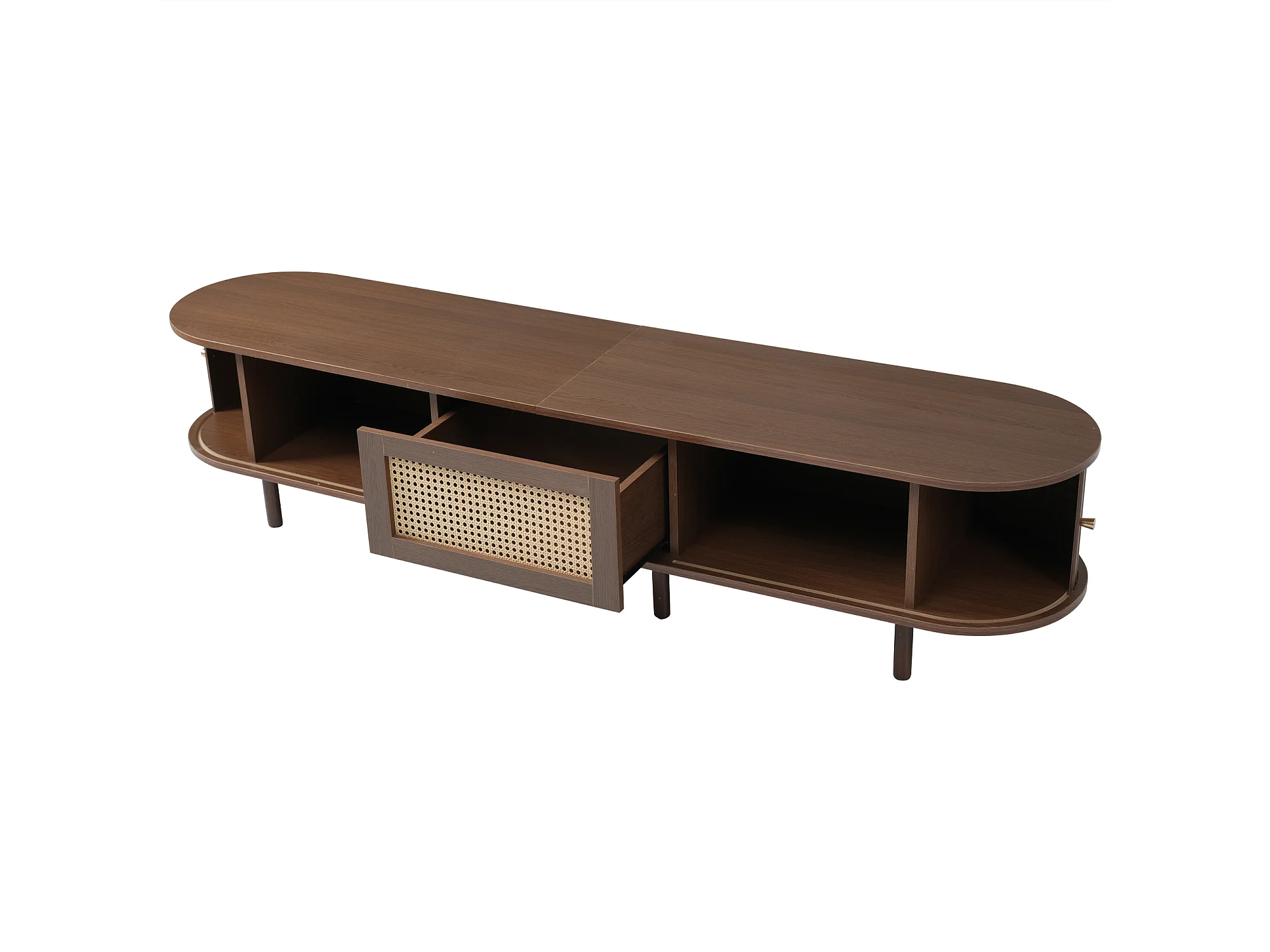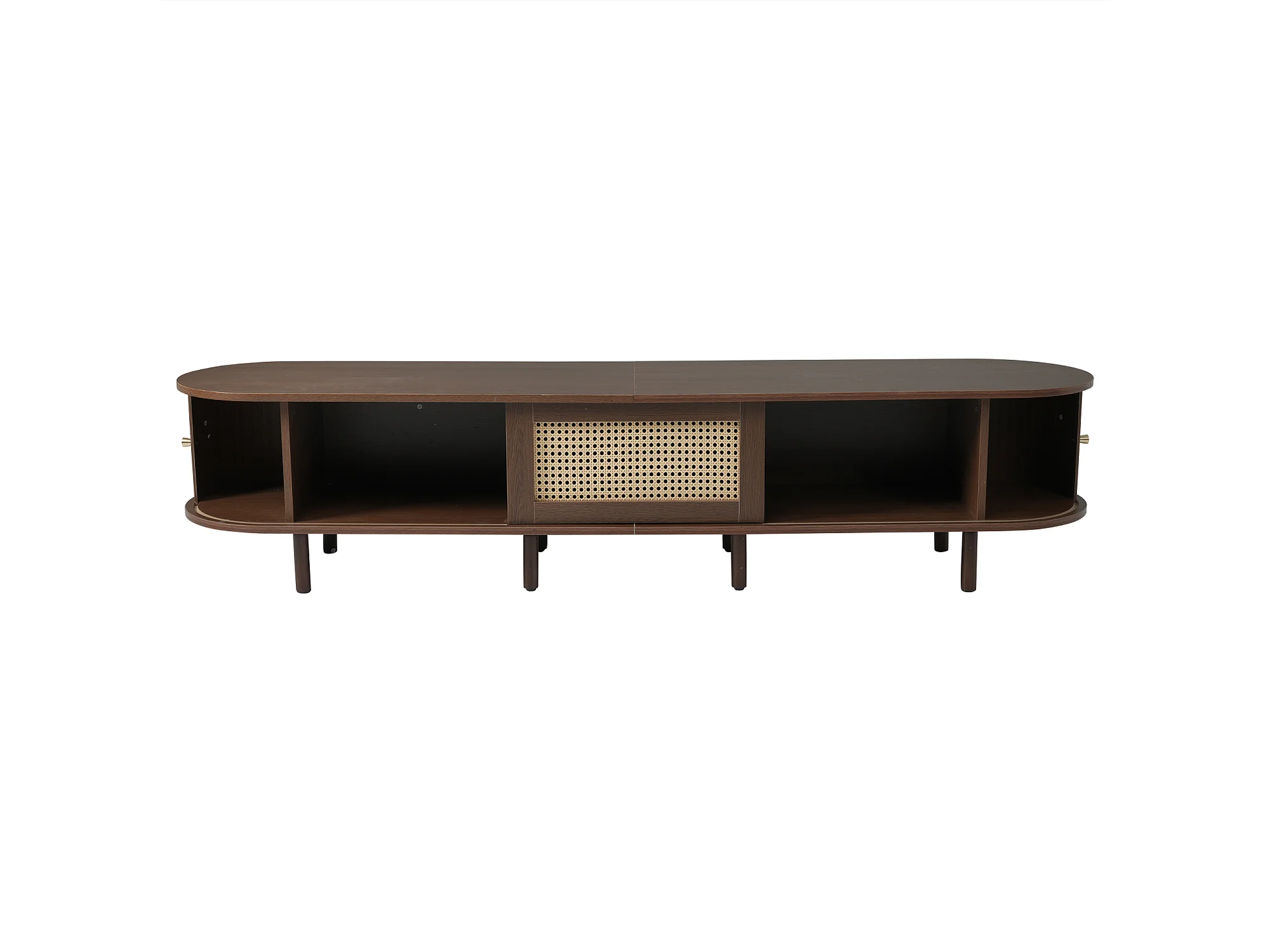 Meuble TV ovale 180x40x40 cm avec 2 portes 1 tiroir en rotin et rangement - pieds réglables - bois - noyer