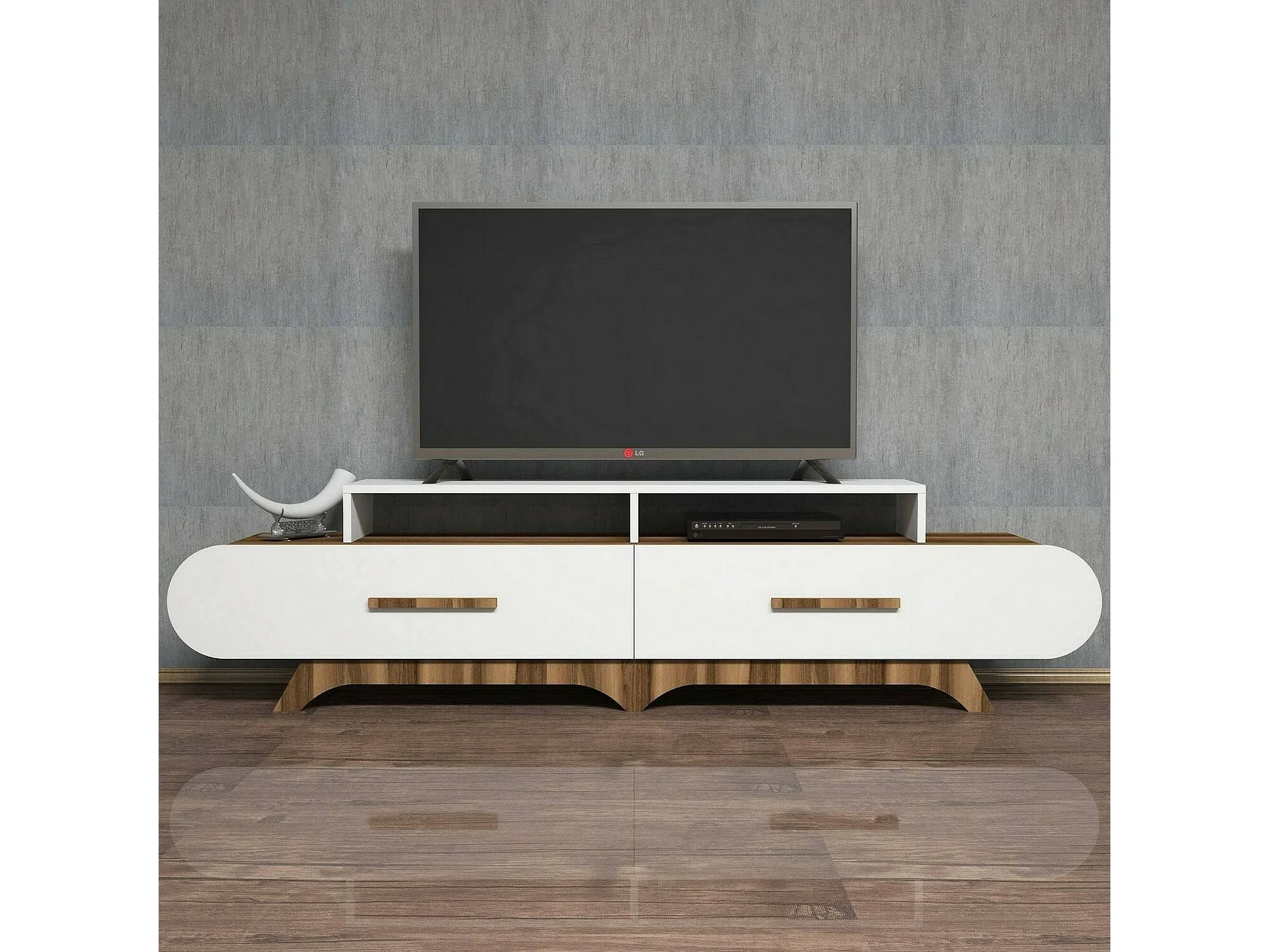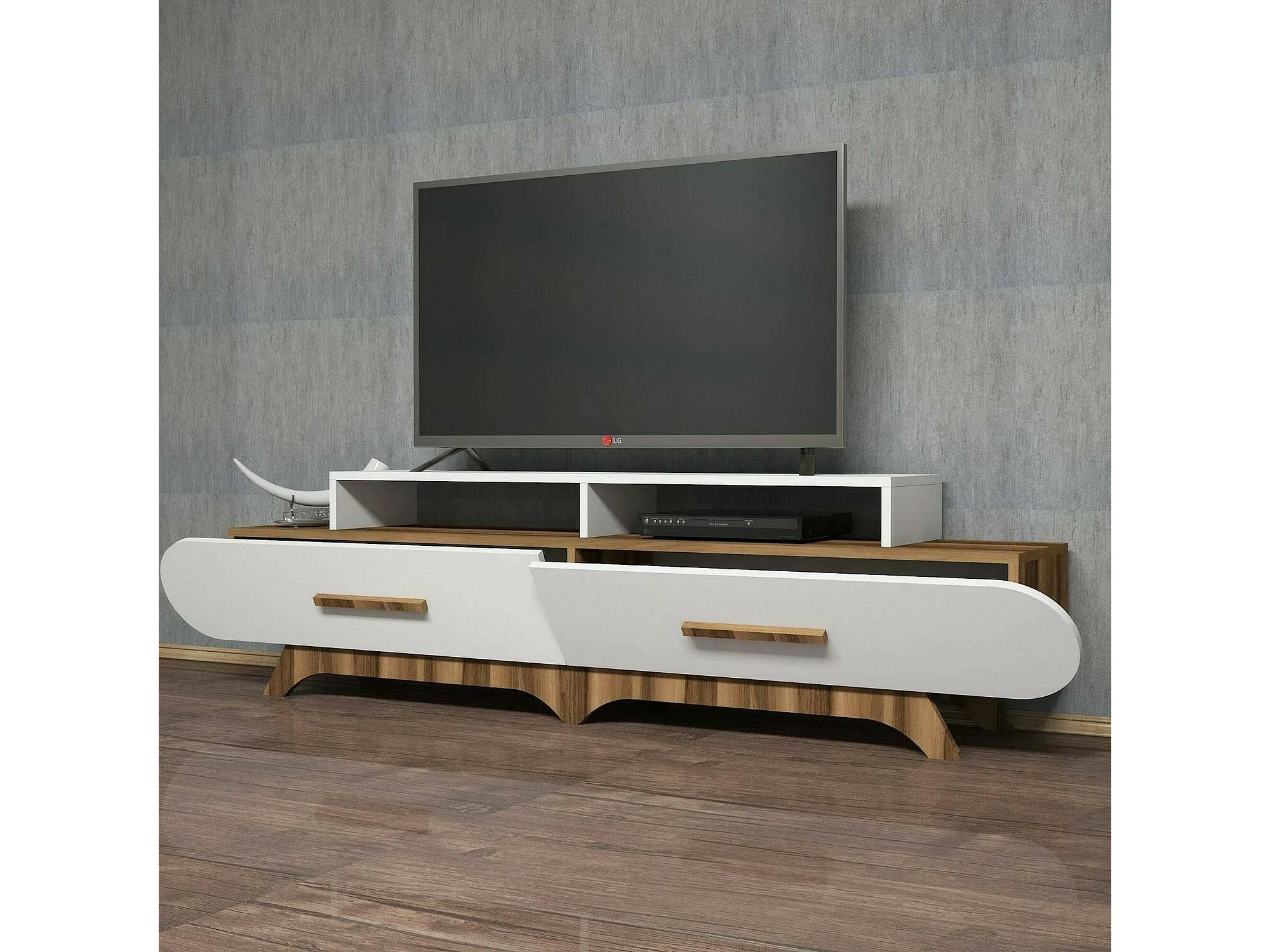 Meuble TV Phec, Buffet de salon, Armoire basse pour TV, Base murale de rangement, 205x37h50 cm, Noyer et Blanc