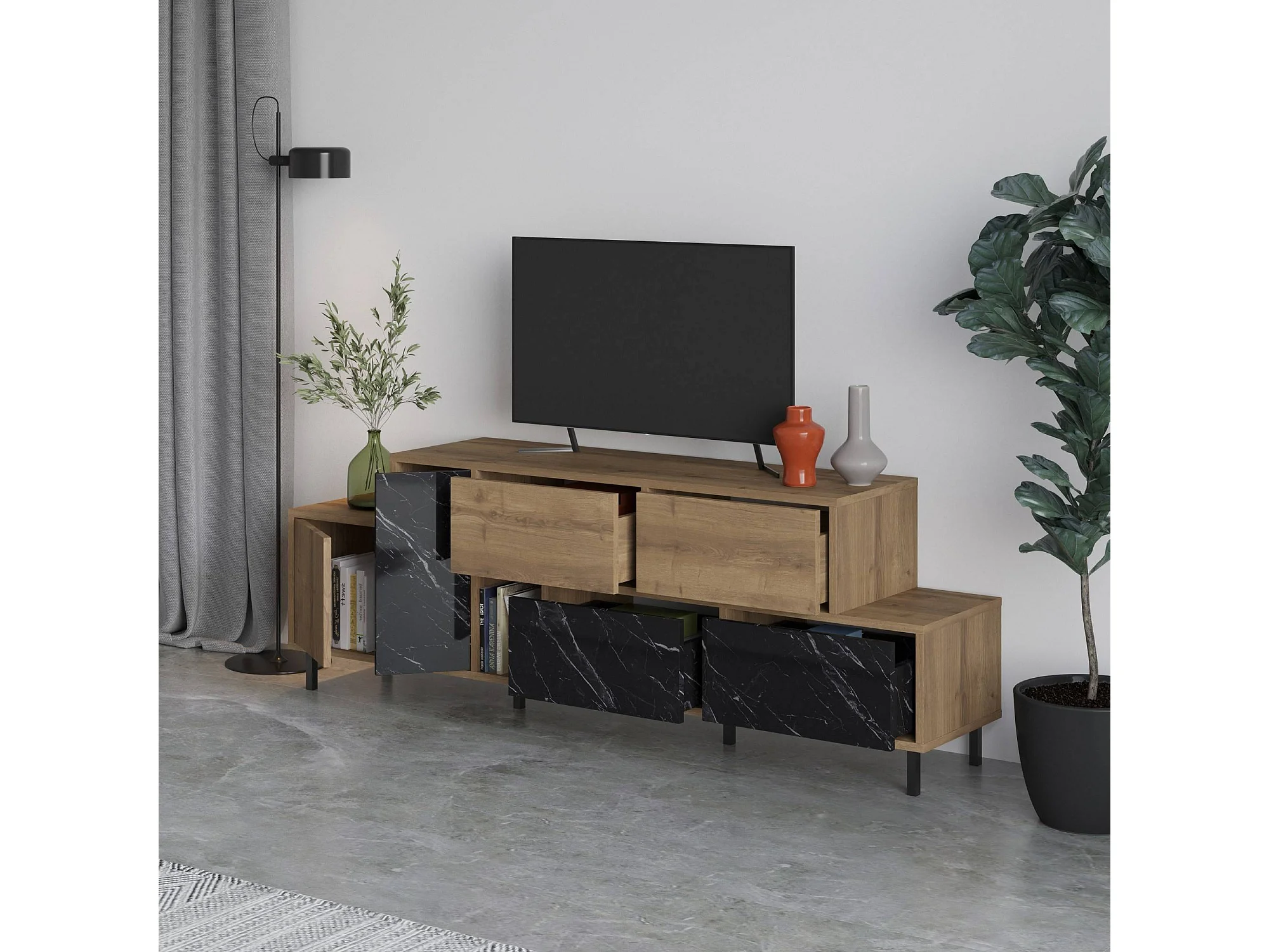 Meuble Tv Simia L171,2cm Bois foncé et Effet marbre Noir