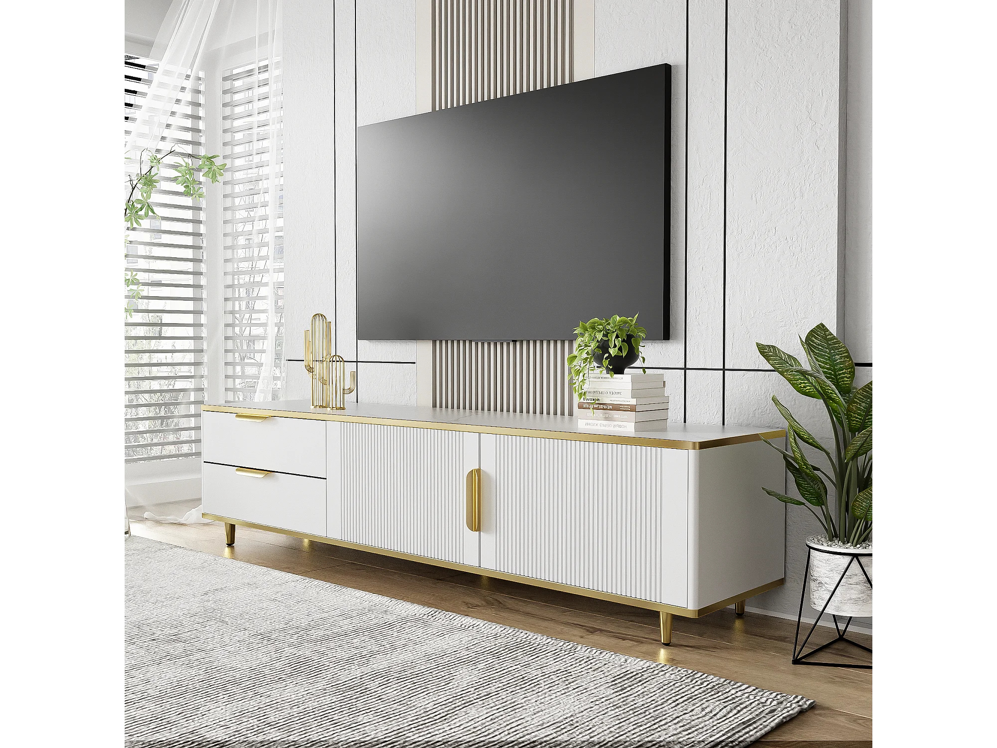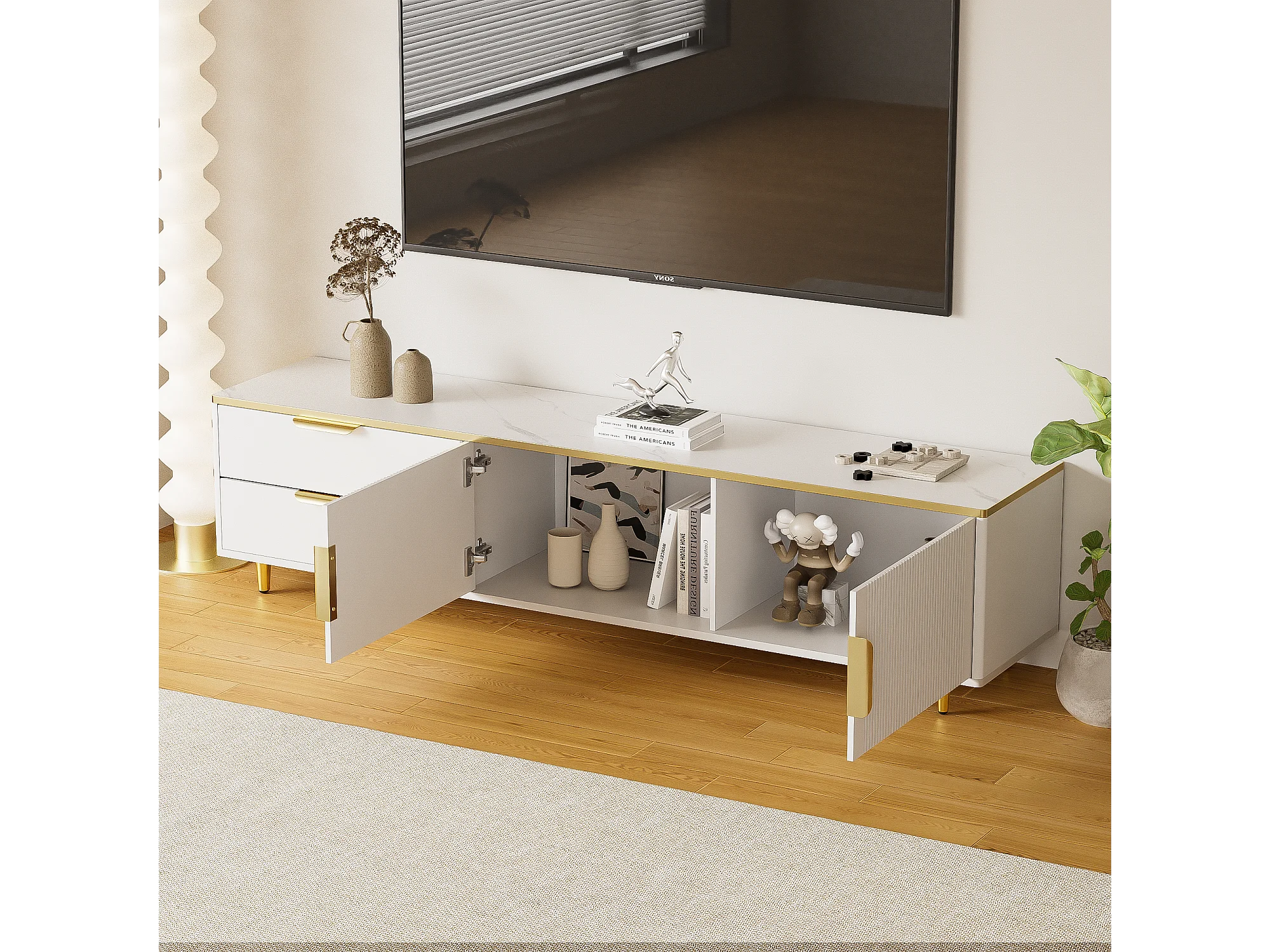 Meuble TV, table basse avec texture sculptée, poignées et pieds dorés, meuble pour salon avec structure en marbre