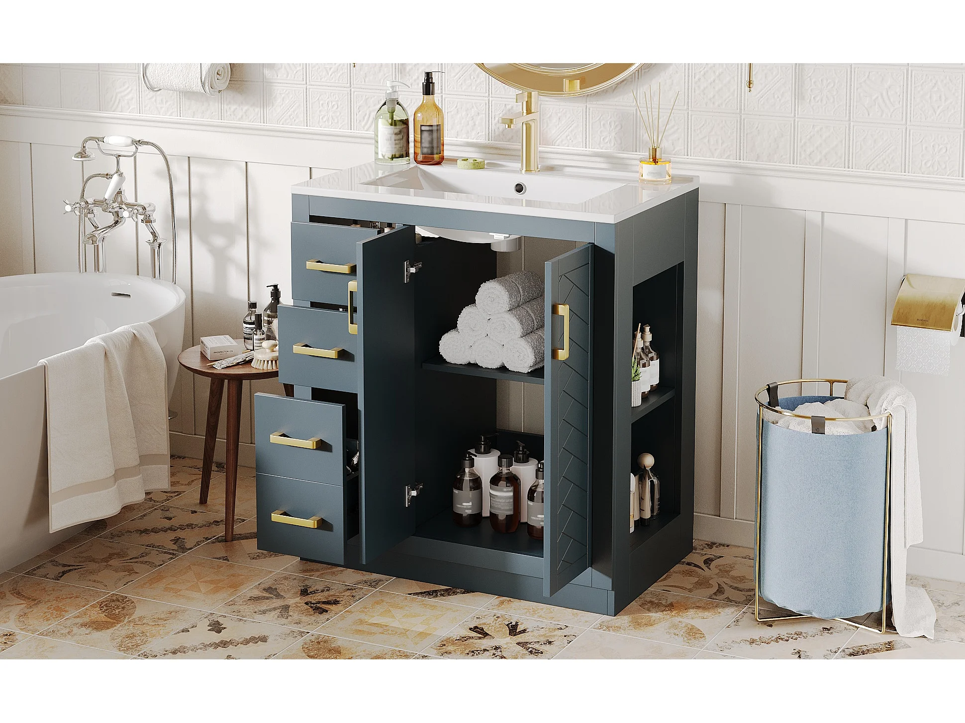Meuble vasque en céramique de salle de bain - 76.5 x 46.5 x 84.5 cm - avec 3 tiroirs + étagère latérale + 2 portes - MDF - bleu