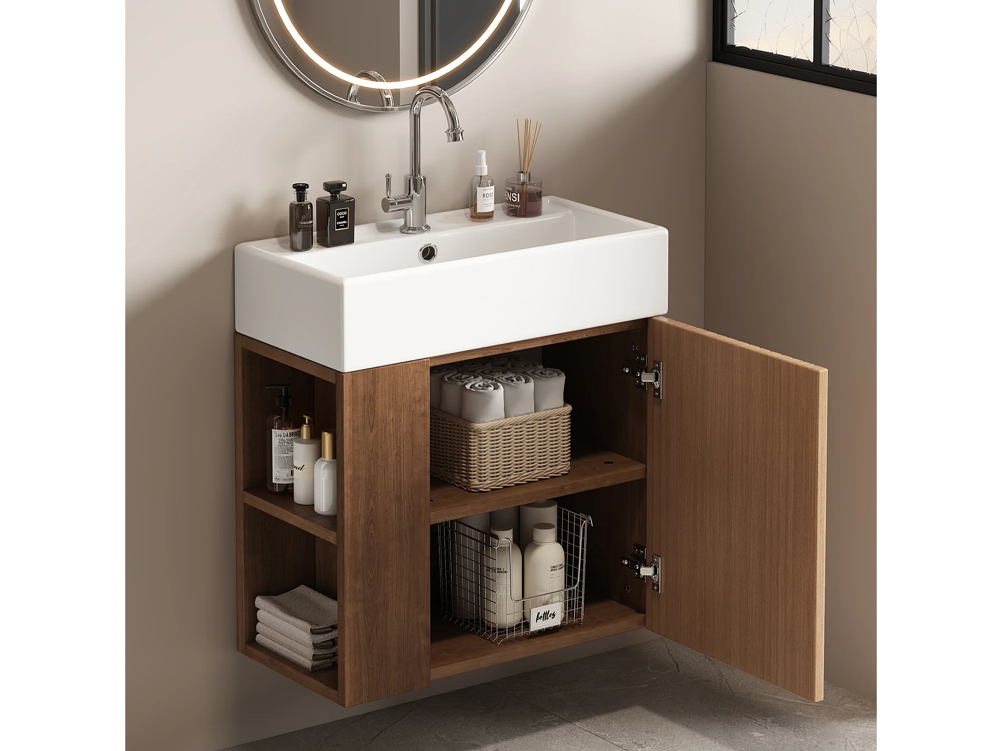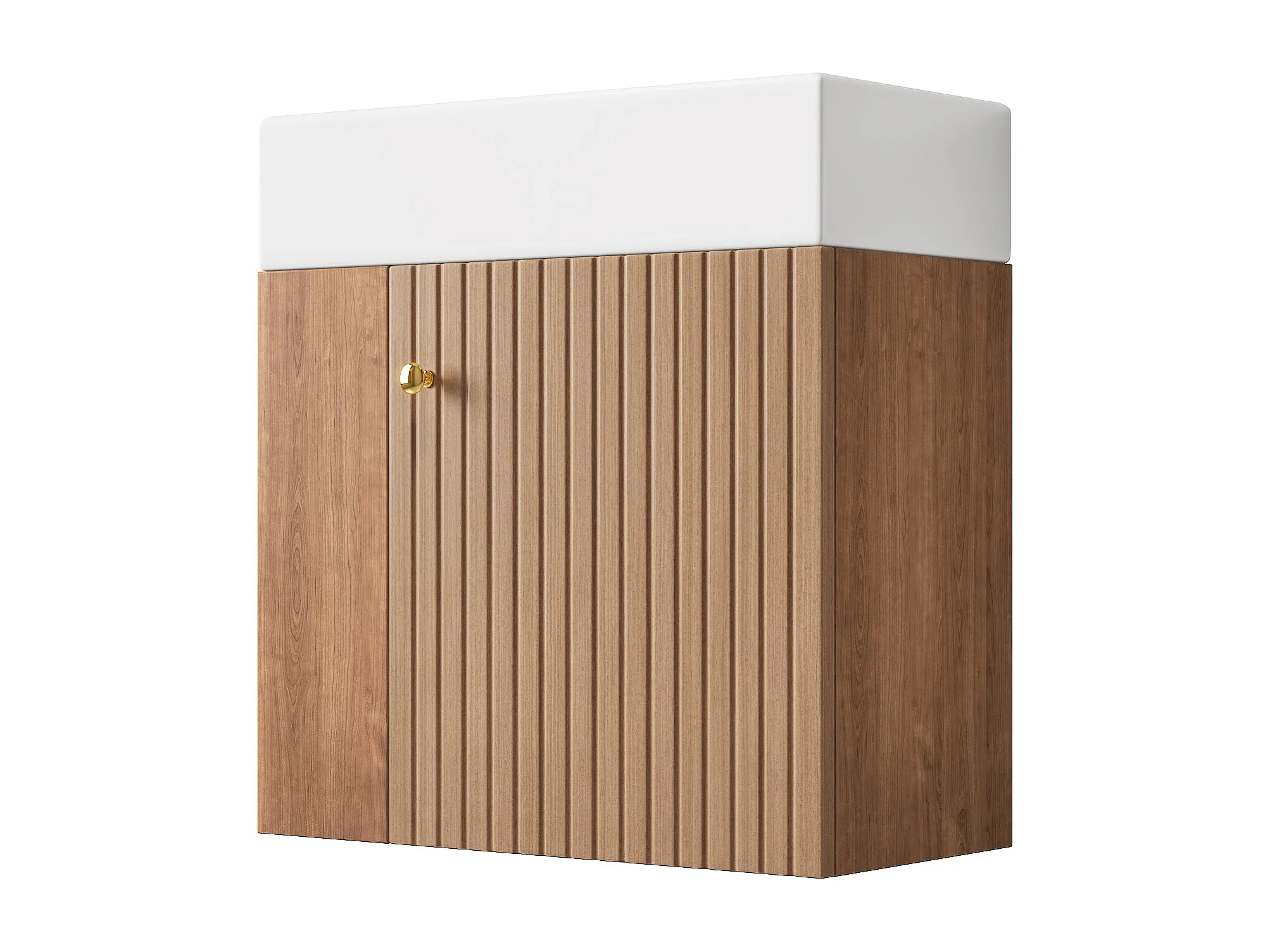 Meuble vasque suspendu 55x31x66,5 cm avec rangement sous vasque, style simple, céramique blanc + MDF marron