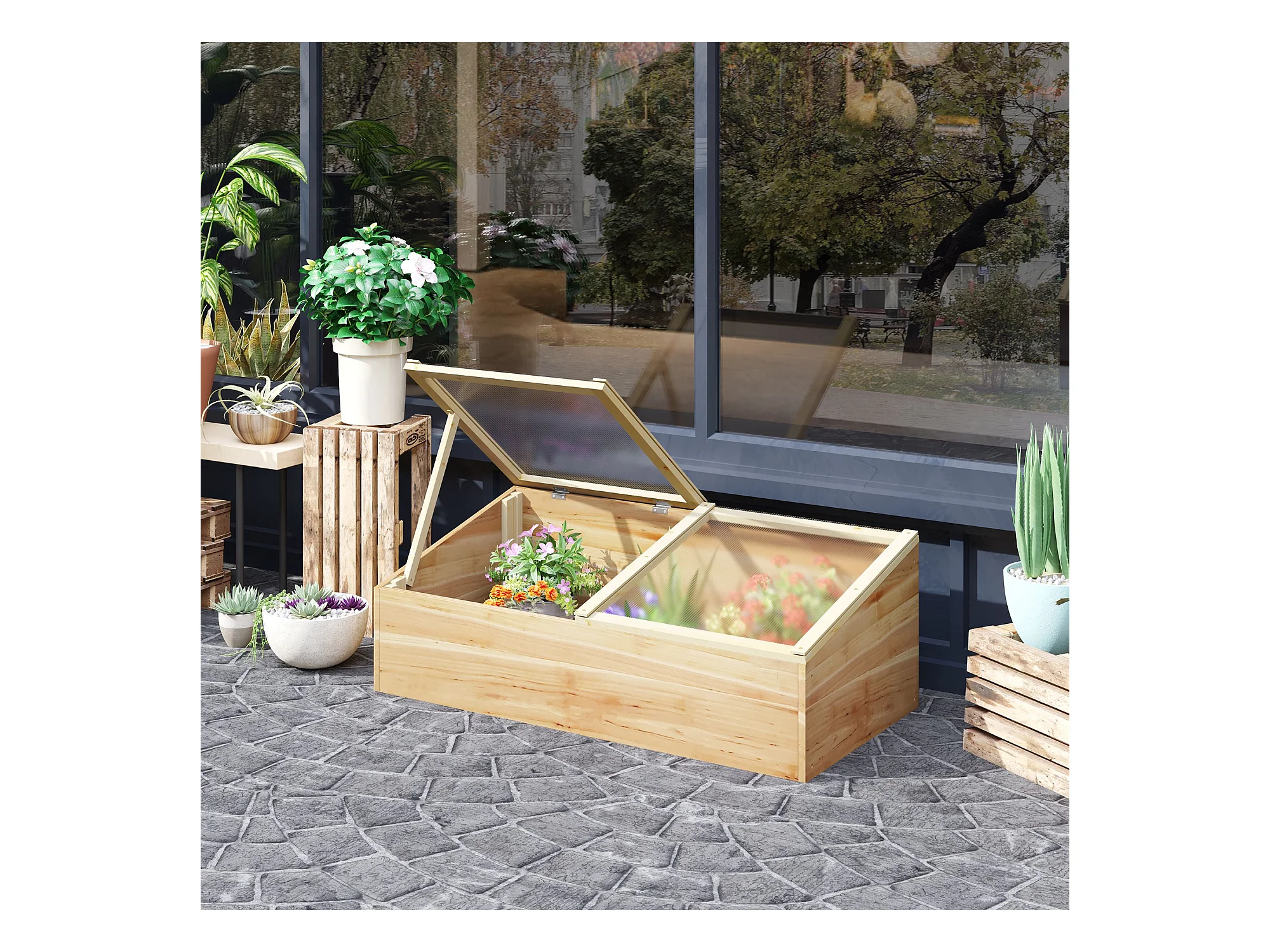 Mini serre de jardin serre pour semis dim. 100L x 50l x 36H cm toit 2 pans ouvrables séparement panneaux de polycarbonate bois sapin pré-huilé
