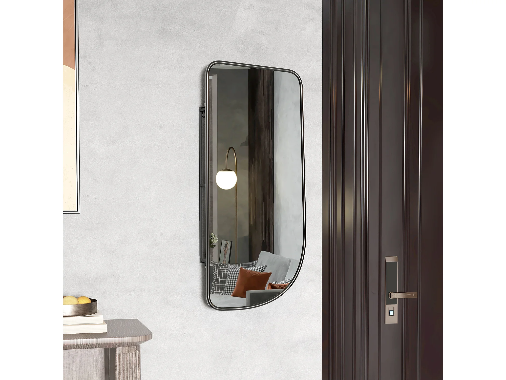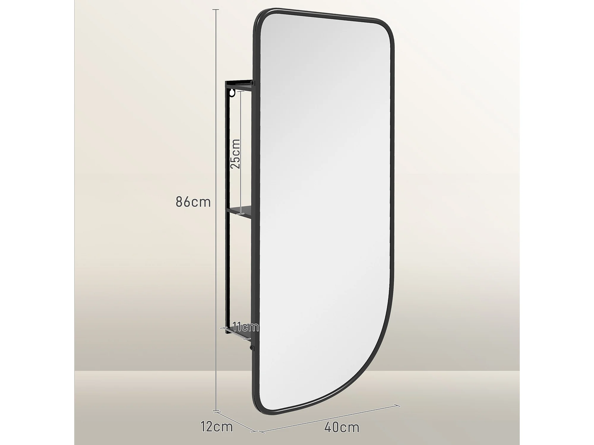 Miroir mural forme organique dim. 40L x 86H cm - 3 étagères - cadre métal noir