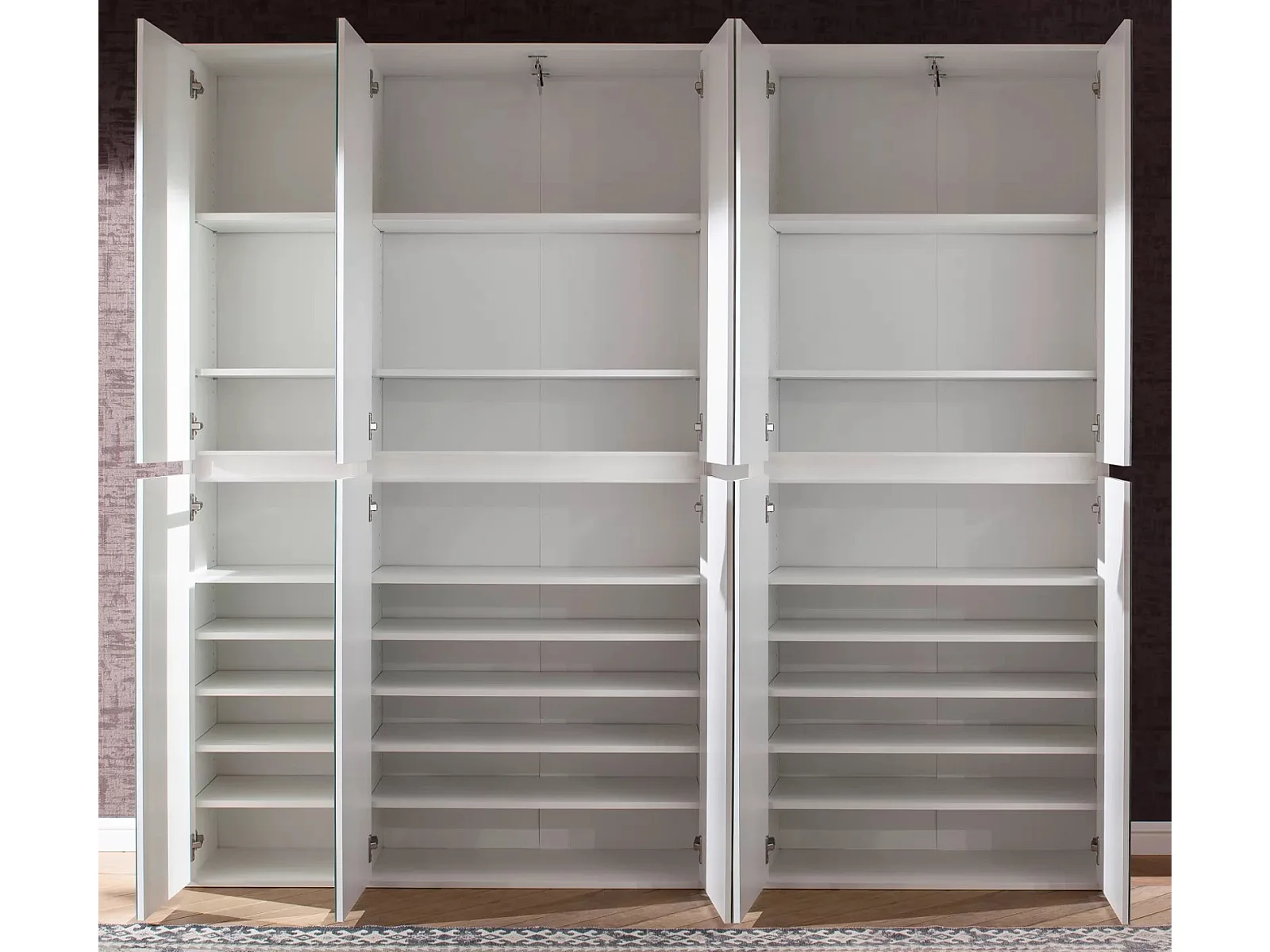 Grande armoire de chambre moderne 6 portes battantes bois blanc laqué et miroir Mona 272cm