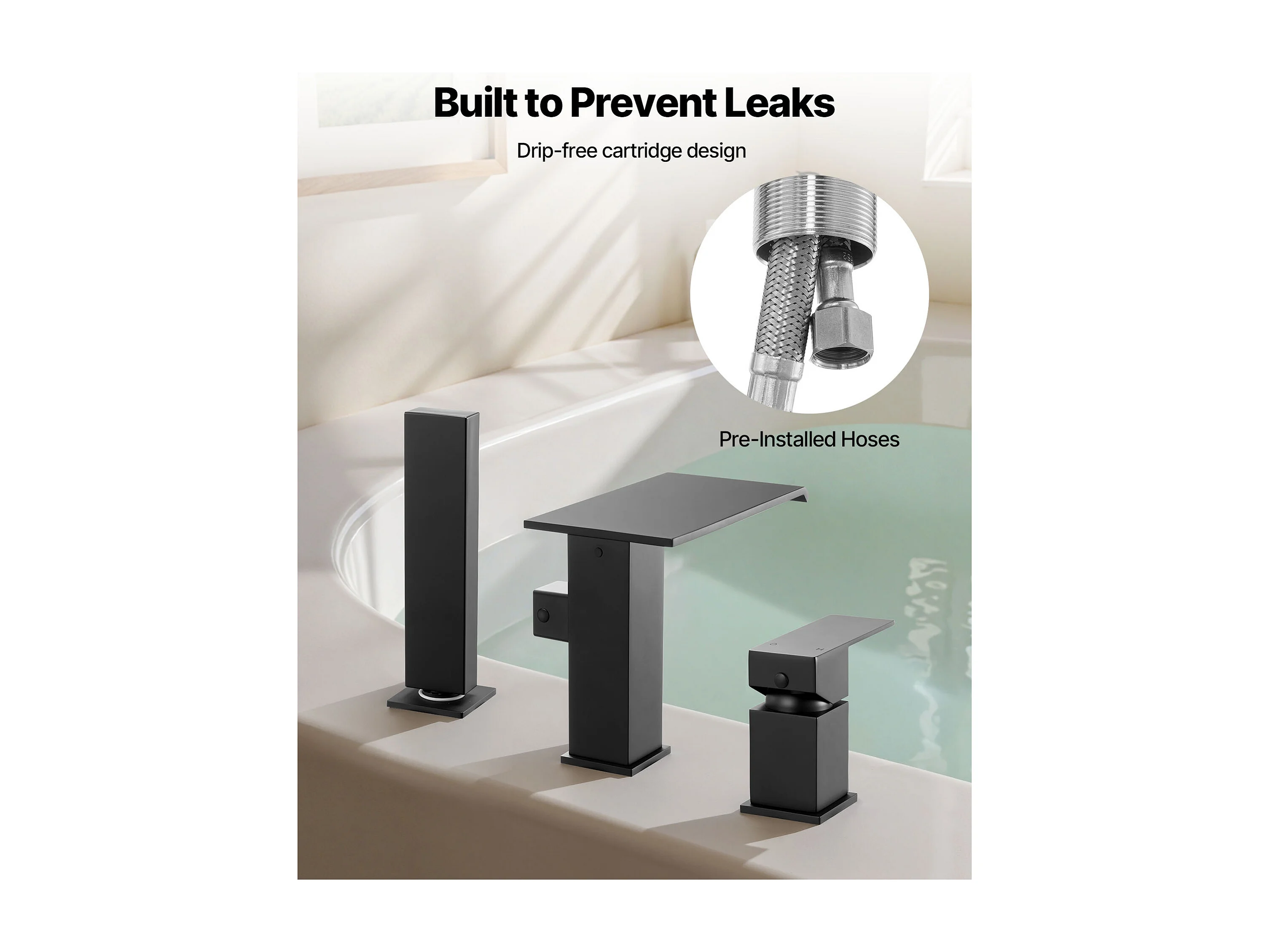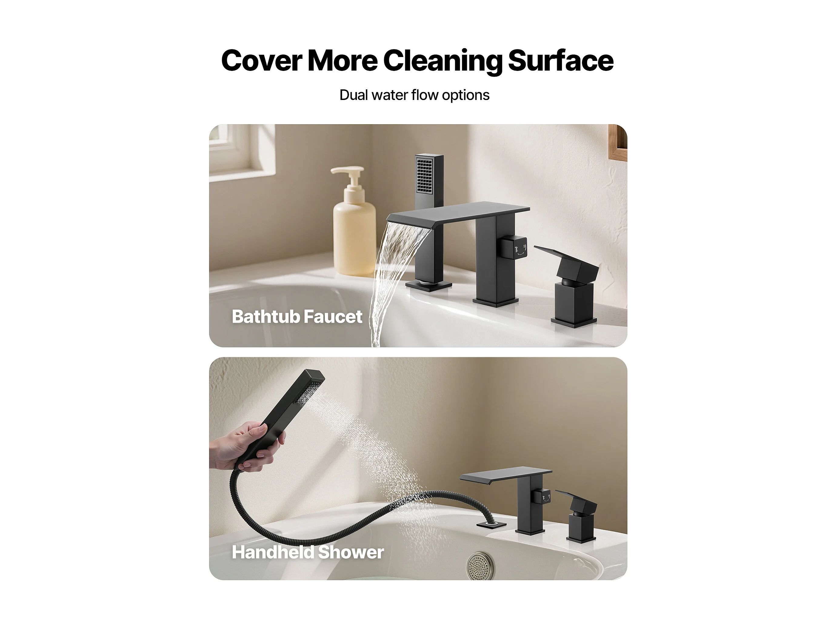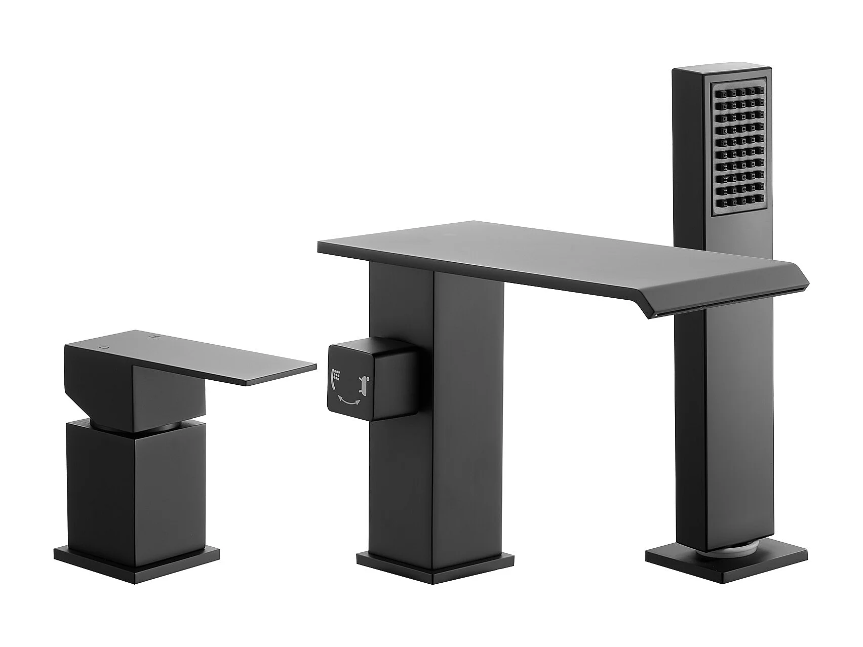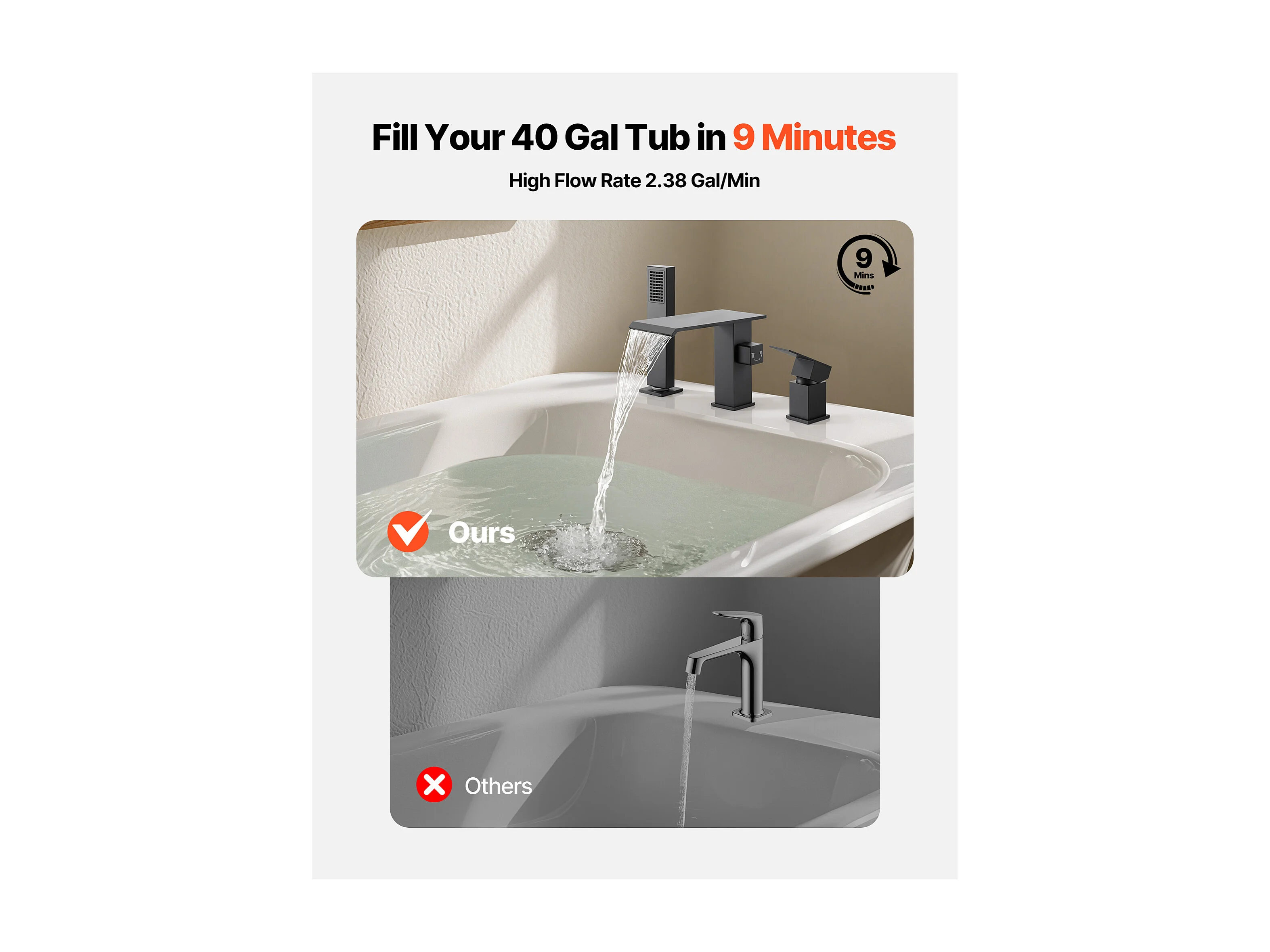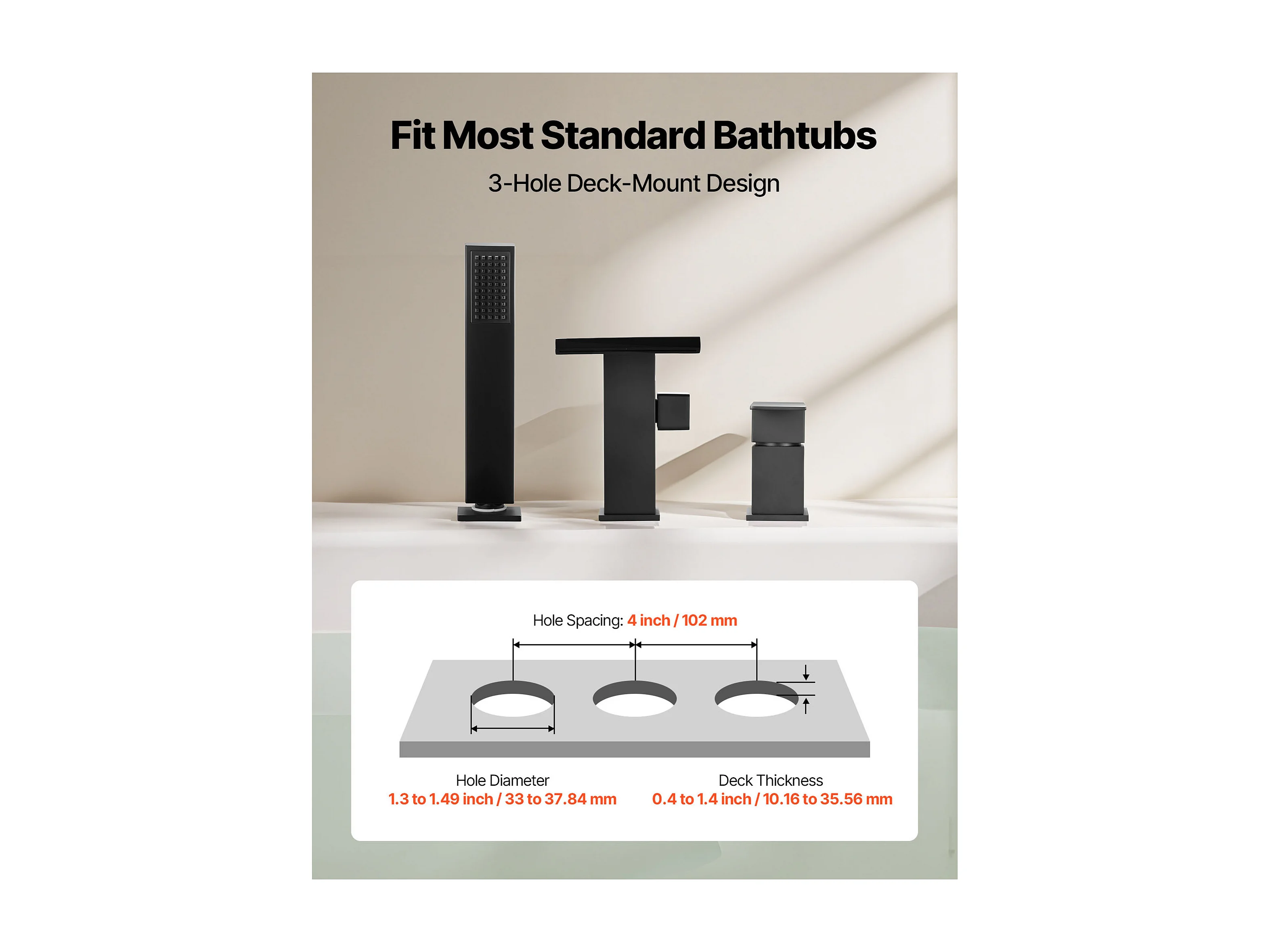 Mitigeur de Baignoire Romaine SucceBuy, Robinet de Bain à 3 Trous, Cascade, avec Pommeau de Douche et Une Poignée, Montage sur Pont, pour Salle de Bains