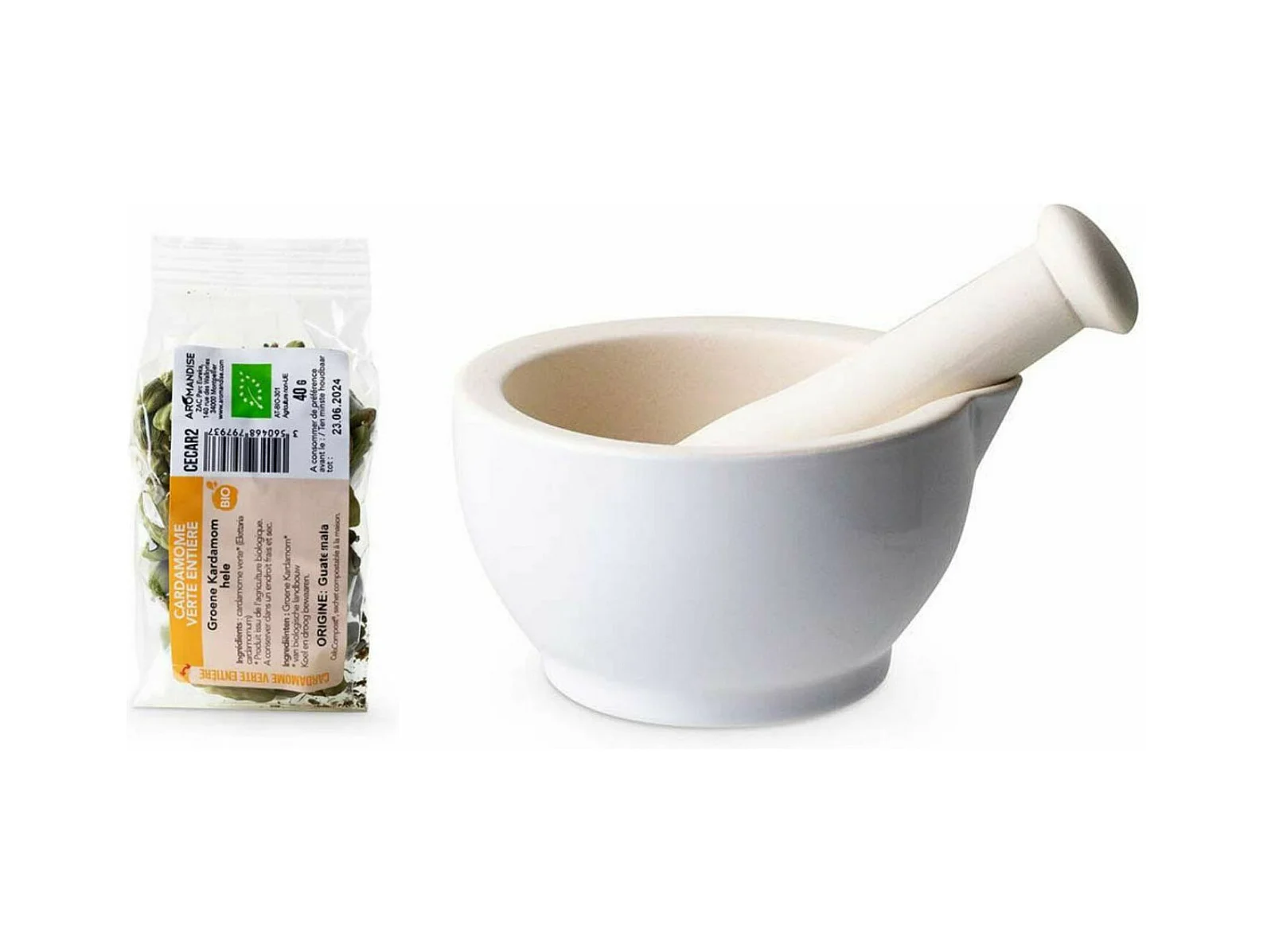Mortier et pilon en grès blanc + Cardamome verte entière bio - 40 g