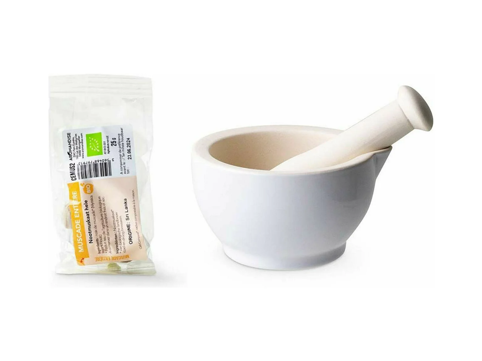 Mortier et pilon en grès blanc + Muscade entière bio - 25 g