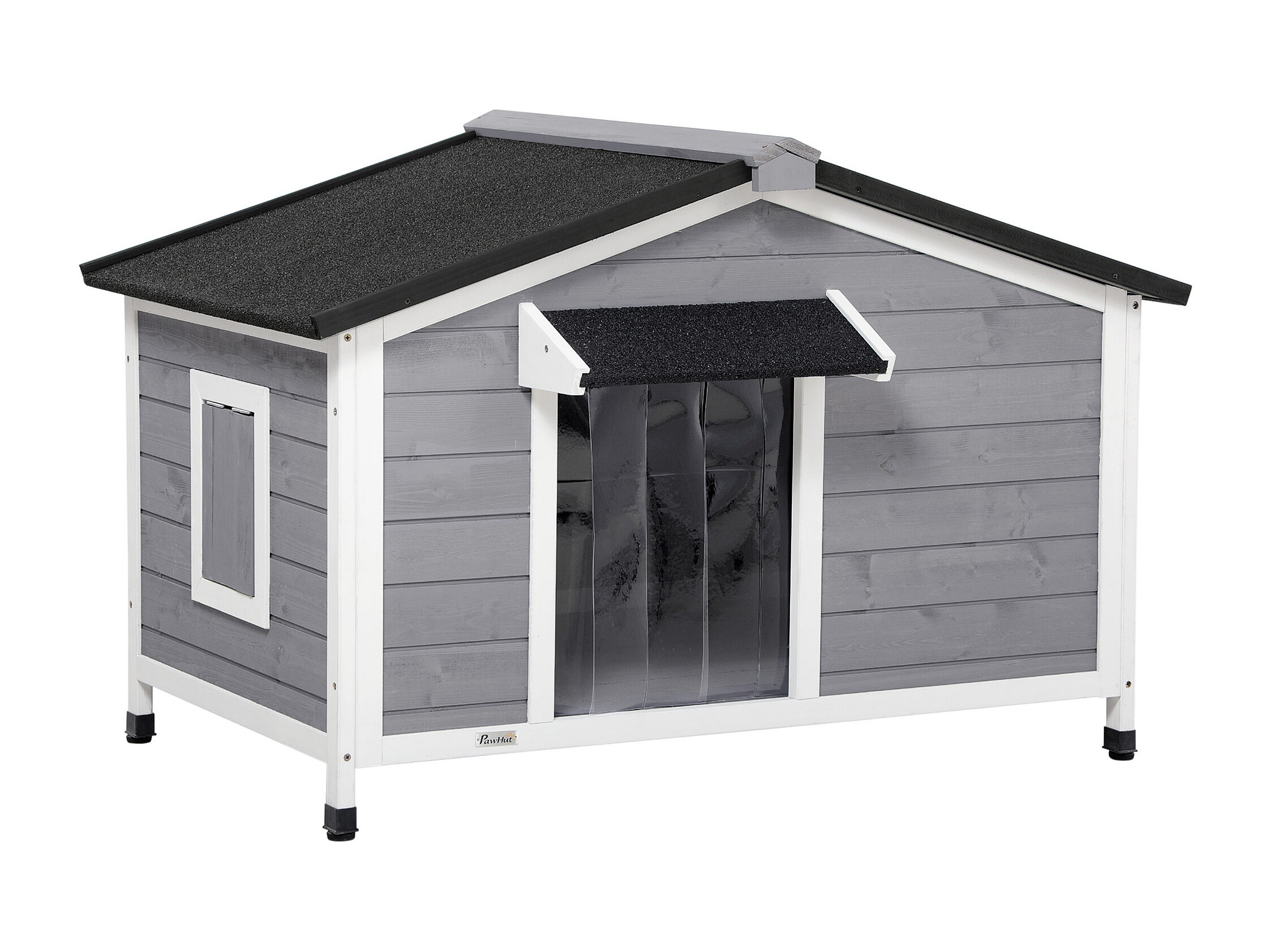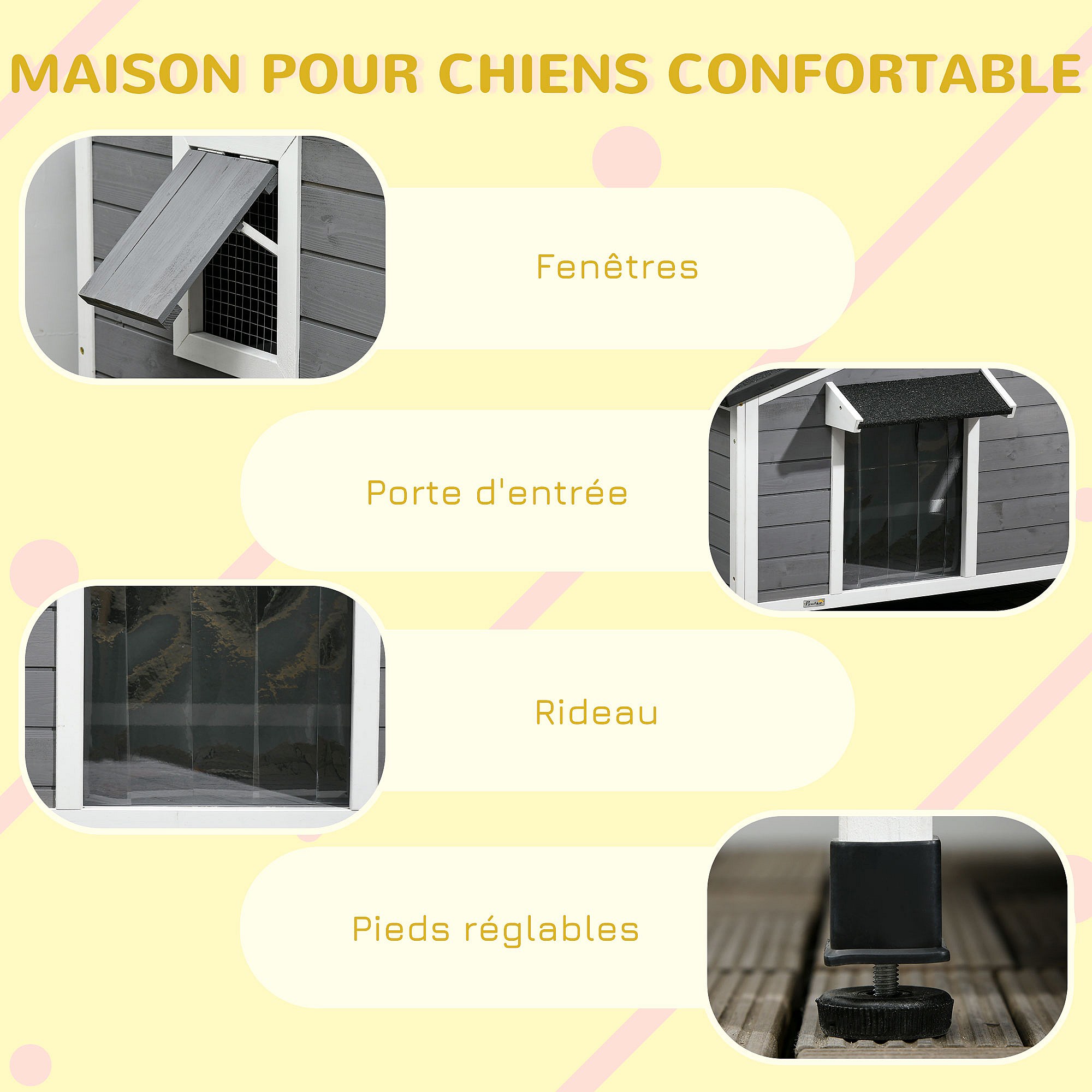 Niche chien style cottage - 2 fenêtres, porte, toit ouvrant bitumé - bois sapin gris