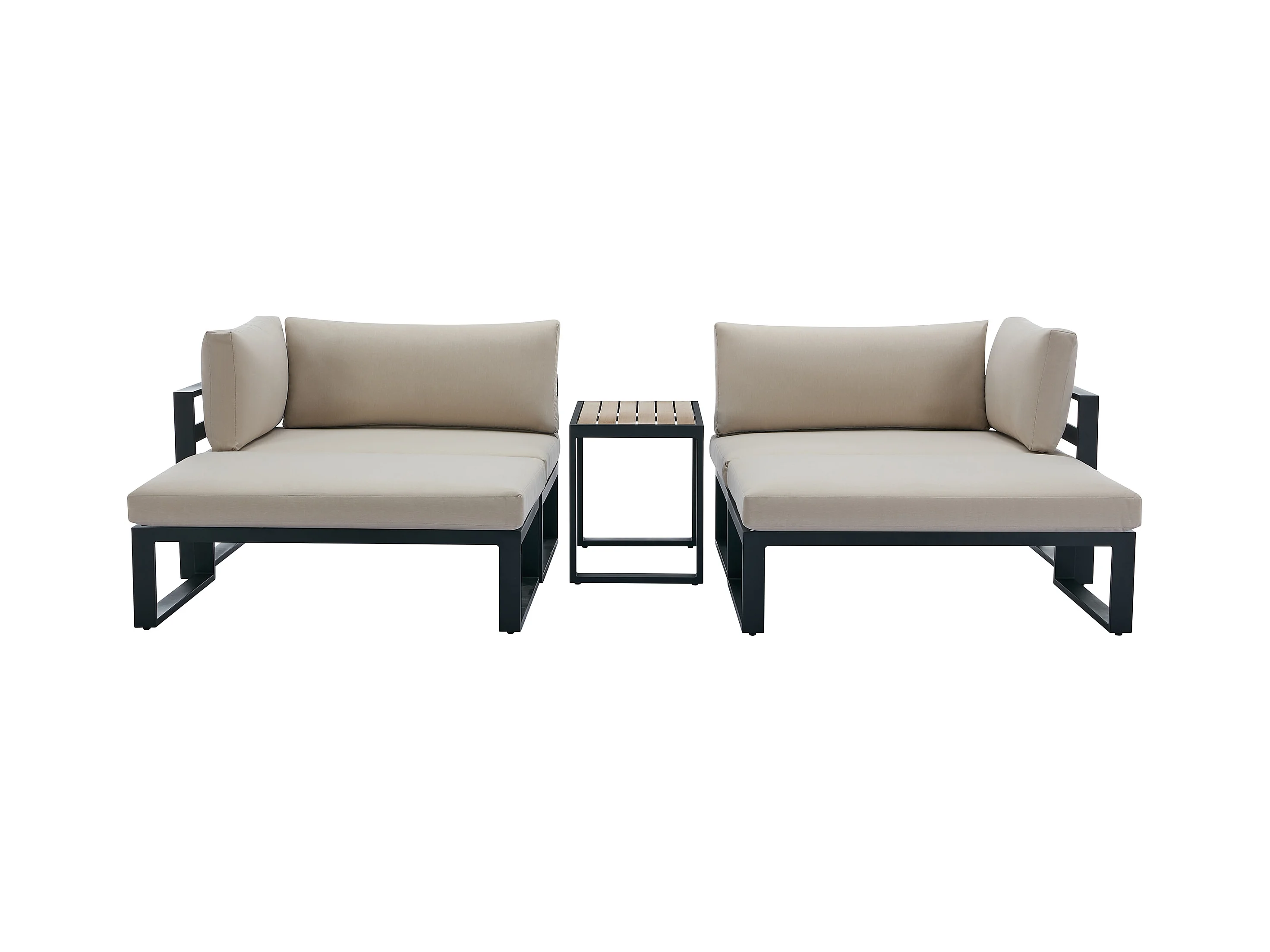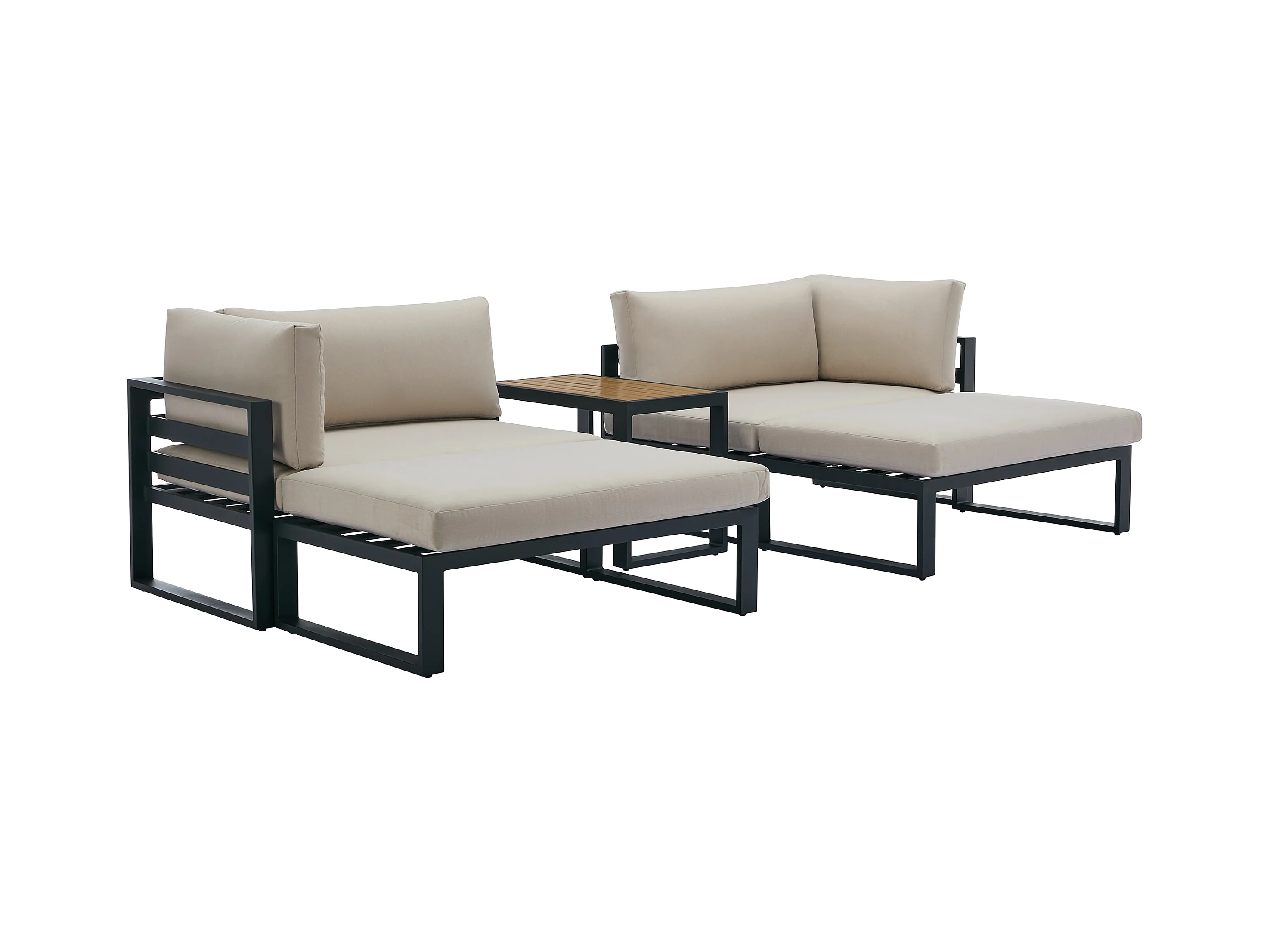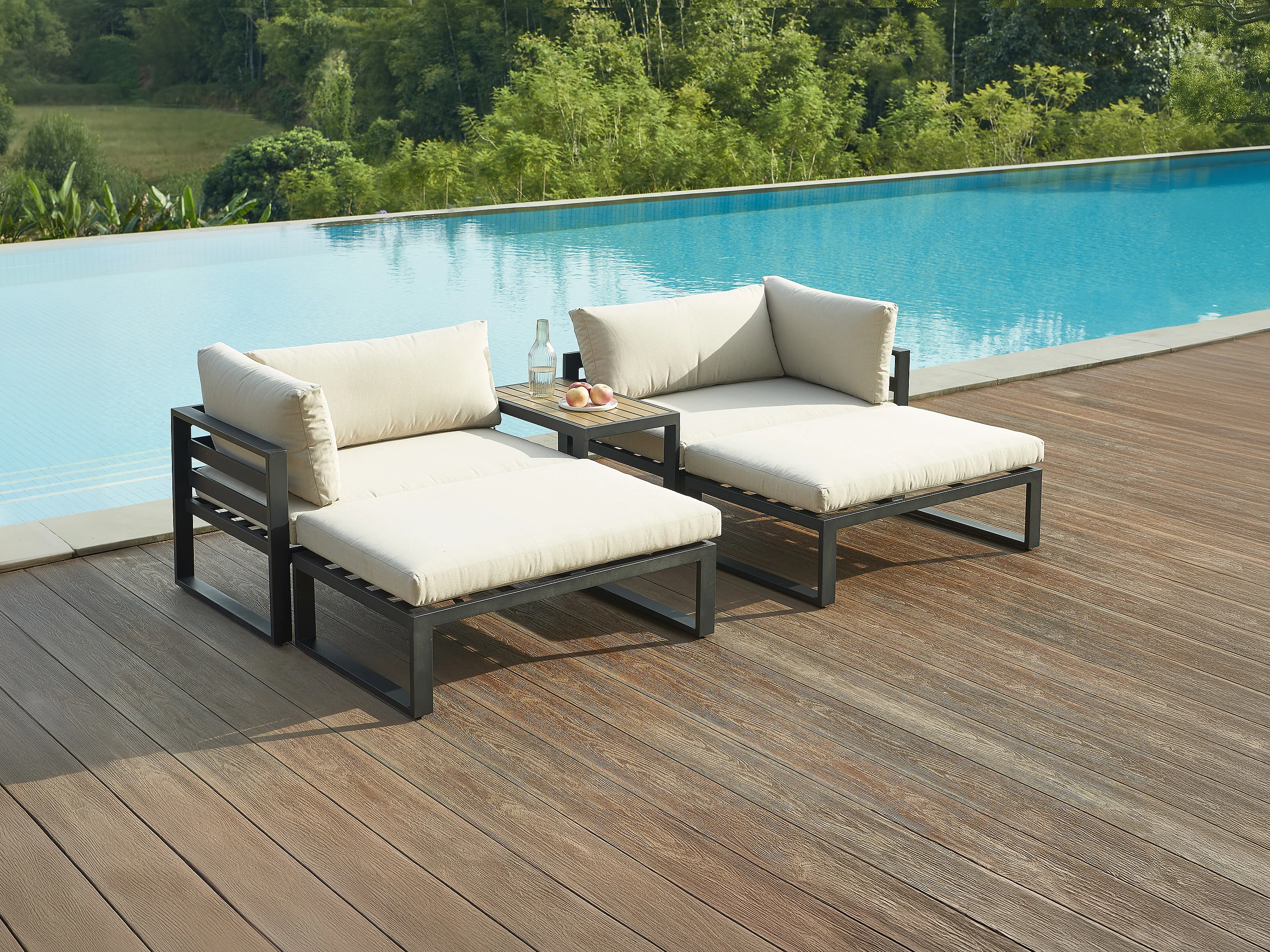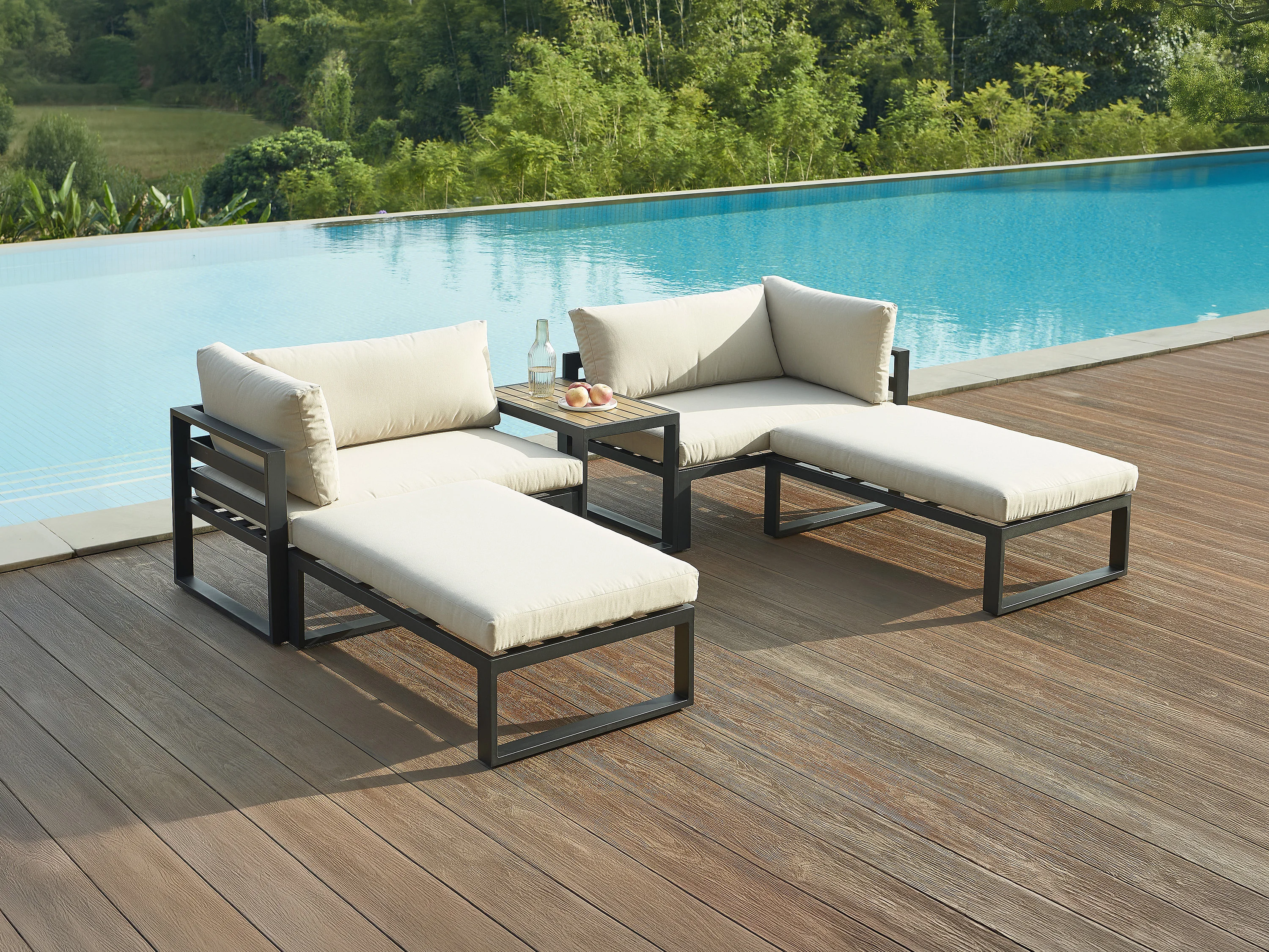 Salon de jardin modulable en aluminium : 2 fauteuils d'angle, 2 poufs et une table basse - Noir avec coussins beige - NOLLAY de MYLIA