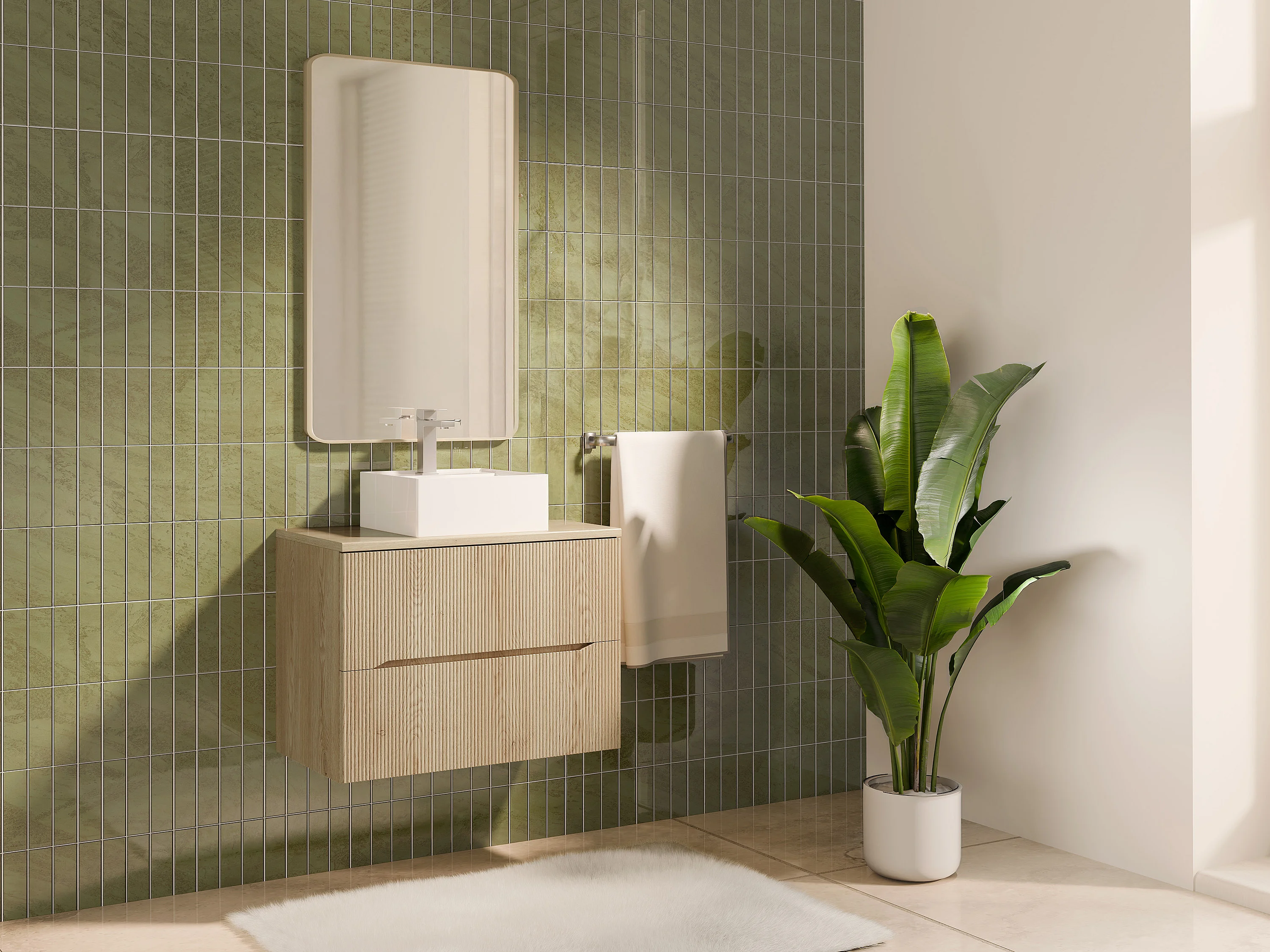 Meuble de salle de bain suspendu strié avec vasque à poser carrée et robinet - Naturel clair - 80 cm - ORISO