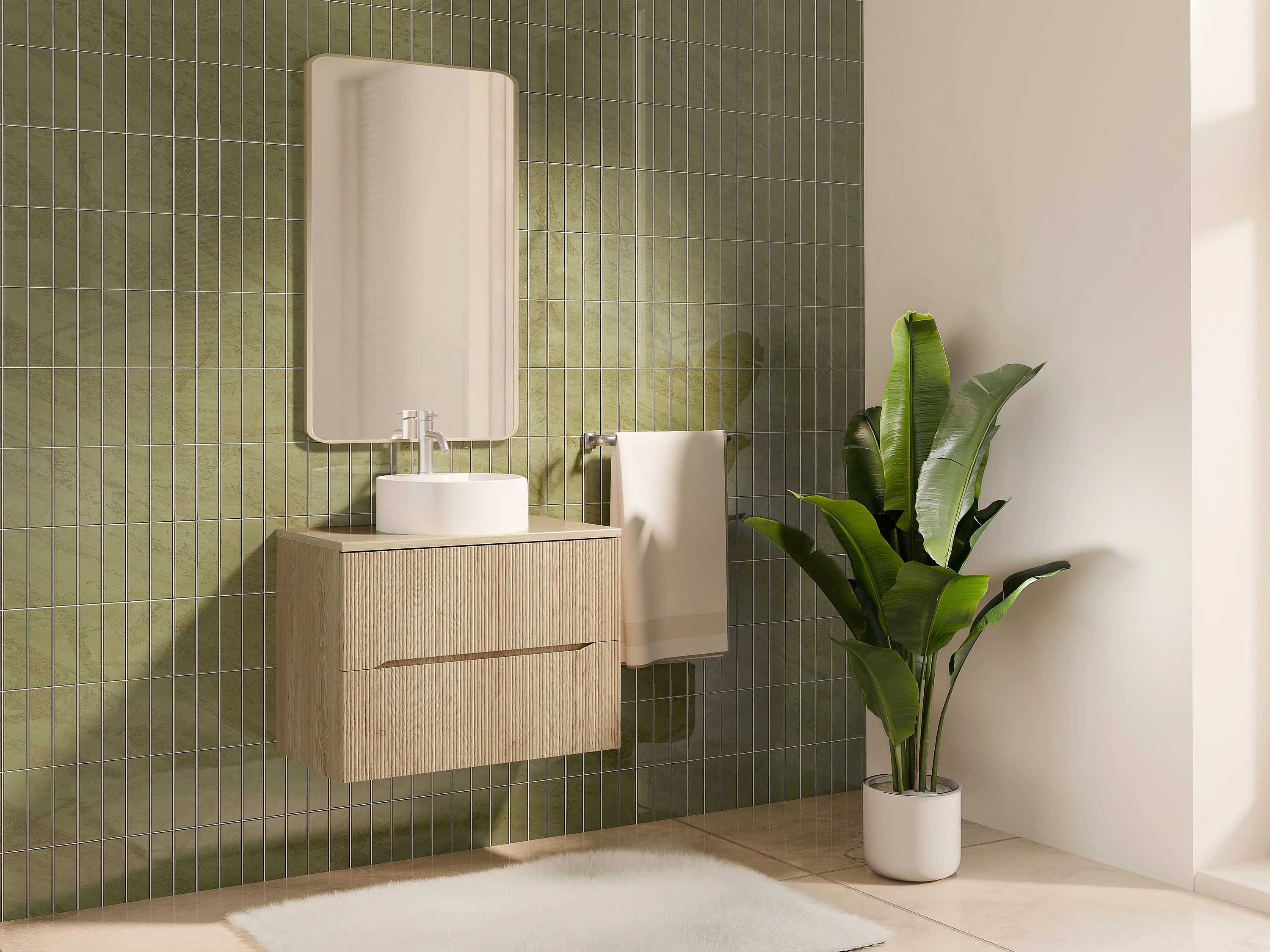 Meuble de salle de bain suspendu strié avec vasque à poser ronde - Naturel clair - 80 cm - ORISO