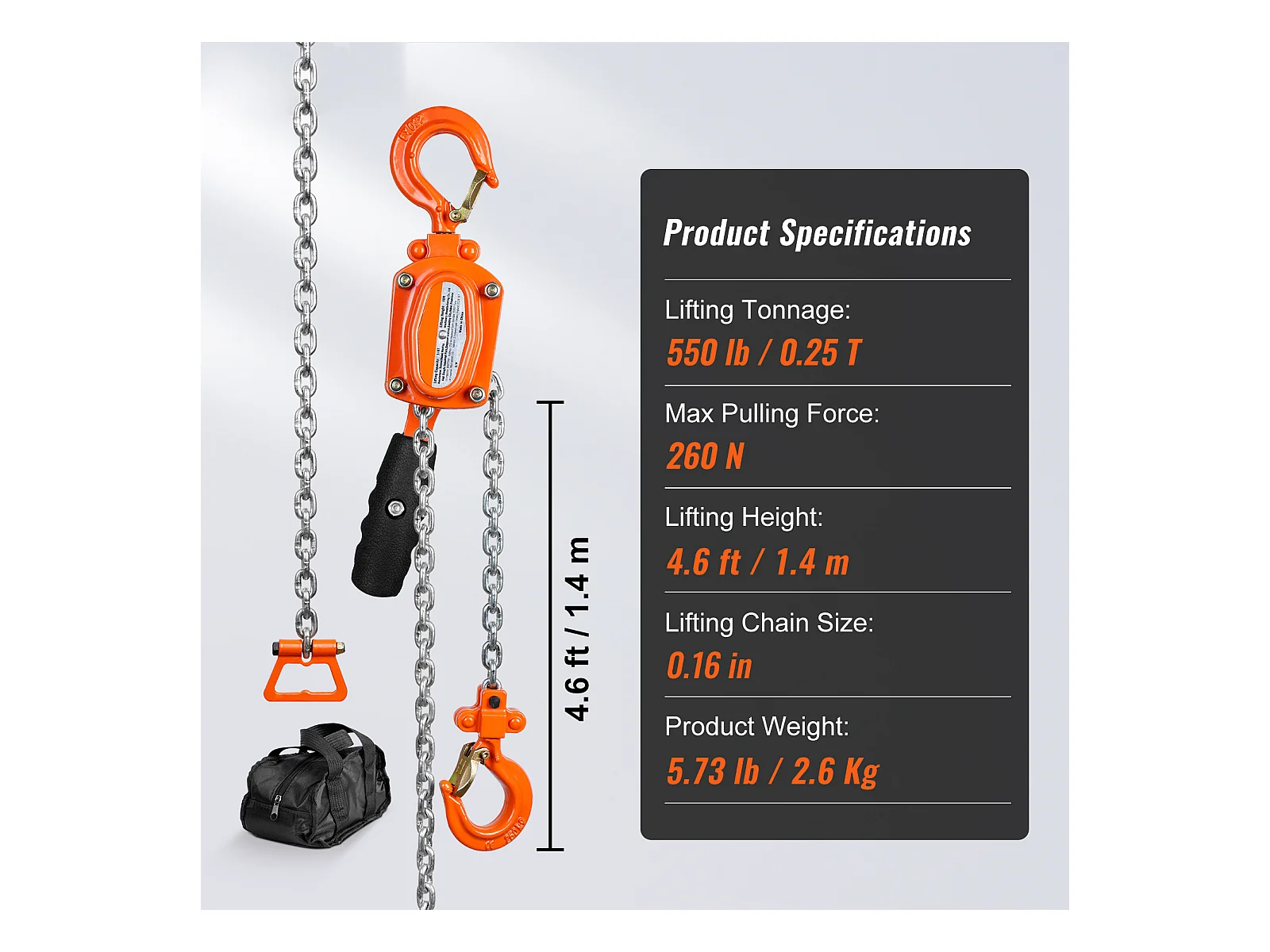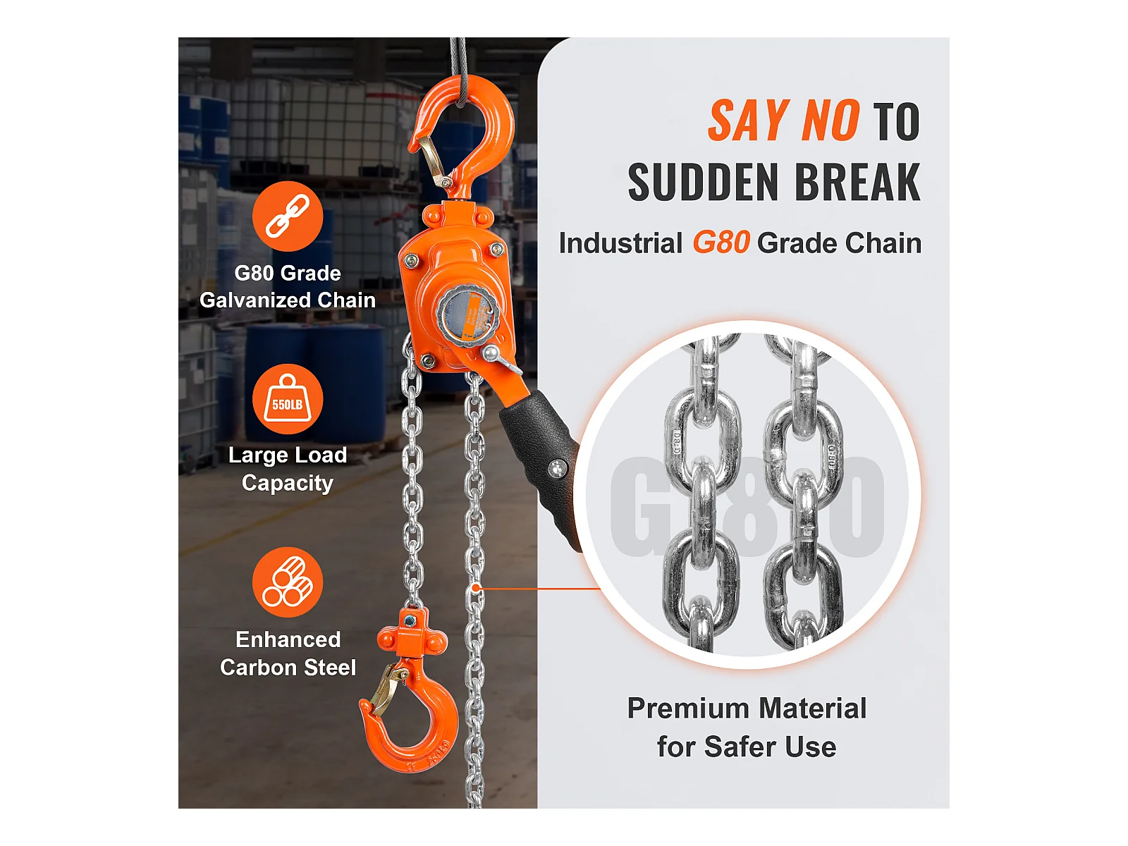 Palan à Chaîne à Levier SucceBuy, Capacité de 249 kg, 152,4 cm, Cliquet G80, pour Chantiers de Construction, Quais et Entrepôts