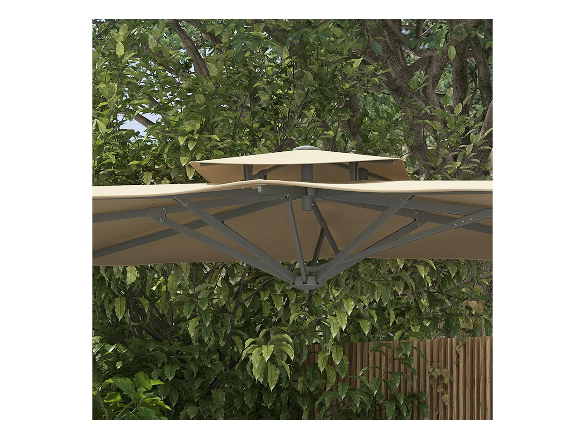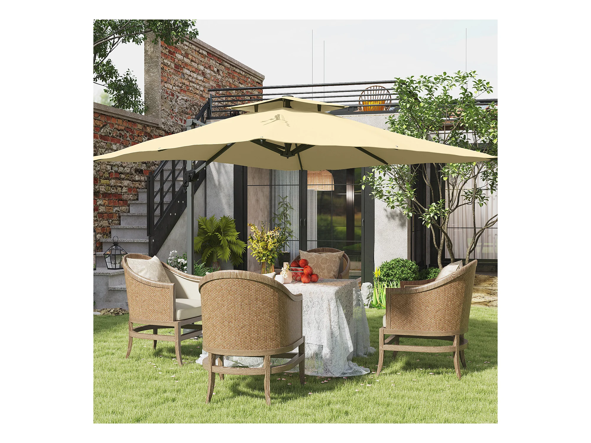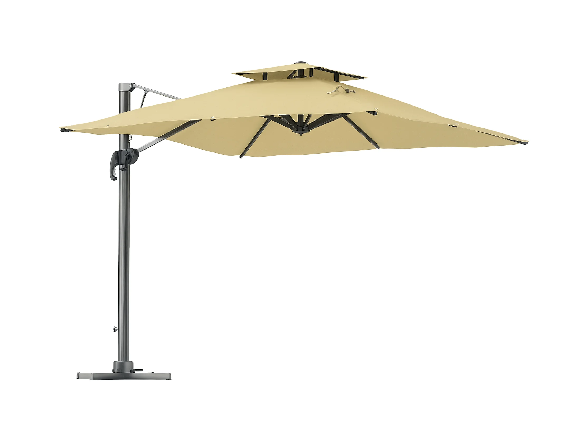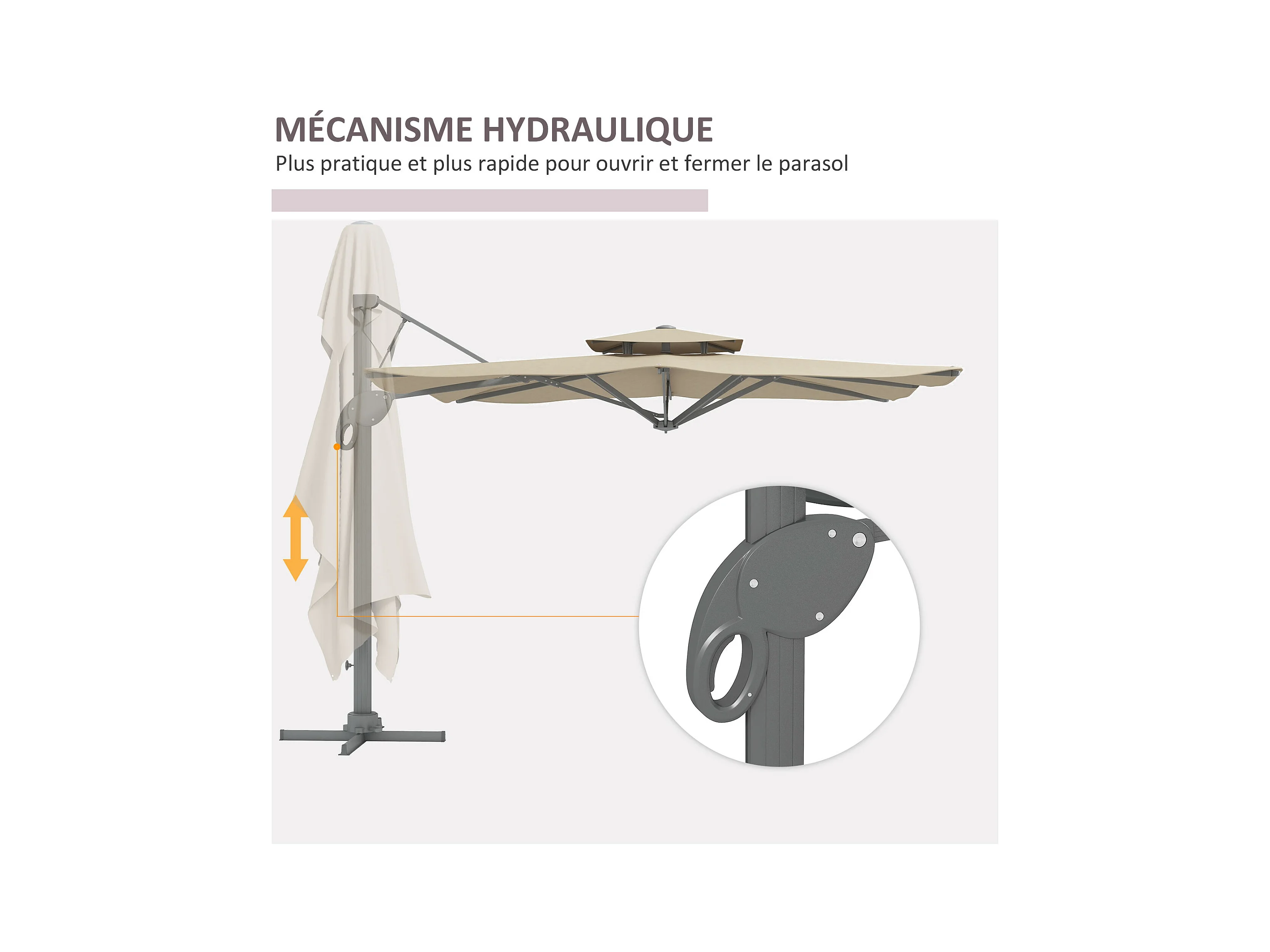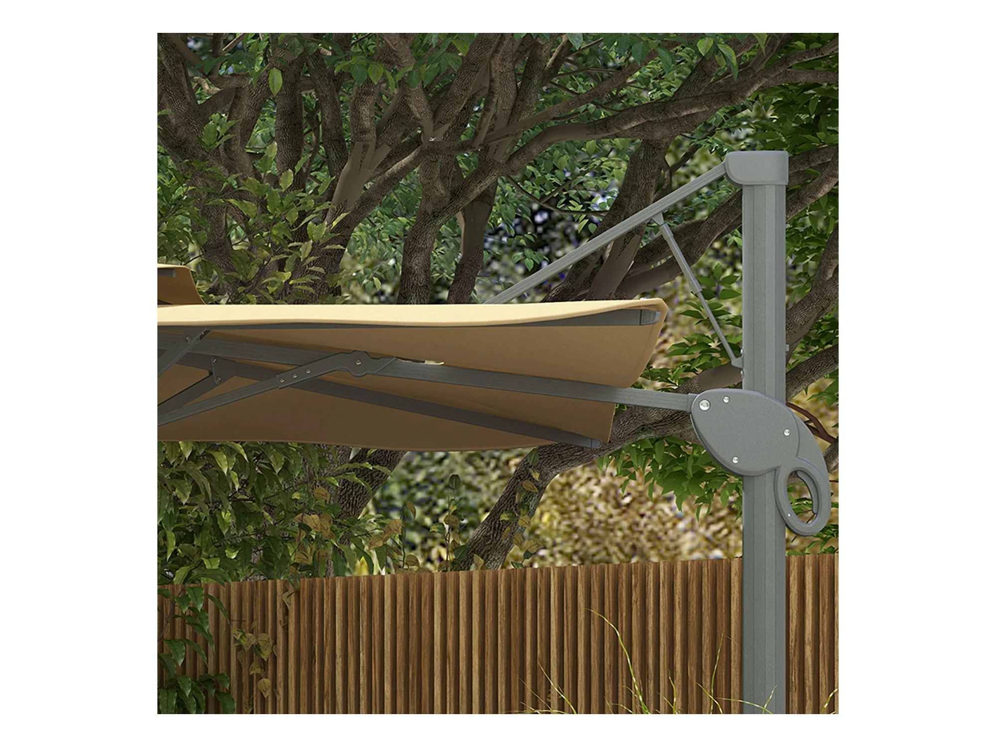 Parasol déporté LED carré double toit inclinable pivotant 360° manivelle piètement acier dim. 3L x 3l x 2,66H m beige