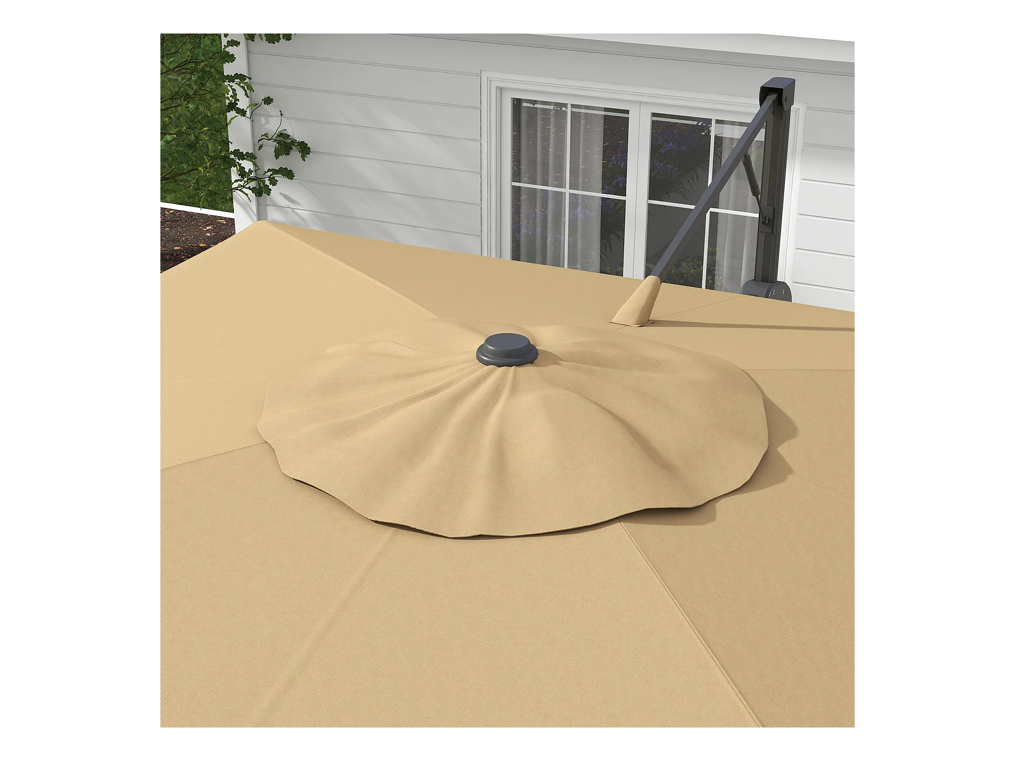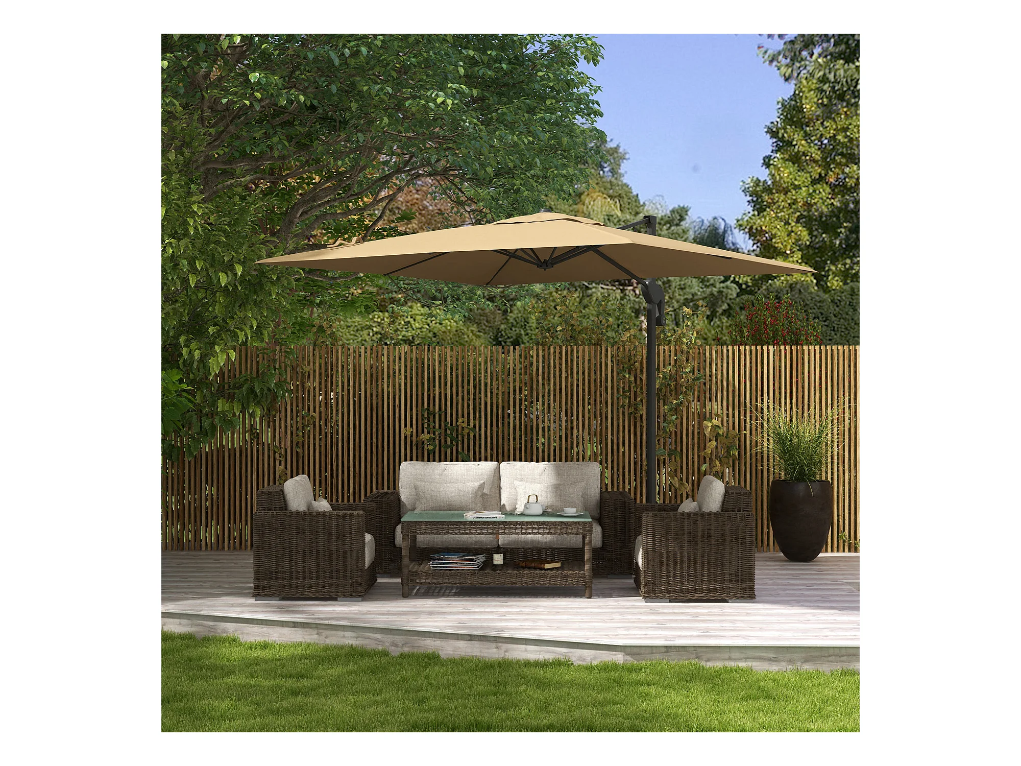 Parasol déporté LED carré double toit inclinable pivotant 360° manivelle piètement acier dim. 3L x 3l x 2,66H m beige