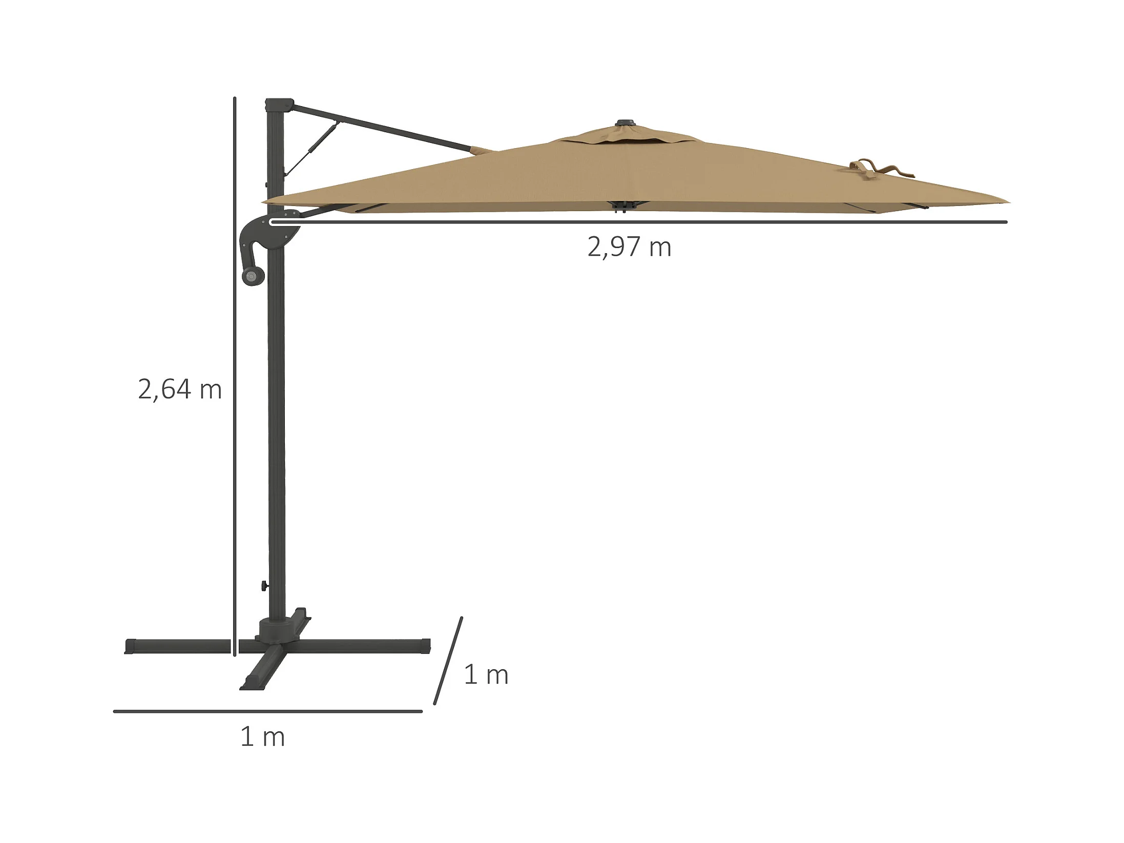 Parasol déporté carré pivotant 360° manivelle dim. 2,97L x 2,97l x 2,64H m alu. polyester kaki