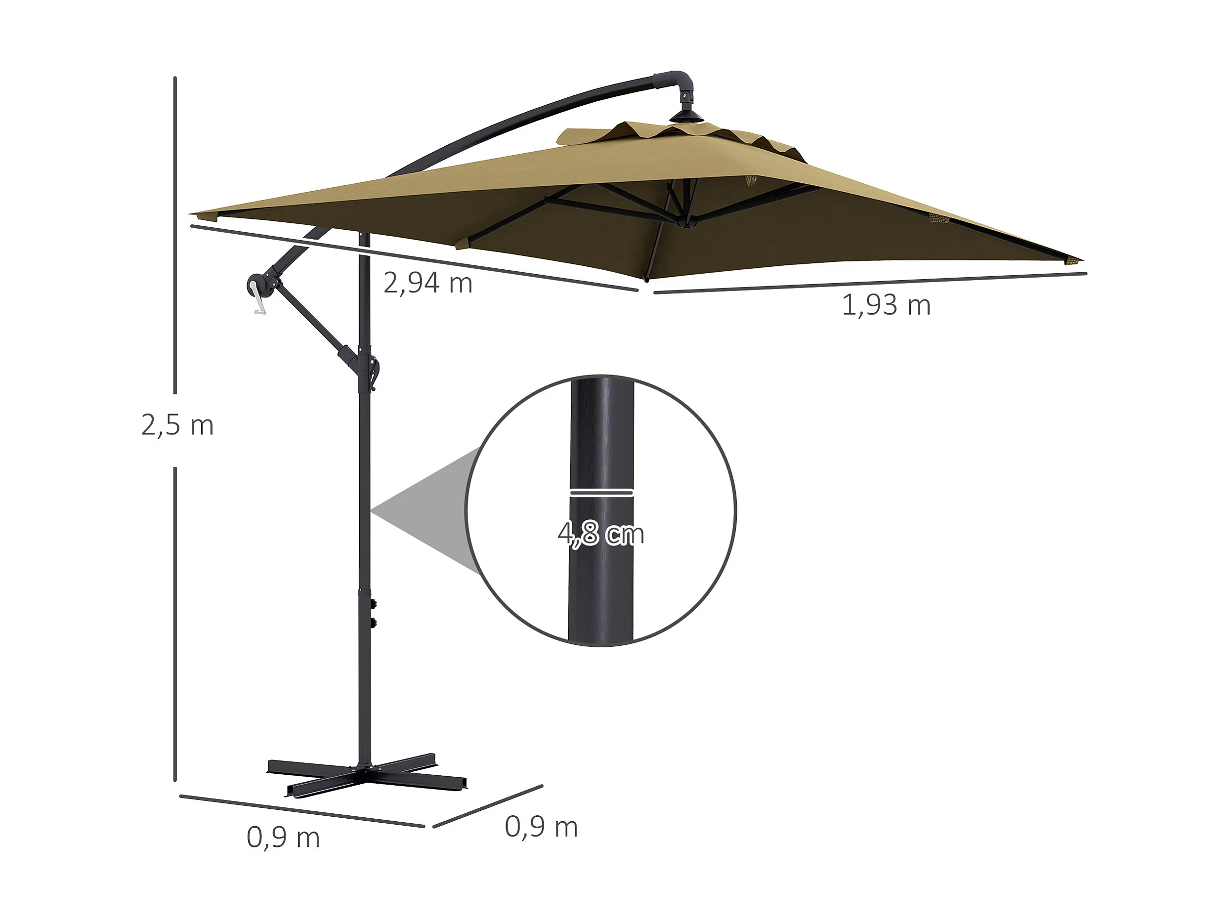 Parasol déporté rectangulaire dim. 294L x 193l x 250H cm pied en croix kaki