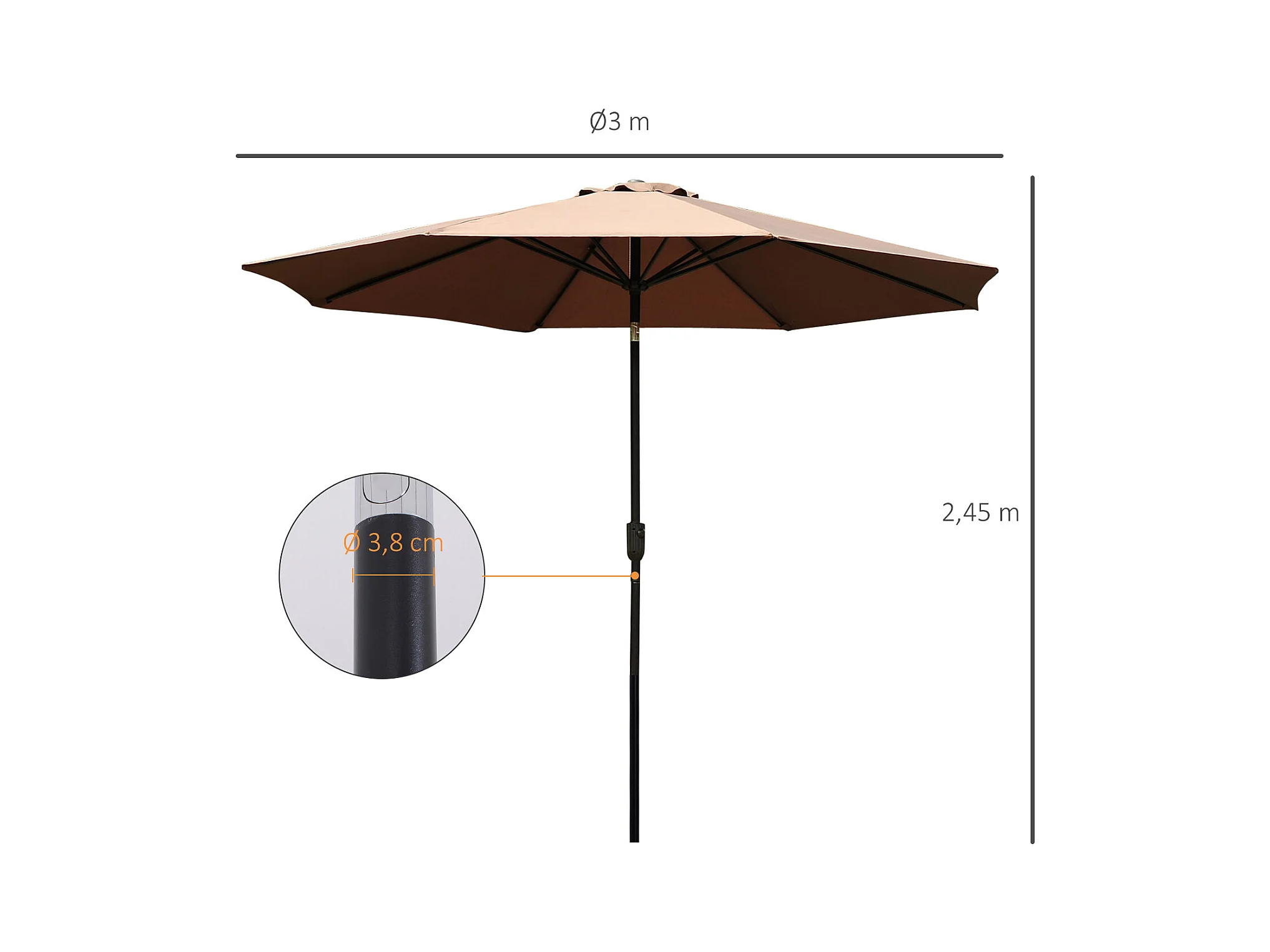 Parasol en métal rond polyester 180g/m² manivelle inclinable Ø 3 x 2,45 m chocolat
