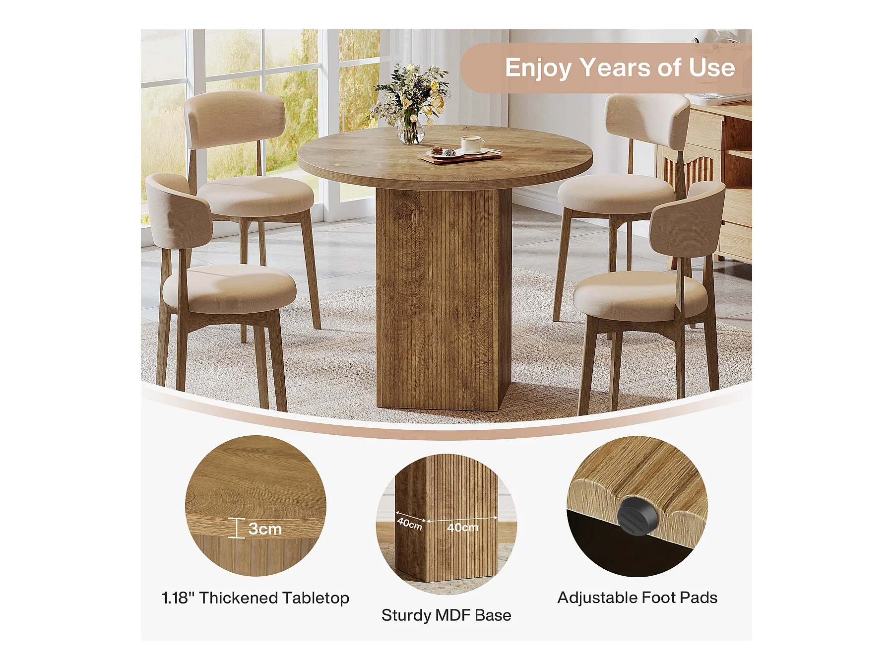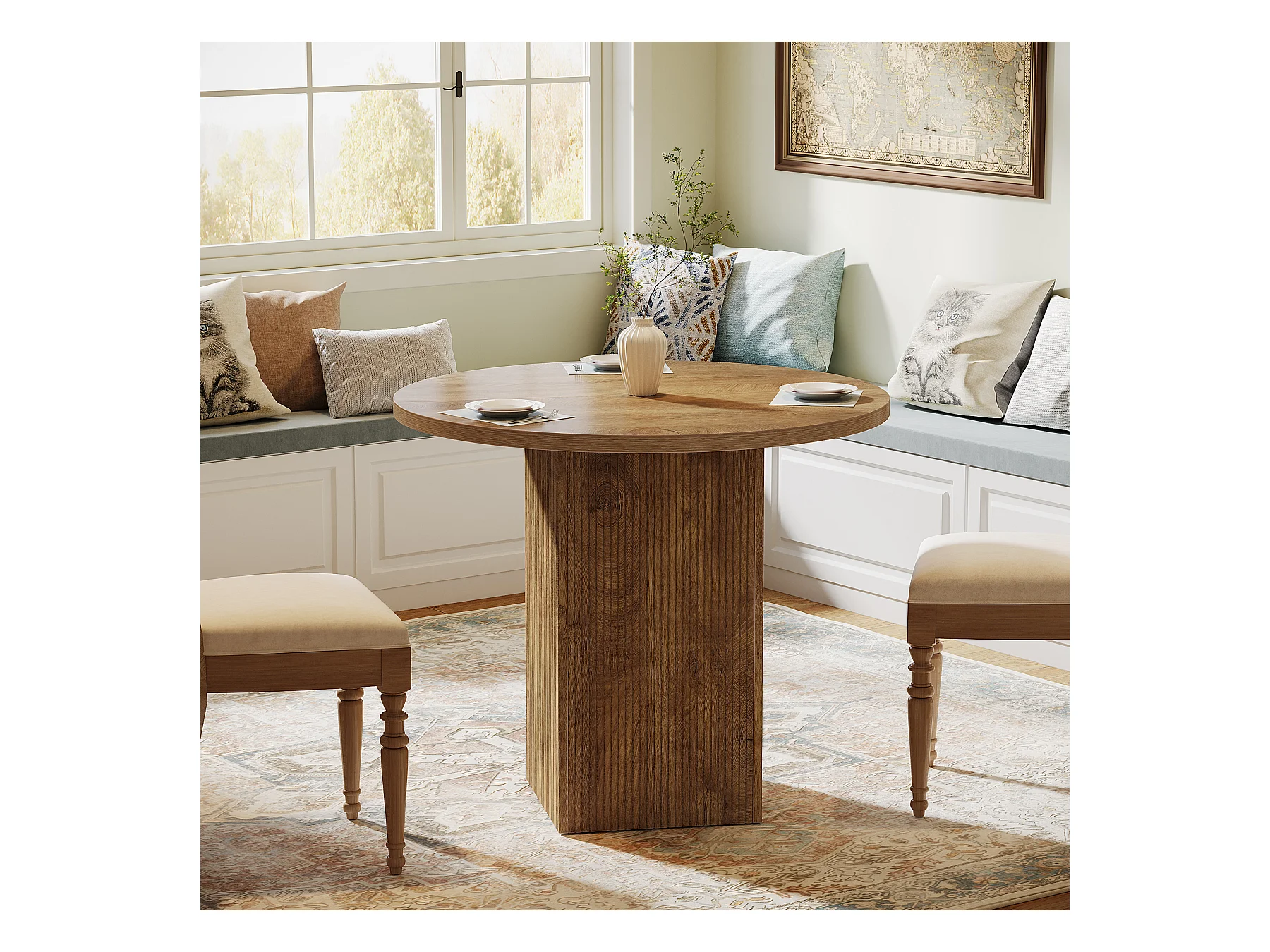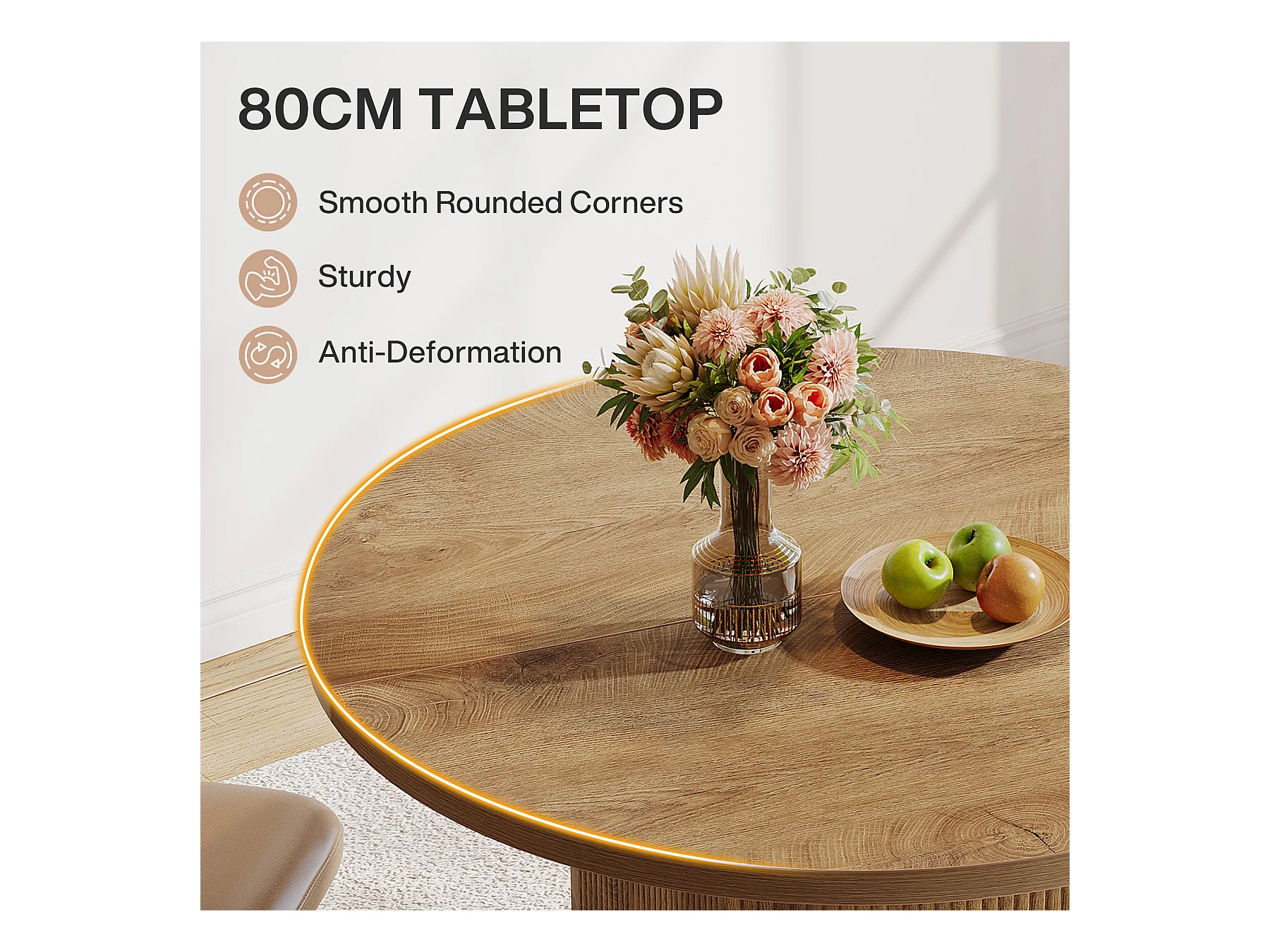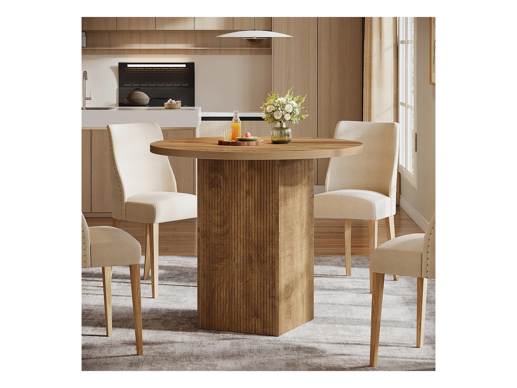 Petite table à manger ronde pour 2 personnes, 80 cm, avec piédestal cannelé en bois, idéale pour petits espaces, salle à manger, cuisine, appartement, marron