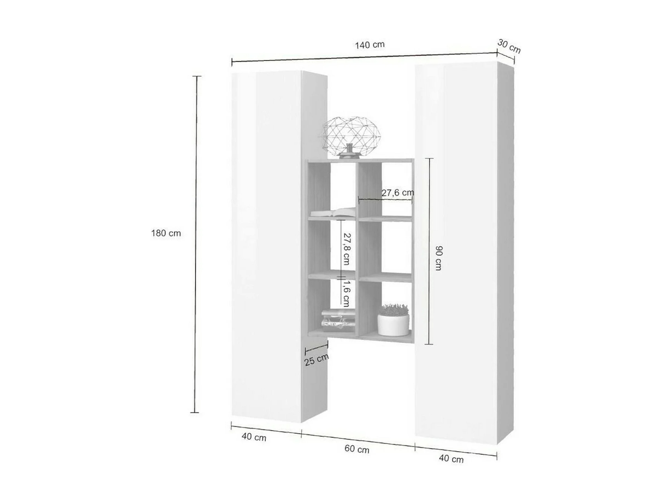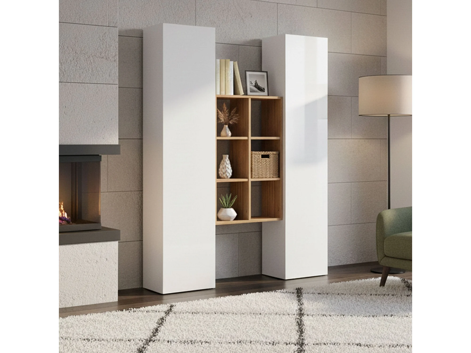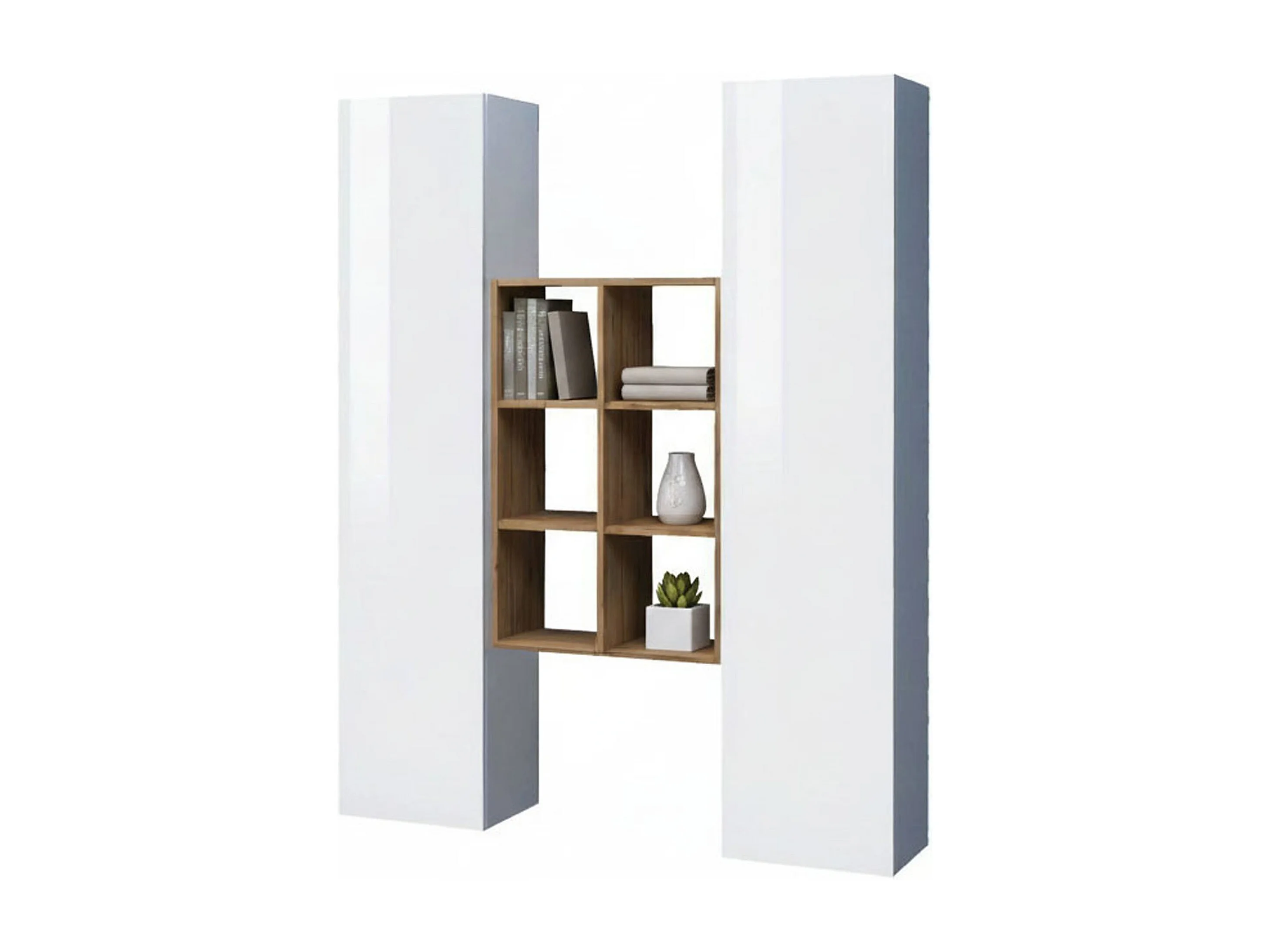 Buffet Ddeluc, Ensemble de salon avec 2 portes et étagères, Buffet de salon, Buffet de cuisine, 100% Made in Italy, 140x30h180 cm, Blanc brillant et Érable