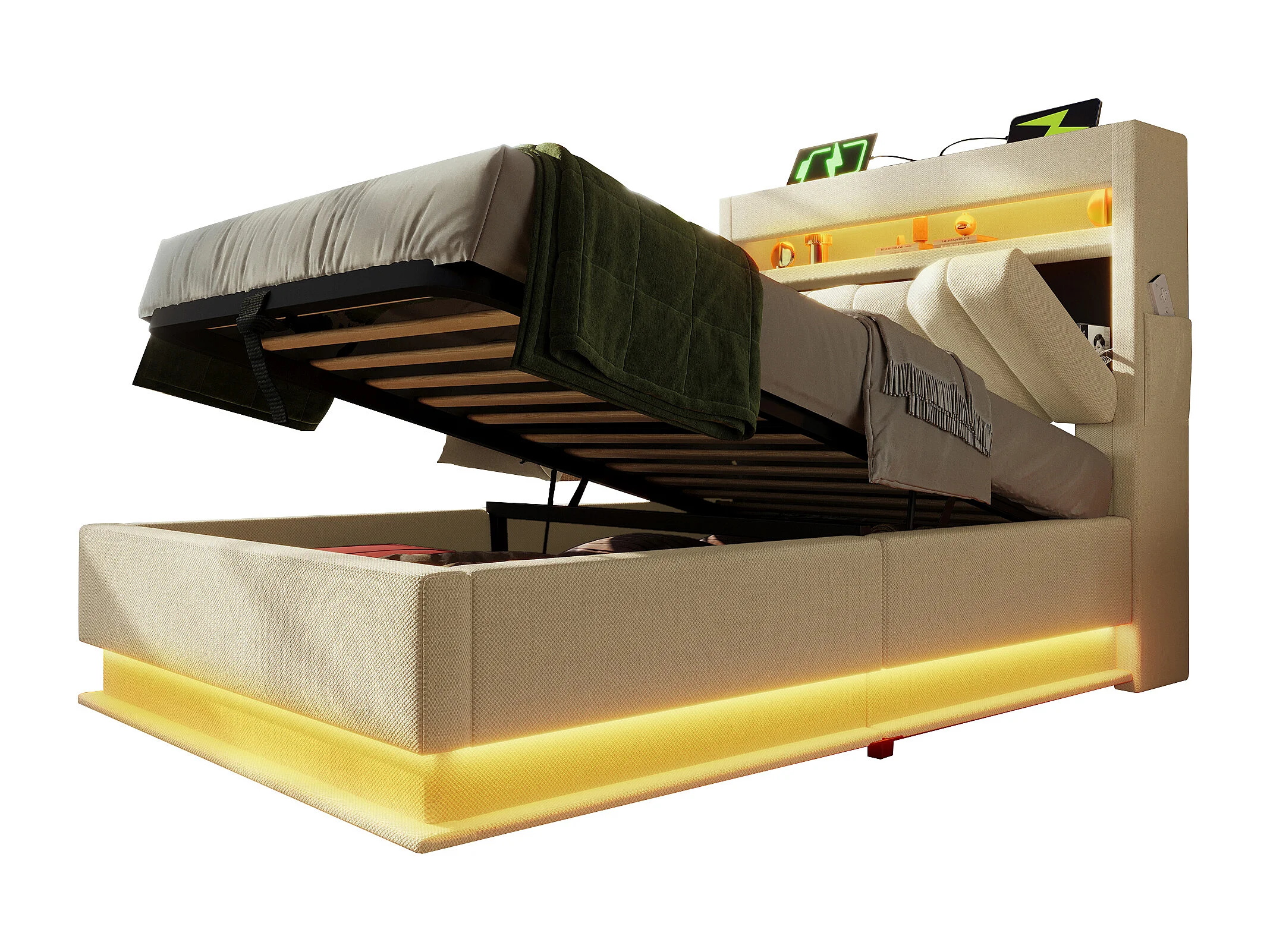 Polsterbett Einzelbett 90×200cm : Tête rangement + USB/Typ-C, LED au tête/pied, rangement hydraulique, beige, velours lin (sans matelas)