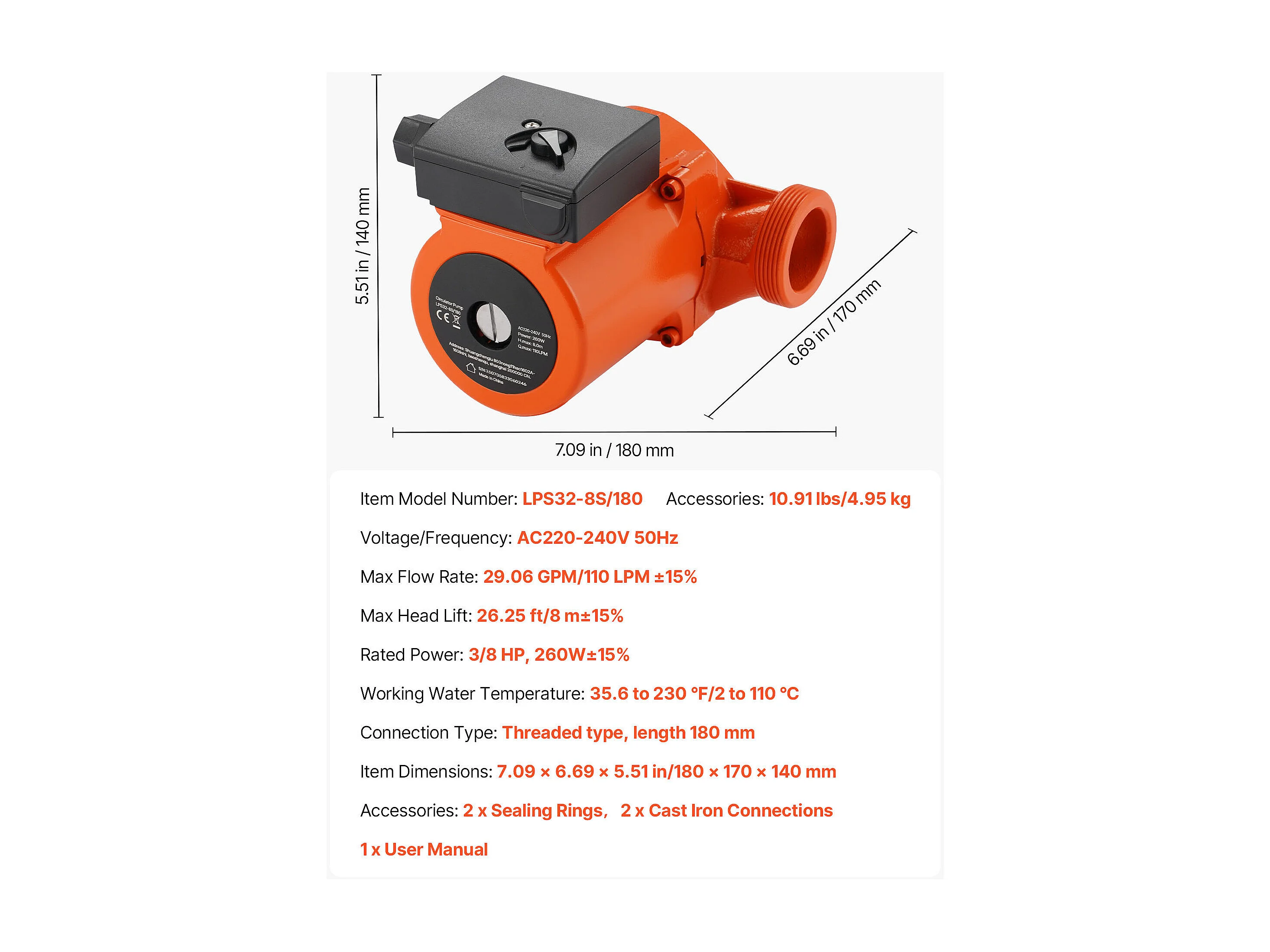 Pompe de Circulation SucceBuy d'Eau Chaude, Hauteur de Refoulement Maximale 4 m, Pompe de Chauffage à Haut Rendement, 42 L/min, Clapet Anti-retour