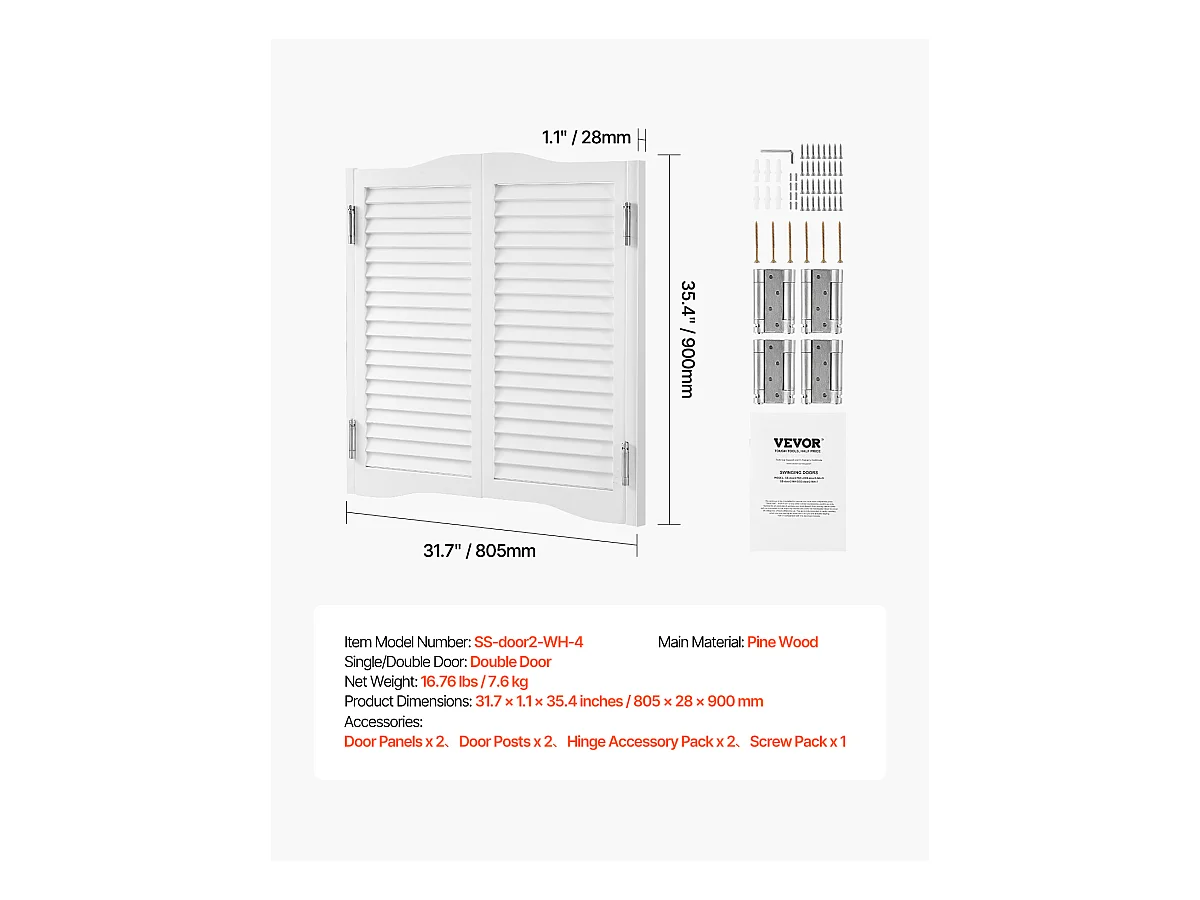 Porte Battante Double SucceBuy, 80,5x2,8x90 cm, Porte Saloon en Bois de Pin avec Charnières, Quincaillerie, Facile à Installer, Blanc