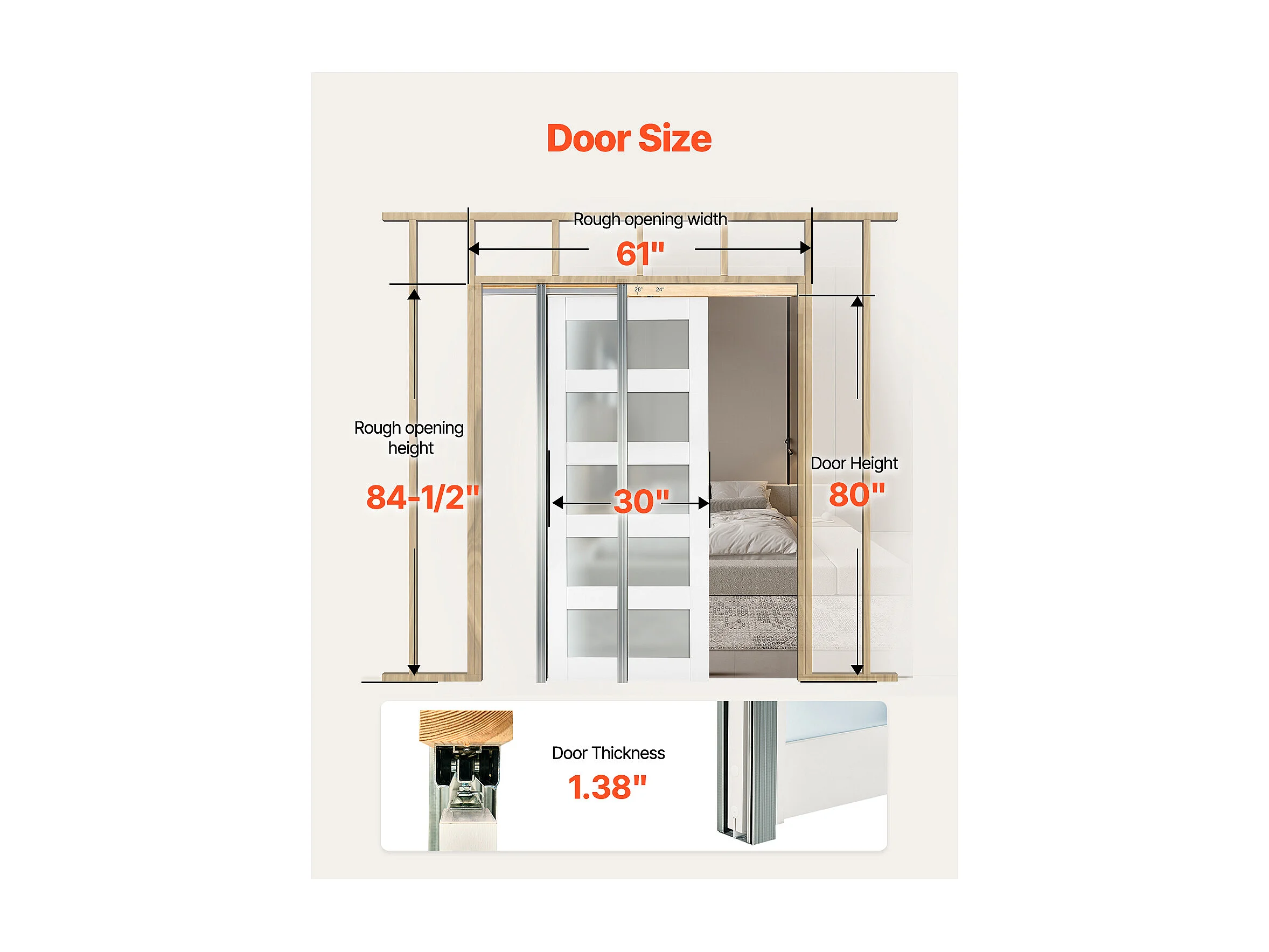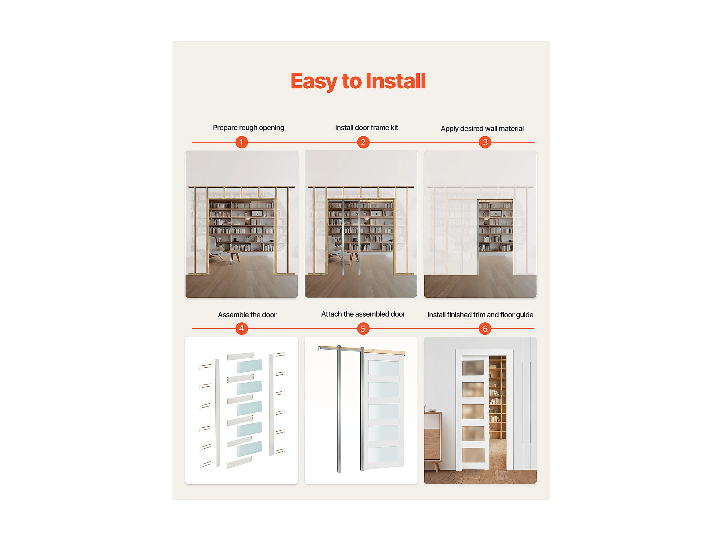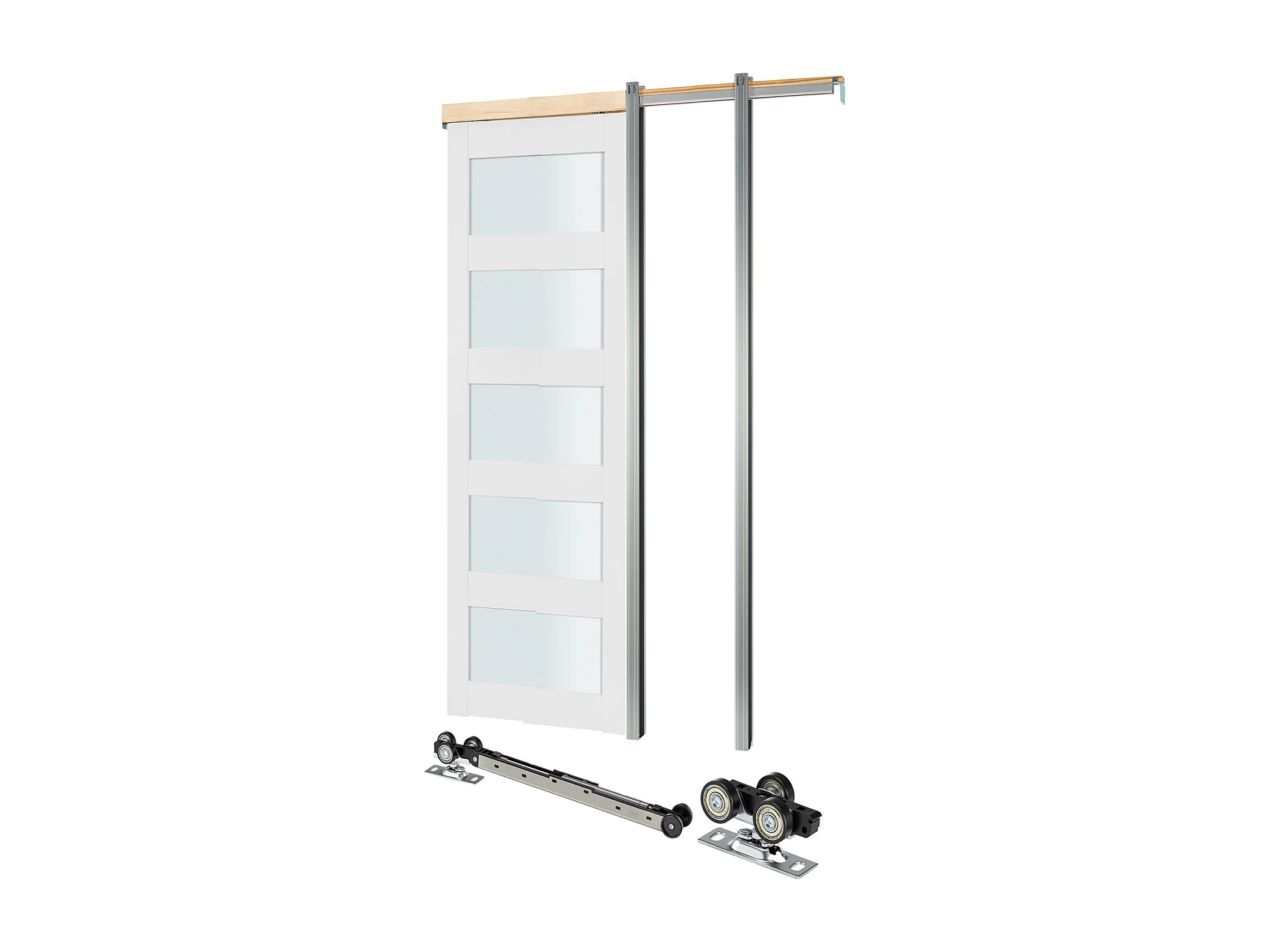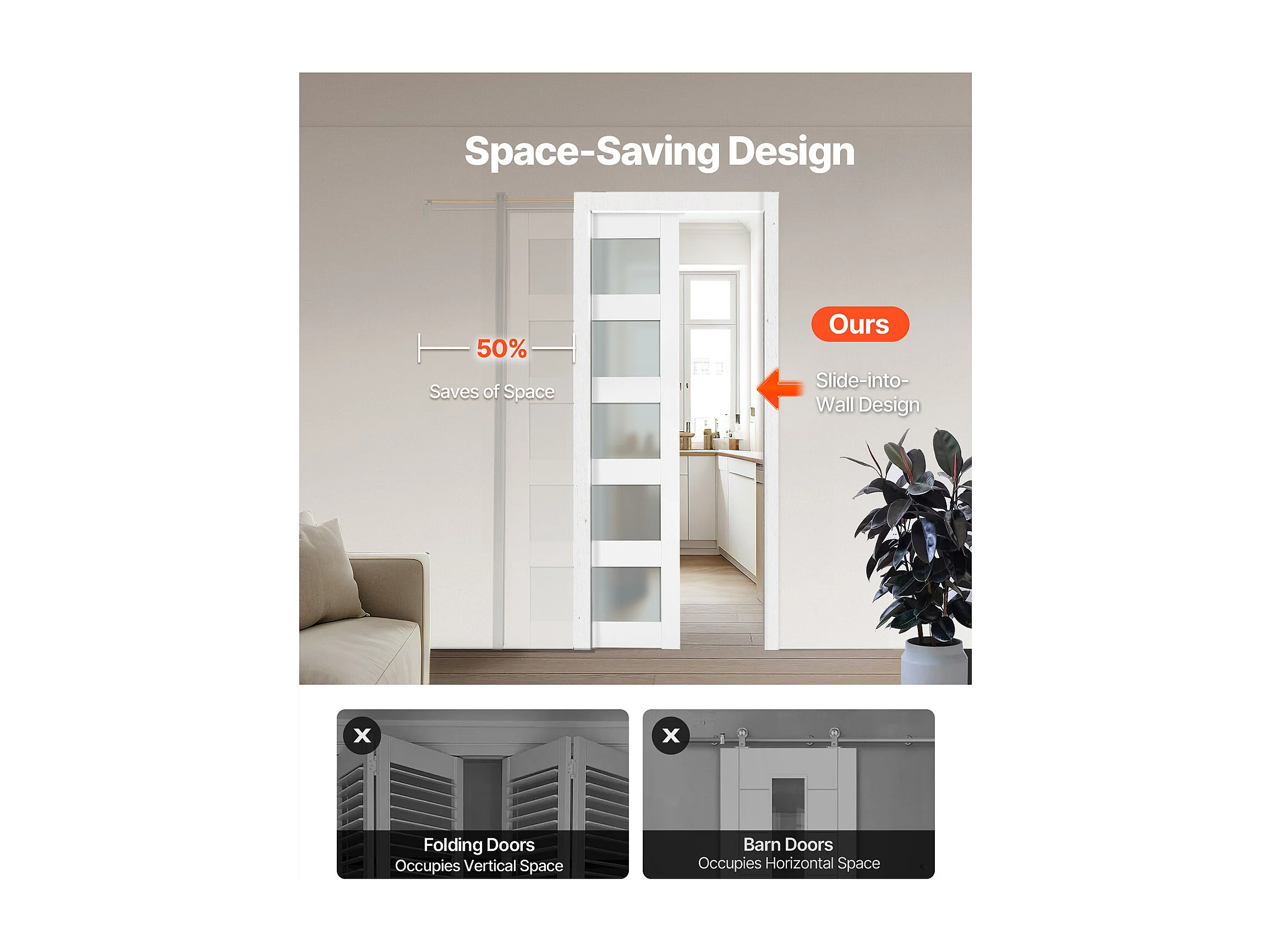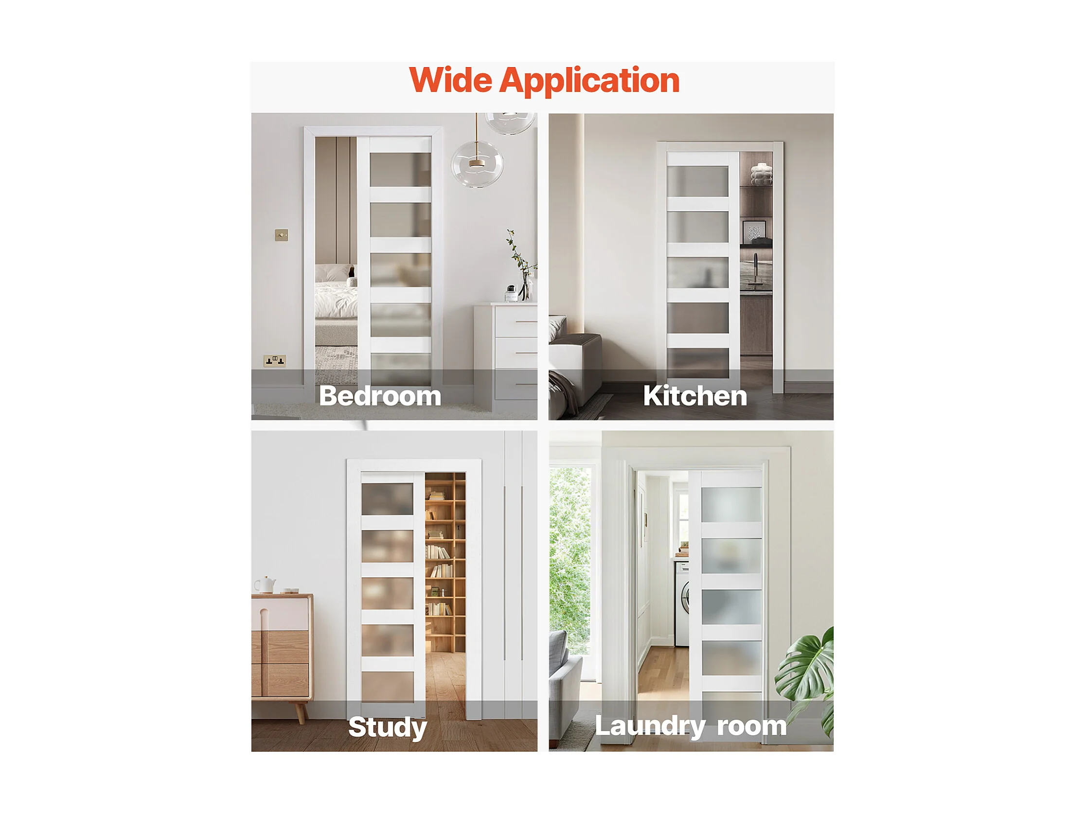 Porte Coulissante Escamotable SucceBuy 203,5x76,5 cm, Simple Porte à Galandage avec 5 Panneaux en Verre Dépoli, Kit de Quincaillerie, Robuste en Bois Massif