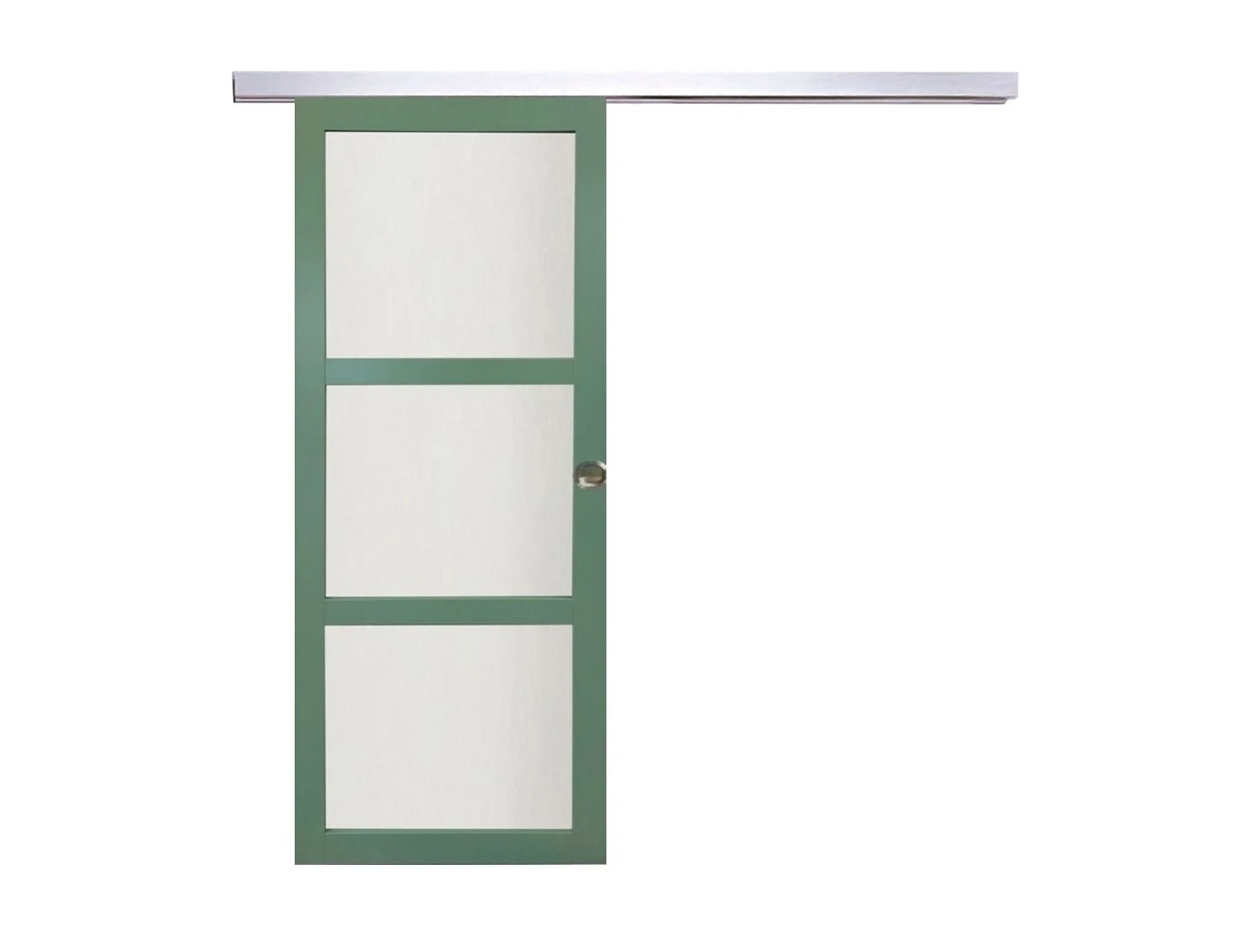 Porte Coulissante Vert Ral 6021 Vitree H204 X L73 + Rail Alu Bandeau Blanc Et Coquilles Gd Menuiseries