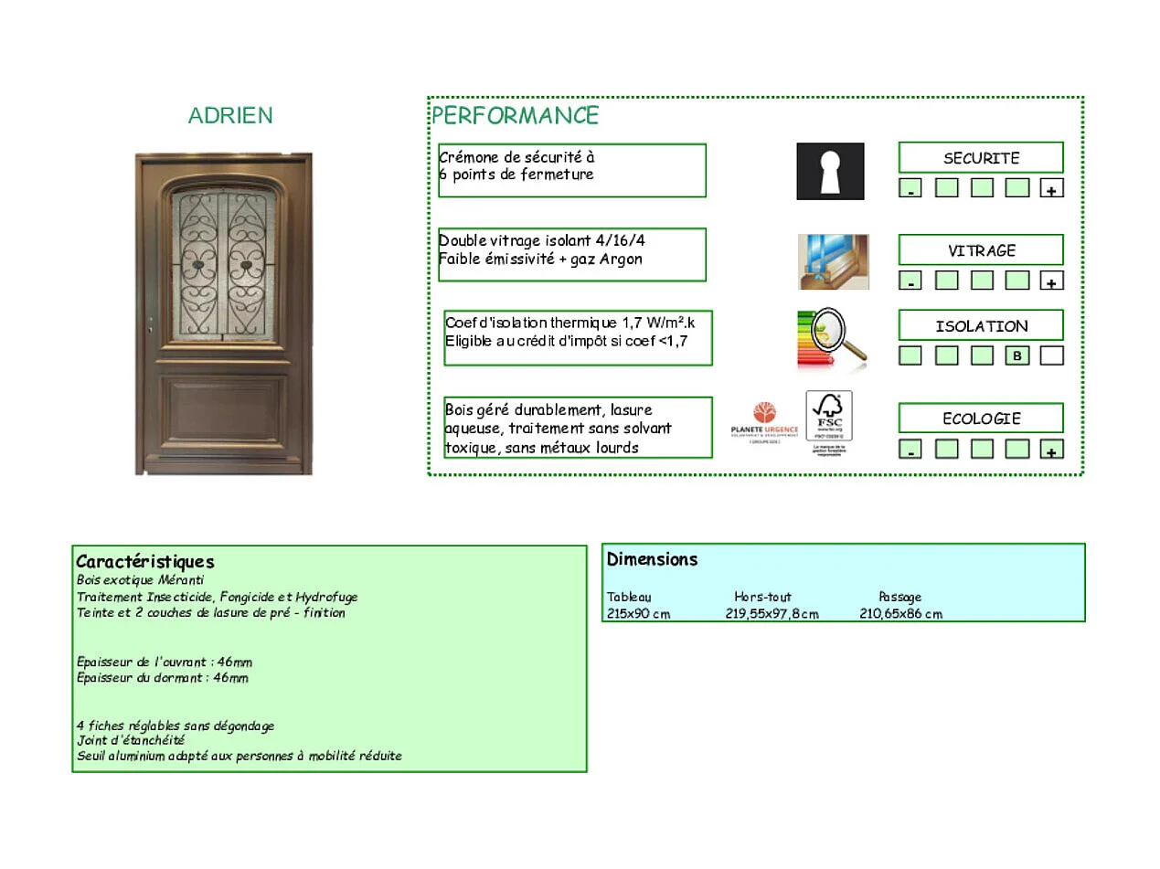 Porte d'entree Bois vitree, Andore Vert RAL 7002, H,215xl,90 p, droit Cotes Tableau