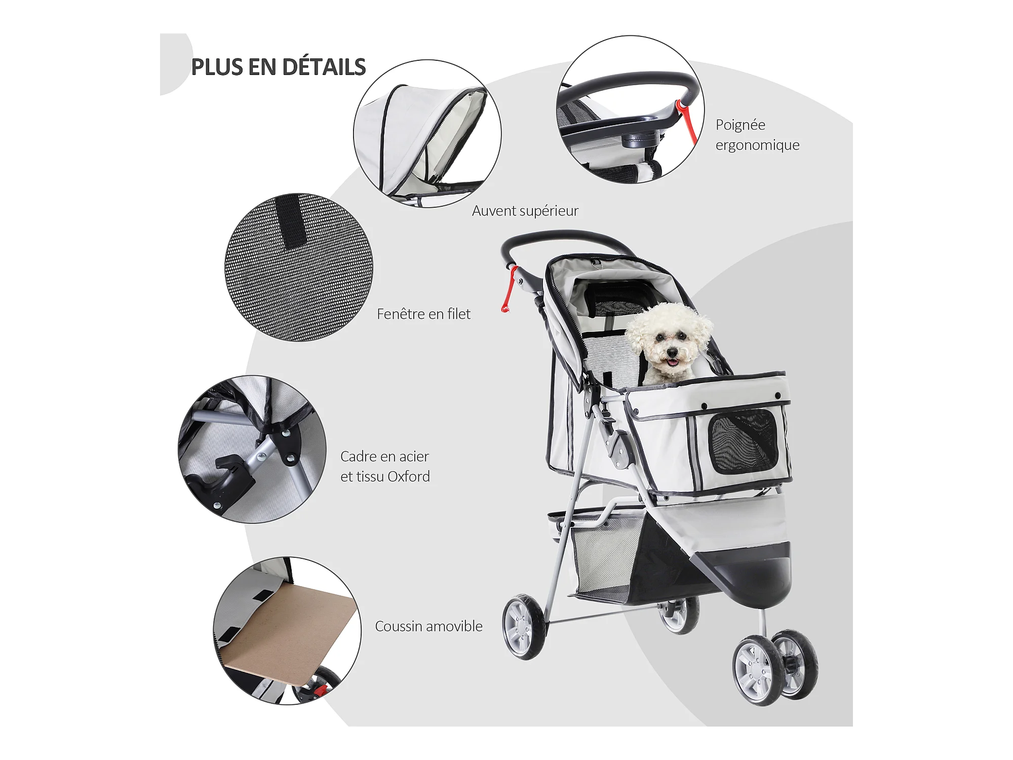Poussette buggy pliable chien chat panier et sac de rangement attaches sécurité housse réglable poignée réglable acier Oxford gris