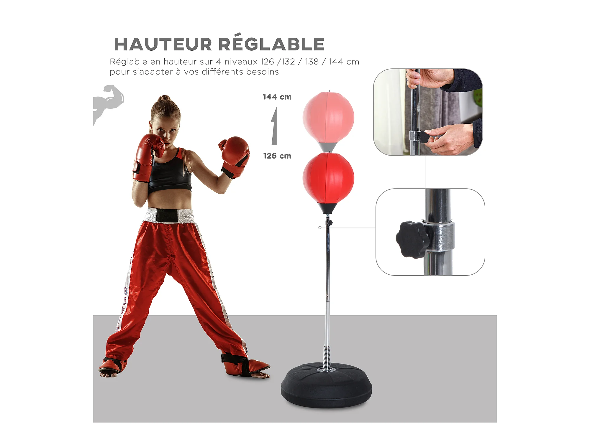 Punching ball sur pied réglable en hauteur 126-144 cm avec gants, pompe et base de lestage rouge