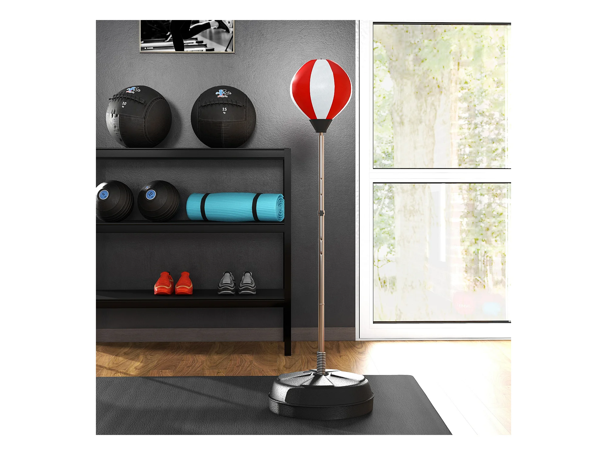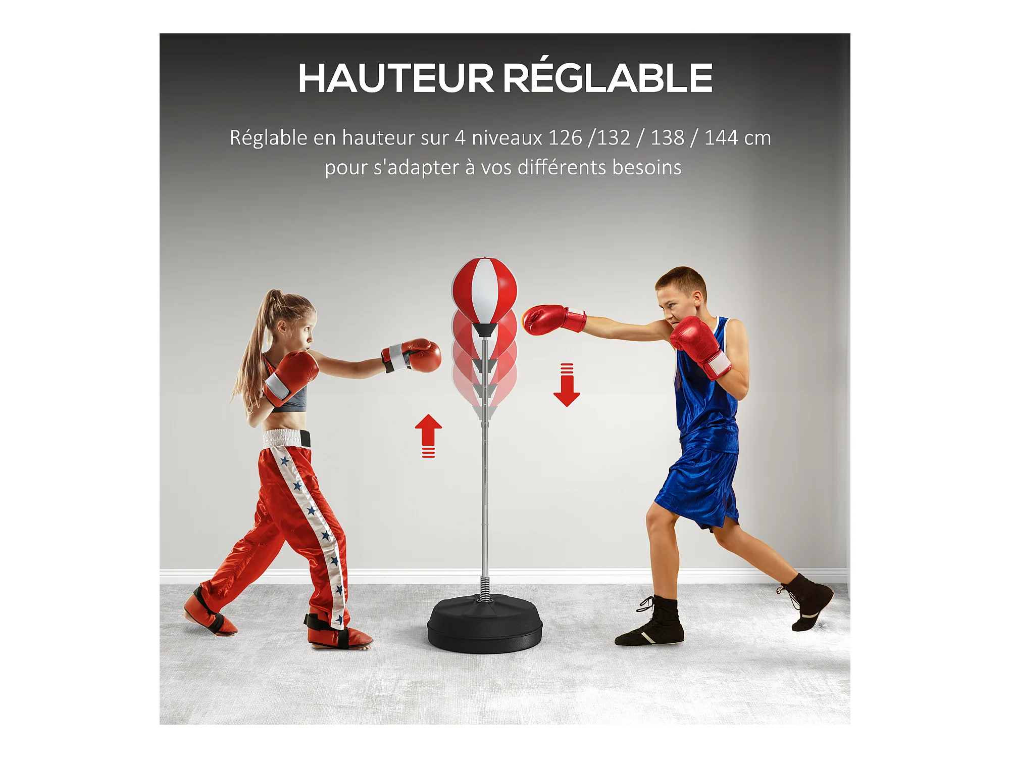 Punching ball sur pied réglable en hauteur 126-144 cm avec gants, pompe et base de lestage rouge blanc