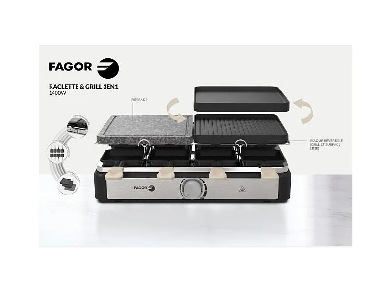 Raclette / Grill - FAGOR - FGRG8 - 8 personnes - Pierre de Cuisson - 1400W - Thermostat réglable